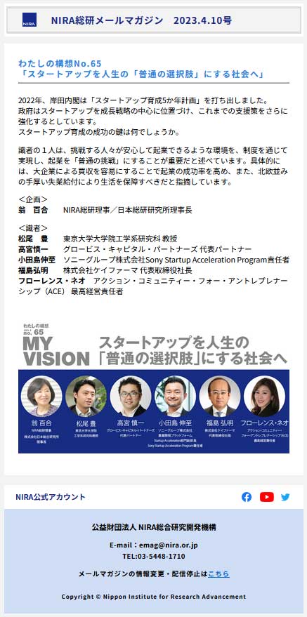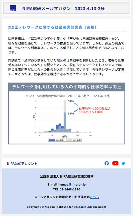 お問い合わせ先公益財団法人NIRA総合研究開発機構 メールマガジン担当TEL: 03-5448-1700 E-mail : emag@nira.or.jp