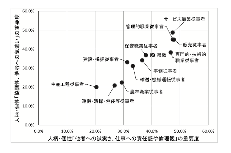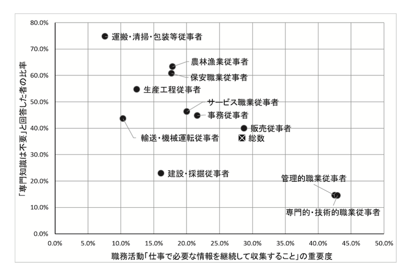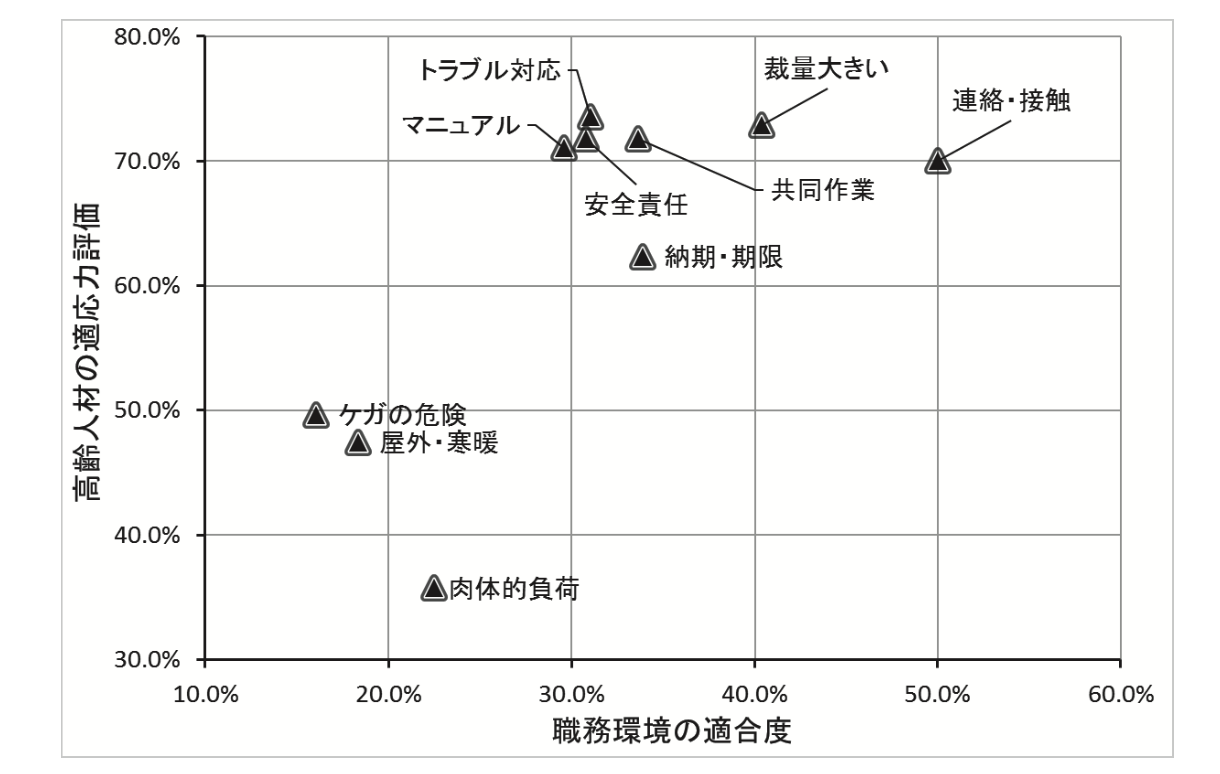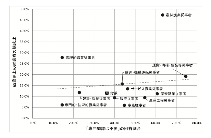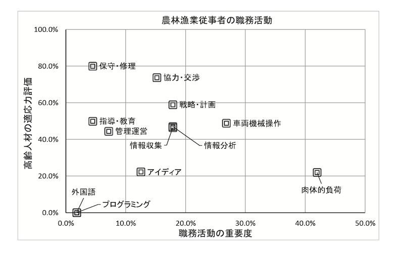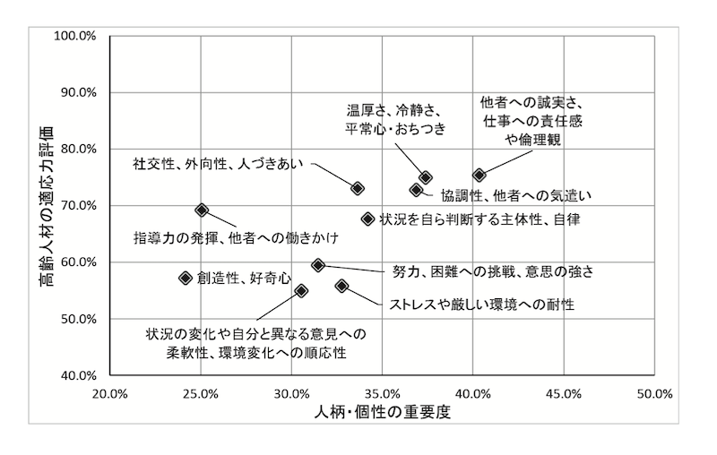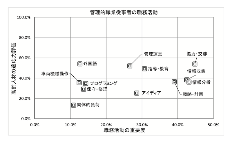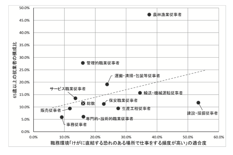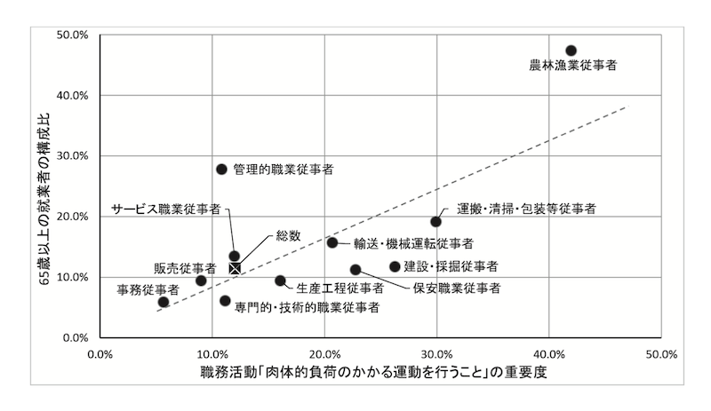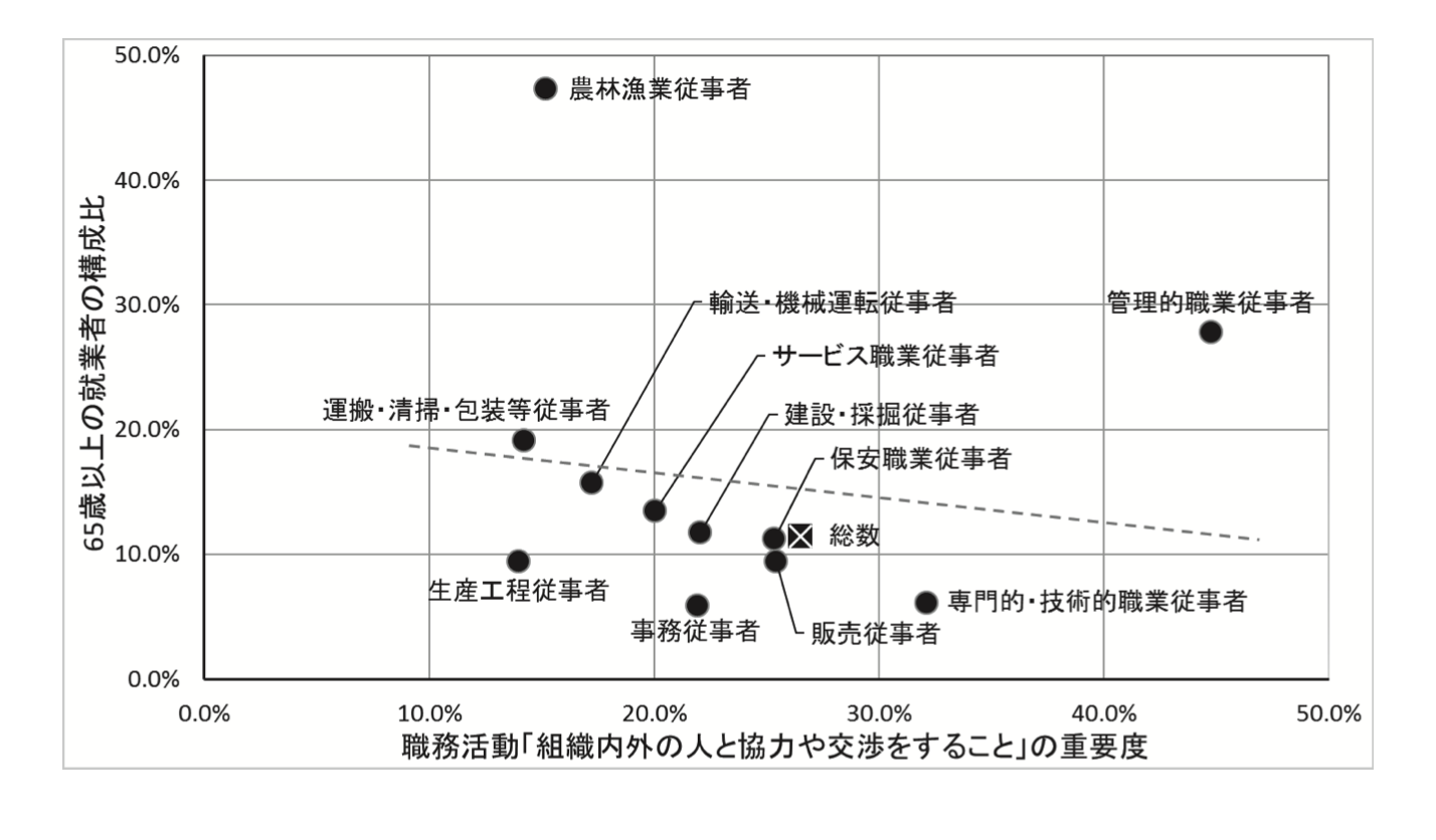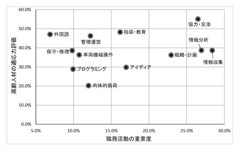 論文NIRAモノグラフシリーズNo.40 2016.08.01 職業特性と高齢者特性現役世代への意識調査から見えてくるもの この記事は分で読めます シェア Tweet 伊藤由希子 東京学芸大学人文社会科学系経済学分野准教授/NIRA総合研究開発機構客員研究員 西山裕也 NIRA総合研究開発機構主任研究員 概要 少子高齢化に伴い生産年齢人口が減少する日本では、高齢者の就業促進が喫緊の課題となっている。しかしながら、現行の高齢者雇用安定施策は、社会福祉的な観点のものが中心であり、高齢者の適性を引き出すためのものにはなっていないのが問題だ。現在の高齢者は身体機能、知的能力の水準が上昇していると言われているが、現実には65歳を境目として就業構造が大きく変化する「壁」に直面している。このような状況を改善するためには、高齢者の特性と仕事に求められる特性の関係を正しく理解することが重要となる。 このような問題意識のもと、NIRAでは、「職業の特性と就業の可能性に対するアンケート調査」を行った。 本モノグラフは、当該アンケート調査の結果を整理するとともに、分析する過程で見えてきた高齢者の特性と仕事に求められる特性の関係に横たわる3つのミスマッチの存在を明らかにする。第1のミスマッチは、職務活動におけるミスマッチである。現在の高齢者の就業は得意よりも不得意な活動に偏っている傾向が見られた。第2のミスマッチは個性・人柄および職務環境におけるミスマッチである。シニアの人格や個性を生かせる場は限られており、高齢者が不得手とする職務環境に当てはまる職業ほど高齢者の就業が多いという実態がある。第3のミスマッチは経験と知識におけるミスマッチである。長年にわたり蓄積された経験や知識はシニアの優位性が発揮できる特性であるが、日本の職業ではこれらを重要視する見方は総じて低調である。これらのミスマッチが解消に向かえば、高齢人材の就業のあり方も変わり、シニアが社会を支えるための原動力となり得る。 PDFで読む INDEX 1. はじめに 2. 65歳の大きな「壁」 3. アンケート調査 4. 調査結果から明らかとなった3つのミスマッチ 5. 結論 1. はじめに 少子高齢化が進み、生産年齢人口が減少傾向に入った日本にとって、高齢者の就業促進は、雇用政策における重要な課題の1つである。2013年に「高年齢者雇用安定法」の改正が行われ、年金受給開始年齢(60~65歳)までの継続雇用が法制化された。しかし、これは年金受給開始までの空白期間の生活を支えるという社会福祉的な観点から実施されてきたものである。ここでいう「社会福祉的」という意味は、生活を維持するための職を確保することが最優先であり、高齢者の適性を引き出し、活力ある社会を実現しようという意図は希薄だということである。しかしながら、今は高齢者の雇用機会を保証するだけではなく、シニア層が自分の能力や経験を最大限に発揮し、それが日本社会に還元されることが求められているのではないだろうか。 一方、高齢者就業を取り巻く現実はどうか。仮に高齢者層が継続雇用制度に頼らず、いったんこれまで働いていた企業を離れて職を得ようとしたとき、その就業機会は限られている。多くのシニアは、個人の有する縁故以外には、地域のシルバー人材センターやハローワークでの募集に頼るしかないのが現状だ。昨今利用が拡大している転職サイトは、若者向けサービスが大多数を占めており、高齢者への募集は極めて少なく、高齢人材マッチングのプラットフォームは整っていない。現実に高齢者に提供される雇用環境は極めて限定的で、シニアが生きがいをもって働く環境が整っているとは考えにくい。 2. 65歳の大きな「壁」 ここで、高齢者の就業の現状について大まかに把握しておきたい。総務省「労働力調査」(2015年度)によると、年齢階級別の就業率は、65歳を境に大きく低下する。60歳から64歳と、65歳から69歳の就業者比率は、男性で75.5%から52.2%に、女性で49.4%から31.6%に大きく下がる。男女とも、それまで働いていた人の約3人に1人が労働市場から退出し、就業者比率が最も大きく変化する。 また、65歳を境に職業構成も大きく変化する。図表1に示すように、「生産工程従事者」、「事務従事者」、「専門的・技術的職業従事者」の比率が減少し、「運搬・清掃・包装従事者」、「農林漁業従事者」の比率が増加する。前者の3職業では、一定の職務経験・知識などを得た高齢人材が活躍できる場は、就業者数で見ても比率で見ても減少していることが分かる。 図表1 年齢階級別就業者の職業構成比(職業大分類) (データ出所)2012年度総務省「就業構造基本調査」 昨年(2015年)6月、日本老年学会は声明を発表し、近年、高齢者の身体機能、知的能力の水準が上昇しており、現在の高齢者(65~79歳)は10~20年前に比べて5~10歳は若返っていると表明した(注1)。この声明は、科学的な研究を踏まえてのものであり、個人差はあるものの、現在の高齢者には十分社会活動を営む能力があ