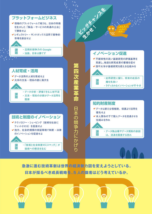 わたしの構想No.32 2017.11.10 第4次産業革命に挑む この記事は分で読めます シェア Tweet かつてないスピードで進む技術革新は、逆転のチャンスでもある。日本が採るべき成長戦略とそこで直面する課題を考える。 PDF(日本語) PDF (ENGLISH) ABOUT THIS ISSUE企画に当たって 第4次産業革命、個の力を引き出せ 誰もが活躍できるビッグチャンスの時代 金丸恭文 NIRA総合研究開発機構理事長/フューチャー株式会社代表取締役会長兼社長グループCEO IoT、ビッグデータ、AIを中心とした急速な技術革新は、第4次産業革命とも呼ばれ、われわれの生活や社会を大きく変える可能性を秘めている。米国の巨大ITプラットフォーム企業が世界を席巻するなか、日本がこれからの時代に世界で存在感を示していくためには、どういった成長戦略が必要となるのか。プラットフォーム、技術の社会実装、知的財産制度、イノベーション促進、人材育成の5つの視点から、第4次産業革命において日本が直面する課題と、それを克服し、成長につなげるための戦略の道筋を考える。 EXPERT OPINIONS識者に問う 第4次産業革命において、日本はどのような成長戦略を採るべきか。その際に直面する課題をどう克服すべきか。 根来龍之早稲田大学ビジネススクール教授 徳田英幸国立研究開発法人情報通信研究機構理事長 林いづみ桜坂法律事務所弁護士 清水洋一橋大学イノベーション研究センター教授 竹村彰通滋賀大学データサイエンス学部長 インタビュー実施:2017年6月~7月インタビュー:尾崎大輔(NIRA総研研究コーディネーター・研究員) 企画に当たって 第4次産業革命、個の力を引き出せ 誰もが活躍できるビッグチャンスの時代 金丸恭文 NIRA総合研究開発機構理事長/フューチャー株式会社代表取締役会長兼社長グループCEO KEYWORDS サイバー経済圏、イノベーション創造型サンドボックス、大学の役割、政府の予算配分、データ活用、個人起点のビッグチャンス IoT(モノのインターネット)、ビッグデータ、そしてAI(人工知能)といった技術革新は第4次産業革命と呼ばれ、世界の経済勢力図を大きく変えつつある。今後、日本が世界において一定の地位を確立し、世界に貢献していくためにはどうすればよいか、さまざまな議論、提言がなされている。 これらについて述べる前に、大前提を明確にしておかなければなるまい。 1990年代後半に始まるインターネットの爆発的商業利用に関して、日本社会はあくまで投機的な関心しかもたなかった。その結果、イノベーションの本質を見逃し、敗戦国となってしまった。現在、米国ITプラットフォーム企業が世界を席巻し、例えばFAANG(Facebook, Apple, Amazon, Netflix, Google)と呼ばれる企業群の時価総額は約300兆円にもなる。物理的で目に見えるモノの「リアル経済圏」に加え、データやアイデアといった目には見えないモノが行き交う「サイバー経済圏」が重要性を増しているのだが、サイバー経済圏における日本の存在感は非常に小さいといわざるをえない。 プレーヤーを邪魔しない環境を作る では、イノベーションの本質とは何か? Googleの検索エンジンは、大学院生の研究から始まった。膨大な情報の索引を作るという、誰でも思い付きそうなアイデアを技術と格闘しながら完成させた。Facebook創業者のマーク・ザッカーバーグも、学生同士を結びつけるSNSを、試行錯誤のうえ自分で作った。つまり、ささやかなアイデアを思い付き、成功するか失敗するかにかかわらず、実行した人間だけがイノベーションを起こせるのである。起点となるのは、プレーヤーたる個人だ。いまやITに限らず、バイオでも材料でも、1、2人のプレーヤーがアイデアさえ思い付けば、リスクマネーを世界中から調達できる。 本号の識者の1人である根来龍之氏(早稲田大学)は、日本の厳しすぎる規制と問題の事前解決を重視しすぎる文化を問題点として指摘し、徳田英幸氏(情報通信研究機構)は社会的規模の実証環境の提供を訴える。 両者が主張するように、日本に必要なのはプレーヤーの邪魔をせず、自由に挑戦できる環境を用意することだ。その一例としては、内閣府の開催する未来投資会議が制度化を提言する「イノベーション創造型サンドボックス」が挙げられよう。これは、さまざまな分野の近未来技術について、柔軟に規制を緩和して実証実験をスムーズに行なうための仕組みである。利用者も、リスクを理解したうえでプロジェクトチームの一員、プレーヤーとなって参加することが特徴だ。 林いづみ氏(桜坂法律事務所)が主張するのは、新たな情報財としてのデータ活用である。日本社会は、政府や関係官庁の稚拙(ちせつ)さもあって、データ活用に対する不信感が根強い。だが、過剰な保護はサイバー経済圏での活動を阻害する可能性が高い。消費者保護とのバランスを取りつつ、データを活用して先進的なサービスを生み出せる環境を整備していくべきだろう。 イノベーションのために大学を改革せよ イノベーションを起こすには、基礎研究と応用研