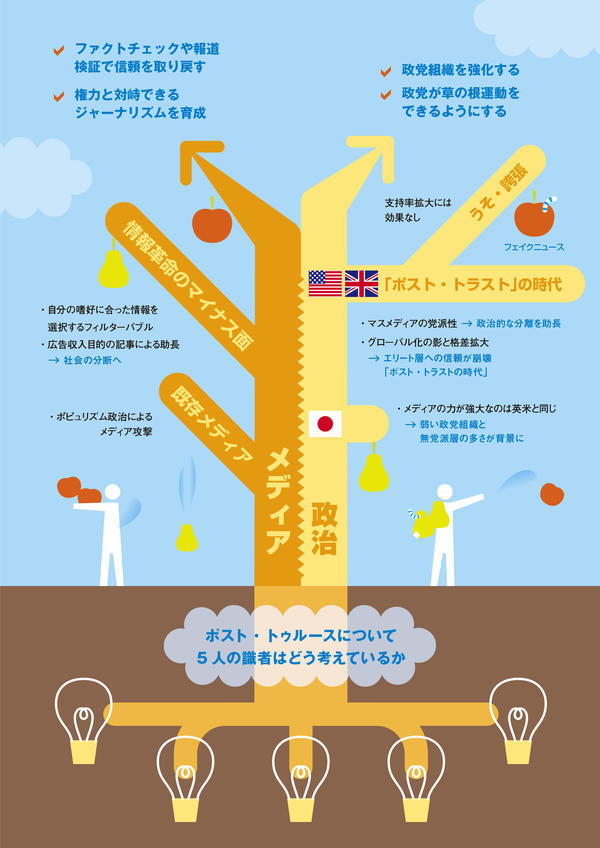 English version わたしの構想No.31 2017.09.10 ポスト・トゥルースの時代とは この記事は分で読めます シェア Tweet 世界の政治が大きく動きつつあるいま、先進各国におけるポスト・トゥルースの影響と、政治やメディアが果たすべき役割について考える。 PDF(日本語) PDF (ENGLISH) ABOUT THIS ISSUE企画に当たって 問われる政治とメディアの緊張感 谷口将紀 NIRA総合研究開発機構理事/東京大学大学院法学政治学研究科教授 イギリスのEU離脱やアメリカのトランプ新大統領誕生など、世界の政治が大きく動いた2016年。ワード・オブ・ザ・イヤーに「ポスト・トゥルース」が選ばれた。この言葉は、客観的な事実が重視されず、感情的な訴えが政治的に影響を与える状況を表している。各国におけるポスト・トゥルースの影響や、このような時代に政治やメディアに求められている役割について考察することで、ポスト・トゥルースへどのように対応するべきか示唆を得たい。 EXPERT OPINIONS識者に問う 各国においてどのようなポスト・トゥルースの影響がみられるか。このような政治情勢において、政治やメディアにはどのような役割が求められるか。 今井貴子成蹊大学法学部教授 飯田連太郎東京大学大学院法学政治学研究科附属ビジネスロー・比較法政研究センター特任研究員 逢坂巌駒澤大学法学部准教授 園田耕司朝日新聞政治部記者 古田大輔バズフィード・ジャパン創刊編集長 インタビュー実施:2017年5月インタビュー:川本茉莉(NIRA総研研究コーディネーター・研究員)、榊麻衣子(同) 企画に当たって 問われる政治とメディアの緊張感 谷口将紀 NIRA総合研究開発機構理事/東京大学大学院法学政治学研究科教授 KEYWORDS 政治の分極化、インターネットメディアの発達、市民の分断、反響室効果、情報リテラシーの向上 根本に潜む市民の分断 オックスフォード大学出版局は、2016年のワード・オブ・ザ・イヤー、日本流でいえば流行語大賞に「ポスト・トゥルース(post-truth)」を選んだ。ポスト・トゥルースとは「世論の形成において、客観的事実の影響力が、感情や個人の信念に対する訴えかけに劣る状況を意味する、またはこのような状況に関する形容詞」と定義されている。 ポスト・トゥルースという単語自体は以前から存在していた。ただし、それが広く知られるきっかけになったのは、2016年に行なわれたEU(欧州連合)離脱をめぐるイギリスの国民投票とアメリカ大統領選挙である。 イギリスの国民投票では「EUに週3億5,000万ポンド(約530億円)も仕送りをするのを止(や)めて、そのお金を国民保健サービスに使おう」というスローガンが、離脱賛成派によって喧伝(けんでん)された。BBCによると、イギリス政府の対EU支出は週当たり1億6,000万ポンド、政府支出の1%強にすぎなかったが、こうした「事実」はかすんでみえた。 アメリカのトランプ政権は、いまなお不正確または不適切な発言でたびたび物議を醸している。なかでも極め付きは、大統領就任式に過去最大の人出があったという公式発表の真贋(しんがん)―同じ場所で撮影された写真の比較では、オバマ大統領就任式の観衆の方が明らかに多かった―を追及された際に、大統領顧問が発した「あなたはうそというけれど、報道官は『代わりの事実(alternative facts)』を示したまでよ」という言葉であった。 ところが、両国政治のエキスパート、今井貴子・成蹊大学教授と飯田連太郎・東京大学特任研究員によると、イギリスの国民投票の結果は離脱派のキャンペーンに影響されたものではなく、うそや誇張によってトランプ支持が増えたのでもない。別々に行なわれたインタビューで、2人がそろって強調したのは、政治が分極化する一方で、インターネットメディアの発達によって、それぞれの支持勢力は自らにとって都合のよい情報ばかりを受け入れるようになり、既存のマスメディアや異なる意見には耳を傾けなくなる市民の分断こそが、ポスト・トゥルースの政治の根本に潜む問題点という認識である。 これは、政治コミュニケーション論でいうところの「反響室(echo chamber)」効果に通じる。ケーブルテレビやインターネットの広がりによって、保守派の人ならば、保守的な社論を掲げる新聞を読み、保守派の司会者がリベラル派を散々にこき下ろすトーク・ラジオを聞き、保守派のコメンテーターが登場するテレビ番組を見て、そしてインターネットでの保守的言論空間で情報交換するといった具合で、自らの政治的傾向に沿う言説ばかりをえり好み(選択的接触)できるようになった。この結果、反響室のなかにいるように、その人のなかでは同じ声ばかりが延々とこだまして、自分の意見を一層強固なものにする。さらにいえば、その際に重要なのは各人の嗜好(しこう)に合う情報であるかどうかで、真偽のほどは二の次である。 翻(ひるがえ)って日本の状況はどうか。確かに日本でも、ネット右翼という言葉が象徴するとおり、インターネット利用の拡大にともなって、左右両極の言説がそれ