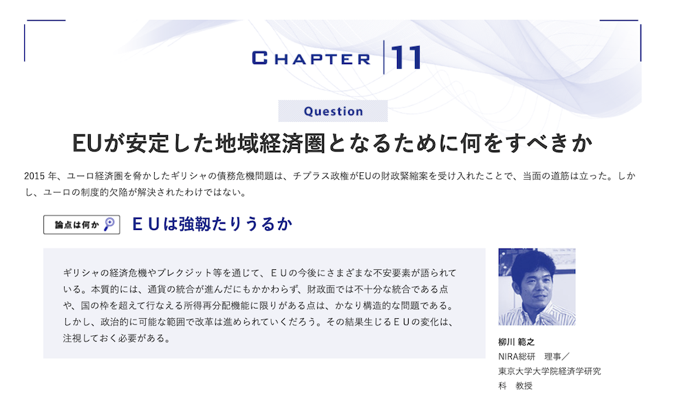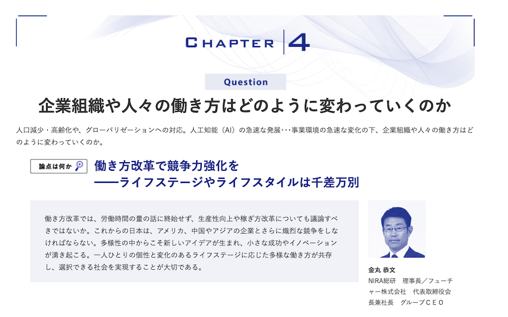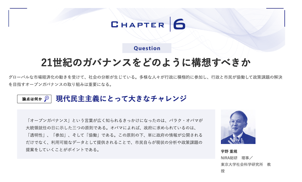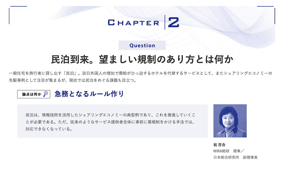 わたしの構想 2017.04.18 日本の課題を読み解く わたしの構想Ⅱ 中核層へのメッセージ この記事は分で読めます シェア Tweet NIRA総合研究開発機構 編 2017年4月発売!!★ご購入は、お近くの書店またはネット書店にご注文ください。出版社サイトでのご購入はこちらから。Amazonでのご購入はこちらから。内容紹介はこちらから 概要 好評の『わたしの構想』第2弾。日本が直面する課題から12のテーマをとりあげ、碩学、新進気鋭の研究者、政治家、実務家など、立場や専門の異なる5人の識者が1つのテーマを巡って多様な意見を開示。日本の課題を考えるキーポイントを浮き彫りにする。簡潔な構成と、平易で分かりやすい文章。未来ビジョンを探る社会人の必携の書。各テーマ巻末には、推薦図書・キーワード・関連年表を記載。さらに読者自身の構想をまとめるメモ欄を付した。編集・発行: 公益財団法人NIRA総合研究開発機構発売: 株式会社時事通信社定価: 900円+税 INDEX 主な内容 PART1:新ビジネスの波 PART2:働き方の変革 PART3:政治への参加 PART4:世界と日本 主な内容 PART1:新ビジネスの波 Capter 01:FinTechベンチャー発展の条件とは何かCapter 02:民泊到来。望ましい規制のあり方とは何かCapter 03:ITは企業と消費者の関係をどのように変えるのか PART2:働き方の変革 Capter 04:企業組織や人々の働き方はどのように変わっていくのかCapter 05:シニア世代の能力はどうすれば発揮できるのか PART3:政治への参加 Capter 06:21世紀のガバナンスをどのように構想すべきかCapter 07:若者の政治参加を促すために何をすべきかCapter 08:いま、なぜ軽減税率なのか?Capter 09:国民にとって歳出改革の意義は何か PART4:世界と日本 Capter 10:社会に開かれた学術研究を開花させるために何をすべきかCapter 11:EUが安定した地域経済圏となるために何をすべきかCapter 12:中国経済をどうみるのか シェア Tweet ⓒ公益財団法人NIRA総合研究開発機構※本誌に関するご感想・ご意見をお寄せください。E-mail:info@nira.or.jp 研究の成果一覧へ