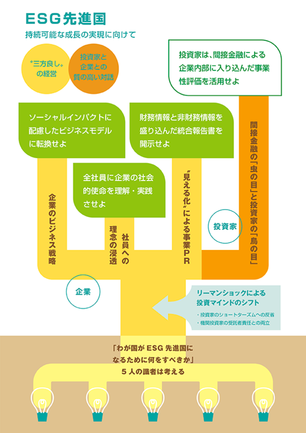 English version わたしの構想No.34 2018.02.10 ESG先進国に向けて この記事は分で読めます シェア Tweet 投資戦略にESGの観点を取り入れる動きが世界的に加速している。投資家や企業に何が求められるのか。わが国がESG先進国になるための課題は何か。 PDF(日本語) PDF (ENGLISH) ABOUT THIS ISSUE企画に当たって ESG先進国に向けて 投資家・企業・市場の課題とは 翁百合 NIRA総合研究開発機構理事/日本総合研究所副理事長 長期的な視点にたち、環境問題や社会的課題の解決に積極的に取り組む企業に投資しようとするESG投資の機運が高まっている。わが国では、2014年にスチュワードシップ・コード、2015年にコーポレートガバナンス・コードが策定されているが、ESG投資の動きは海外が先行しており、日本はようやく取り組みが始まったところだ。今後、日本がESG先進国となるために、解決していかなければならない課題とは何か。そして企業や投資家には何が求められているのか。これまで日本のESG投資をけん引してきた5人の識者の言葉から、解決の糸口を探る。 EXPERT OPINIONS識者に問う 日本がESG先進国になるための課題は何か。投資家・企業はいかに取り組んでいくべきか。 水野弘道年金積立金管理運用独立行政法人理事兼CIO 大場昭義一般社団法人日本投資顧問業協会会長 井垣勉オムロン株式会社執行役員グローバルIR・コーポレートコミュニケーション本部長 竹ケ原啓介株式会社日本政策投資銀行執行役員産業調査本部副本部長 玉木林太郎公益財団法人国際金融情報センター理事長(前OECD事務次長) インタビュー実施:2017年11~12月インタビュー:林祐司(NIRA総研主任研究員) 企画に当たって ESG先進国に向けて 投資家・企業・市場の課題とは 翁百合 NIRA総合研究開発機構理事/日本総合研究所副理事長 KEYWORDS 投資家の人材育成・体制整備、企業の意識改革、非財務情報の開示、市場インフラの整備、EとSの議論の深化 取り組みが広がるESG投資 ESGとは、環境(E)、社会(S)、企業統治(G)を表す言葉である。日本の株式市場でも、機関投資家が、環境や社会的課題に積極的に取り組む企業に投資をする「ESG投資」の動きが広がりつつある。こうした動きの背景には、投資活動を通じて投資先の企業価値の持続的向上をサポートし、その活動の結果として世界が抱える社会的課題の解決につなげようとする意図がある。より一層の広がりが期待されるが、日本がESG先進国になるためには、まだ多くの課題がある。そこで、今回は、アセットオーナー、投資家、金融機関、企業、国際機関の立場でESG投資をリードしてきた方に、それぞれの立場から今までの取り組みと今後の課題について伺った。 変わり始めた日本 近年、ESG投資が世界で意識されるようになったひとつの契機は、国連が2006年に「責任投資原則(PRI)を打ち出したことであろう。この責任投資原則は、投資家に対して、企業分析や評価を行うにあたり、ESG要素を組み入れた上で、長期的な視点に立ち、企業に対して適切な開示を求めることなどを要請している。海外の年金投資家など、他国に先駆けてESG投資への取り組みを本格化しているところも多い。世界の2016年のESG投資残高は、23兆ドルと世界の運用資産の3割に迫る勢いで、これは2年前より25%の拡大となっているが、その過半は欧州の投資家によるものとのデータもある。日本でも、世界最大のアセットオーナーである年金積立金管理運用独立行政法人(GPIF)が前述の責任投資原則に2015年に署名したことや、2017年のスチュワードシップ・コード改訂で、投資家や企業のESGに対する姿勢が変わってきた。ただ、ESGの質的な要素をみると、2015年に打ち出されたコーポレートガバナンス・コードへの対応がようやく一通り終わったところで、企業はGの要素をまず重視しており、EやSへの戦略的取り組みはまだこれからという企業も少なくない。 投資戦略として位置づけよ 日本がESG先進国になるための課題の第1は、投資家が、ESG投資への取り組みを今後の投資戦略における重要課題と位置づけ、そのための人材育成や体制を整備していくことであろう。GPIFの水野氏が指摘するように、環境や社会に配慮しない企業は投資対象としてはリスクが高く、ESG投資に取り組むことは極めて合理的なことである。受託者責任を負う機関投資家にとって、ESGを投資戦略として位置づけることの重要性をまず認識することが必要であろう。 その上で、短期志向の強かった日本の機関投資家は、大場氏(日本投資顧問業協会)が指摘するように、数字に表れない企業価値を、企業との対話を通じて見極め、投資選別の力をつけた人材を育成していく必要がある。また、企業の持続的成長を粘り強く働きかけていく体制を構築することが欠かせない。そうしたことが実現していけば、投資の魅力を高め、最終的に日本の貯蓄から投資への流れを形成することにもつながるであろう。 非財務情報の開示の充実と市場インフラの整備 課題の第2は、企業側のESGに対する意識改革と非財務情