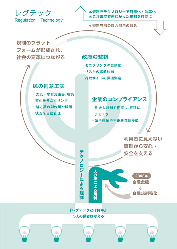 English version わたしの構想No.35 2018.04.10 始動、レグテック この記事は分で読めます シェア Tweet ITを規制に活用するレグテックの動きがみられる。レグテックとは何か。社会にどのような影響を与えるのか。 PDF(日本語) PDF (ENGLISH) ABOUT THIS ISSUE企画に当たって レグテックで規制の構造改革を 先行者のいない今がビジネスチャンス 柳川範之 NIRA総合研究開発機構理事/東京大学大学院経済学研究科教授 2018年1月のコインチェック流出事件などにみられたように、技術革新が急激に進む中、急速に変化する金融情勢に瞬時に対応できる体制が求められるようになっている。こうした中、最近レグテックという言葉が聞かれるようになってきた。レグテックは、規制(Regulation)と技術(Technology)を組み合わせた造語である。レグテックとは何か。レグテックは有効な解決となりうるのだろうか。また、社会にどう影響を与えるのか。識者に聞いた。 EXPERT OPINIONS識者に問う レグテックとは何か。日本がレグテックを推進するための課題は何か。 早川真崇渥美坂井法律事務所・外国法共同事業弁護士 佐々木隆仁AOSリーガルテック株式会社代表取締役社長 ティム・オライリーオライリー・メディア創立者兼CEO 森川博之東京大学大学院工学系研究科教授 櫛田健児スタンフォード大学アジア太平洋研究所リサーチスカラー インタビュー実施:2018年1~2月インタビュー:榊麻衣子(NIRA総研研究コーディネーター・研究員) 企画に当たって レグテックで規制の構造改革を 先行者のいない今がビジネスチャンス 柳川範之 NIRA総合研究開発機構理事/東京大学大学院経済学研究科教授 KEYWORDS 規制する側・される側、コスト削減、ビジネスチャンス、新規参入、規制の構造を変化、イノベーションの有望領域 テクノロジーの力で適切に規制し、コストも削減 技術革新がこれだけ進んでいる時代においては、規制(レギュレーション)の世界にも、その波が押し寄せないはずはない。レグテックは、まだ耳慣れない言葉かもしれないが、レギュレーション+テック、すなわち規制のあり方・やり方をテクノロジーで変革するイノベーションであり、今後大きなインパクトを持ち得る、そして、日本が国際的に優位性を持ち得る分野でもある。 ただし、そのためにも、この分野の動向をしっかりと把握し、今後の対応策を官民あげて考えていく必要がある。本号では、このような問題意識に基づいて、多様な側面からこの分野を考えている専門家の方々に、ポイントを語っていただいた。 規制についての議論というと、どうしても規制緩和の是非という話だと思いがちだ。しかし、実は、規制を実施する際のコストについても、考慮しなければならない。規制される側の企業にも、規制する側の行政にも、大きなコスト負担が現実には生じている。規制される側からすれば、規制を遵守(じゅんしゅ)している証拠をきちんと残し、それを証明するための書類作成に追われる。一方、規制をする側からすれば、監督や書類のチェック等を、時間と労力をかけて行う必要がある。 この両者のかけているコストは、実はテクノロジーを活用することによって、大きく削減できる可能性がある。これが、レグテックの1つの側面である。 早川真崇氏(渥美坂井法律事務所)は、企業が法令遵守を徹底するためのチェックや検知(モニタリング)はテクノロジーと親和性が高く、レグテックの活用でコンプライアンスに費やすコストや労力が大きく削減できることを強調している。一方、佐々木隆仁氏(AOSリーガルテック株式会社)は、規制する側もテクノロジーを活用していかないと、規制のコストは大きくなるし、また、テクノロジーを活用する企業を適切に規制することが難しくなるという点が強調されている。 ティム・オライリー氏(オライリー・メディア)も、新しいテクノロジーをうまく使っていくことで、規制を減らしつつも、より適切な管理ができるとし、政府もレグテックの動きに積極的に参画し、簡素で効果的な規制の実現を目指す必要があると主張している。 大きなビジネスチャンス しかし、レグテックは、単にテクノロジーを活用して、行政のコストを下げるというだけの話ではない。ここには、民間企業にとっての大きなビジネスチャンスがあり、新規参入や企業成長の可能性も高まる。 森川博之氏(東京大学)は、金融業を例にあげて、規制への対応に金融業界は大きなコストをかけているが、テクノロジーを活用することで、このコストが大幅に下がる可能性を指摘している。そしてそれと同時に、そのコスト削減を実現させる技術を提供する企業には、大きなビジネスチャンスが生じ、世界的なプラットフォームになる可能性すらあるとしている。 また、櫛田健児氏(スタンフォード大学)は、コストがかかっていたばかりでなく、今までの技術では実現できなかった、新しい規制のあり方についても言及している。技術革新を活用することで、新しい規制のあり方を民間企業の