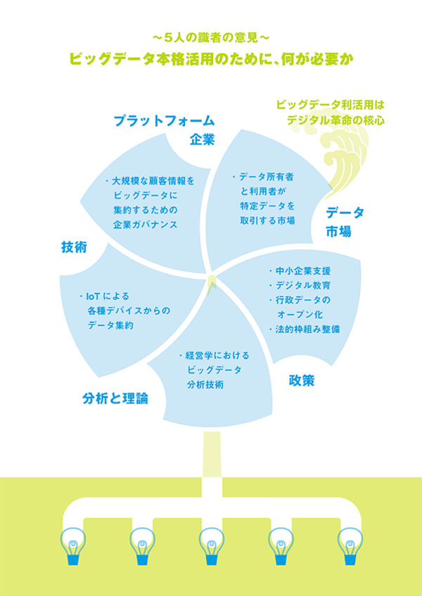 English version わたしの構想No.39 2018.12.25 ビッグデータ本格活用へ この記事は分で読めます シェア Tweet ビッグデータをいかに利活用していくかが、これからのデジタル革命の要となる。日本はその十分な備えができているのか。 PDF(日本語) PDF (ENGLISH) ABOUT THIS ISSUE企画に当たって 本格活用への突入前夜 ビッグデータの実態を正確に把握せよ 柳川範之 NIRA総合研究開発機構理事/東京大学大学院経済学研究科教授 デジタル革命の核心となるビッグデータ。しかしその利活用はまだ発展途上だ。この新しい競争力のパラダイムに、各国がしのぎを削る。日本は十分な備えができているのか。本号は、2018年11月1日、NIRAとドイツ日本研究所の共催で開催された「ビッグデータ」ワークショップ(カリフォルニア大学サンディエゴ校&マックス・プランク・イノベーション・競争研究所協賛)から、ビッグデータ利活用の現状をお届けする。 EXPERT OPINIONS識者に問う ビッグデータで何ができるのか。利活用の促進のために、何が必要か。 中村潤芝浦工業大学工学マネジメント研究科教授 眞野浩エブリセンスジャパン株式会社代表取締役最高技術責任者 トリスタン・チョン西安交通リバプール大学蘇州国際ビジネススクールビッグデータ分析研究所副所長 北川拓也楽天株式会社執行役員CDO ディートマー・ハーホフマックス・プランク・イノベーション・競争研究所所長 データで見る 国内IoT市場 テクノロジー別にみた支出内訳(2017年) データ取引市場における取引の流れ E-コマース売上高(2015年B2C上位5か国) 各国企業のCDO設置状況 企画に当たって 本格活用への突入前夜 ビッグデータの実態を正確に把握せよ 柳川範之 NIRA総合研究開発機構理事/東京大学大学院経済学研究科教授 KEYWORDS ビッグデータを何のためにどう使うのか、技術革新で何がどこまでできるようになったのか 理念が先行するビッグデータの活用 ビッグデータという言葉が、マスコミで頻繁に登場するようになり、その重要性がかなり認識されるようになってきた。そこには大きく分けて3つの理由が考えられよう。 第1の理由は、コンピュータの能力が高まったことにより、大量のデータを短時間で処理することが可能になったことだ。第2の理由は、IoT(モノのインターネット)に代表されるように、今までに得られなかった種類のデータを大量に獲得し、それを伝達する技術革新が起きている点だ。まだ本格的に実用化していないため、実感がわきにくい点があるが、これからはビッグデータを容易に獲得できるようになり、今までとは異なる時代がやってくる。そして、第3の理由は、データ解析技術やAI(人工知能)の発達によって、大量のデータを分析する意義が大きく高まっていることだ。特に機械学習の進展は、大量のデータがAIの学習にとって重要な要素であることを、われわれに強く認識させることになった。 その一方で、ビッグデータという言葉だけがやや独り歩きしている面がある。例えば、とにかく大量のデータを集めさえすれば、あとはAIが適切に分析して、何か適切な「解答」を導出してくれるかのような議論も散見される。 しかし、AIの基本が統計処理である以上、何のために、どんなデータを大量に集め分析するのかが明確でなければ、どれだけビッグなデータを集めても、意味のある結果は得られない。したがって、ビッグデータを何のためにどう使うのかを、もっと議論し検討する必要がある。 そして、その検討を行うためには、実際にどのような技術革新が起き、何がどこまでできるようになったのかを把握しておくことも求められよう。また、制度や法律面がどこまでその技術を適切に生かす形で整備されているのか、あるいは整備していくべきかについても、整理しておく必要がある。しかし、残念ながらビッグデータについては、理念が先行している面が強く、そのような詳細な具体論が十分には議論されていないのが現状だ。そこで本号では、このギャップを埋めるべく、内外の専門家からビッグデータに関するさまざまな側面について語っていただいた。 データ取得の手段が多様に そもそもまず、IoTなどの技術革新によって、だれがどのようなデータを得ることができるのだろうか。ビッグデータの取得というと、グーグルやアマゾン等のいわゆる世界的なプラットフォーム企業によるデータ取得が注目される。しかし、芝浦工業大学の中村潤教授は、IoTモジュールによって、プラットフォーム企業に依存することなくデータを集約できる可能性を指摘している。また、IoTモジュールといえども、そこに搭載されているアナログの技術を、日本は重要視すべきだと警告している。 もっとも、活用できるデータは、自分が直接獲得した情報だけとは限らない。エブリセンスジャパン株式会社の眞野浩代表取締役最高技術責任者は、集められたデータを取引することの重要性を指摘している。眞野氏は個別企業がビッグデータを集めるのはなかなか困難で