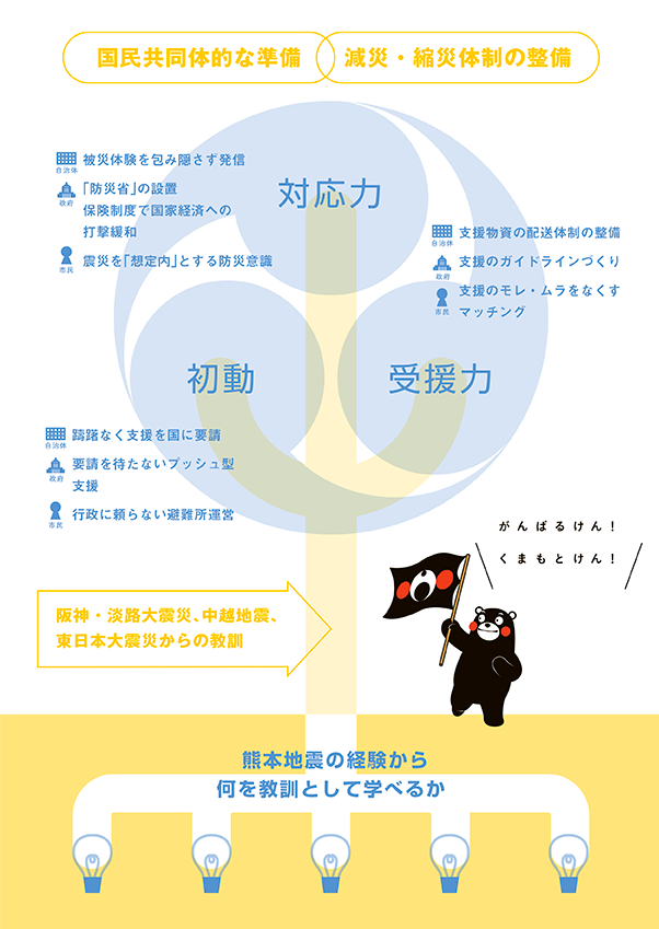わたしの構想No.36 2018.06.10 熊本地震から学ぶ この記事は分で読めます シェア Tweet 熊本地震から2年。地震大国である日本において、熊本の経験から学ぶべきことは多い。どのような教訓を得ることができるのか。 PDF(日本語) ABOUT THIS ISSUE企画に当たって 熊本地震の教訓 支え合いと学び 谷口将紀 NIRA総合研究開発機構理事/東京大学大学院法学政治学研究科教授 2016年4月に発生した熊本地震から2年がたった。震度7が2度続けて発生するという異例の震災により、被害が拡大した。人的・住家被害に加え、日本の三名城の1つともいわれる熊本城も大きく被災し、石垣や天守閣の完全な復元には、およそ20年という長い月日がかかるとされている。復旧、復興の道のりは平坦ではない。地震大国である日本において、熊本地震の記憶を風化させずに、その経験から学ぶことが必要ではないだろうか。熊本の震災・復興から、自治体や国、そして住民はどのような教訓を得ることができるのか。さまざまな立場で熊本の復旧・復興に関わっている識者に、熊本地震から何を学ぶべきか聞いた。 EXPERT OPINIONS識者に問う 熊本の経験から何を学ぶべきなのか。自治体や国、住民はどのような教訓を得ることができるのか。 蒲島郁夫熊本県知事 五百旗頭真兵庫県立大学理事長/ひょうご震災記念21世紀研究機構理事長 河田惠昭関西大学社会安全研究センター長 堀田直孝熊本県西原村議会議員 樋口務くまもと災害ボランティア団体ネットワーク代表 インタビュー実施:2018年2~3月インタビュー:川本茉莉(NIRA総研研究コーディネーター・研究員) 企画に当たって 熊本地震の教訓 支え合いと学び 谷口将紀 NIRA総合研究開発機構理事/東京大学大学院法学政治学研究科教授 KEYWORDS 人ごとではない、熊本から学ぶ、大都市で教訓を生かす、3日プラス1日分、経験を「翻訳」 人ごとではない地震災害 2016年4月14日午後9時26分、熊本県を震源とするマグニチュード6.5、最大震度7の地震が襲った。ところが、これは「前震」にすぎなかった。1日置いた4月16日午前1時25分に、マグニチュード7.3、またもや最大震度7の「本震」が熊本を直撃したのである。 本震の震源である布田川断層帯について、2013年に政府の地震調査委員会は、30年以内に大地震が発生する確率をほぼ0~0.9%と評価していた。この数値は大地震の発生可能性が「やや高い」カテゴリーに入り、予測が全く外れた訳ではないが、さりとて地震が差し迫っているという認識が現地で広く共有されていたとは言えない。日本の陸域には、約2,000もの活断層がある。 現在、建築基準法が定める耐震基準は、震度6強から震度7程度の地震で倒壊や崩壊しない水準とされている。しかし、震度7が2度起きることは想定されていない。今回の熊本でも、新耐震基準導入以降に建てられたものを含めて、前震には耐えたものの、本震で持ちこたえることができずに倒壊した住家が相次ぎ、被害を拡大した。 熊本地震の余震は発災後の15日間で2,959回に上り、多い時には県人口の約1割が避難所生活を強いられた。メインアリーナが損傷したこともあり、廊下まで避難者が溢(あふ)れかえった益城町総合体育館の様子を記憶されている方も多いだろう。指定避難所以外に逃れた人や車中泊の人を加えれば、避難者数はさらに増える。 突然に発生する大地震、想定を超える住家被害、収容能力を上回る避難者。これらは熊本だけが例外なのではない。豊かな自然に恵まれた日本は、災害とも背中合わせであり、今回熊本が経験した事態は日本中のどこでも起こりうる。 筆者は「くまもと復旧・復興有識者会議」の委員として、発災直後から国・熊本県・自治体・支援団体や住民を挙げた復旧・復興への取り組みを間近に見てきた。熊本に何回も通ううちに、熊本を支援することにとどまらず、熊本地震は人ごとではなく、むしろわれわれが「熊本から学ぶ」ことが必要との思いを強くした。こうした観点から、今号の「わたしの構想」は、さまざまなお立場から復旧・復興に携わってこられた方々にお話を伺った。 平時から災害対応の態勢を整備せよ 蒲島郁夫熊本県知事は、自治体に向けた教訓として、躊躇(ちゅうちょ)なく支援要請する初動の大切さ、支援物資を各避難所に行き届かせる受援態勢を平時から整えておくこと、過去の事例や他の被災地支援の経験から災害発生時の対応力を高めること、の3点を挙げる。 自ら阪神・淡路大震災の被災者でもあり、東日本大震災復興構想会議議長やくまもと復旧・復興有識者会議座長を歴任された五百旗頭真兵庫県立大学理事長は、政府や自治体、民間支援の各レベルにおいて、過去の災害で被災して助けられた人が、そのノウハウを蓄積し、次は他の人を助けるというサイクルが確立されつつあると指摘する。 かねてから「減災」という言葉を提唱してきた、災害研究の第一人者である河田惠昭関西大学社会安全研究センター長は、熊本地震でも浮き彫りになったように、現在の災害救助法