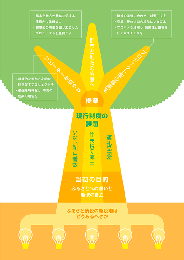English version わたしの構想No.33 2018.01.10 ふるさと納税の新段階 この記事は分で読めます シェア Tweet 制度創設から10年。次のステージでは、返礼品競争の過熱という弊害を是正し、地域の持続的な発展につながる制度にシフトさせねばならない。 PDF(日本語) PDF (ENGLISH) ABOUT THIS ISSUE企画に当たって ふるさと納税の新段階 地域と都市を結び直す 宇野重規 NIRA総合研究開発機構理事/東京大学社会科学研究所教授 ふるさと納税制度は、2008年、ふるさとや地方団体を応援する仕組みとして創設された。10年を経て、制度は多くの人に知られ、利用規模も着実に拡大してきた。被災地への支援にも活用されている。一方で、自治体による返礼品競争の過熱が問題となるなど、課題も指摘される。高額返礼品の見直しが納税額の減少に直結しないよう工夫しつつ、地域の持続的な発展につながる制度にシフトしていく必要がある。現行制度の課題は何か。また、制度の趣旨にふさわしい、ふるさと納税の有効な使い道とは何か。創設から10年を機に、次のステージのふるさと納税のあり方を考える。 EXPERT OPINIONS識者に問う ふるさと納税の現行制度の課題は何か。地域活性化のための有効な使い道は何か。 池田達雄総務省自治税務局市町村税課長 田中良杉並区長 西川一誠福井県知事 黒田成彦長崎県平戸市長 三神万里子ジャーナリスト インタビュー実施:2017年9月インタビュー:榊麻衣子(NIRA総研研究コーディネーター・研究員) 企画に当たって ふるさと納税の新段階 地域と都市を結び直す 宇野重規 NIRA総合研究開発機構理事/東京大学社会科学研究所教授 KEYWORDS 地域外の応援者、地域の活性化、地域の新たな価値の創造、地域と都市の関係の結び直し 返礼品競争と都市の住民税の流出 2008年に導入されたふるさと納税制度は、今年10年目を迎えた。2016年度のふるさと納税の受け入れ額が2,800億円を超えるなど、その規模は着実に拡大している。自治体の側でもアイデアをこらし、地域に人を呼び込み、継続的に関わってもらうための施策として活用している例も多い。ふるさと納税を機にその地域を知ってもらい、関心をもってもらい、さらには地域のプロジェクトを応援してもらえるとすれば、制度のねらいは実現したことになるであろう。 しかしながら、ふるさと納税の制度に問題がないわけではない。まず指摘すべきは、返礼品競争であろう。いうまでもなく、制度の趣旨は返礼品ではない。返礼品はあくまで感謝の印(しるし)であり、おまけである。それなのに、あたかもカタログショッピングのように、返礼品目当てのふるさと納税が過熱すれば、本来の趣旨から外れていると言わざるをえない。自治体の側でも、納税額の半分以上を返礼品に当ててしまっては、その労力を考えても本末転倒な事態であろう。その意味で、総務省自治税務局の池田達雄市町村税課長が苦言を呈するように、「行き過ぎた競争」を抑制するための総務大臣通知が出されたことは残念な事態であった。今後、ふるさと納税が本来の趣旨に立ち戻って発展していくことを期待したい。 ふるさと納税については、別の批判もある。例えば、杉並区の田中良区長は、本来、地域の行政サービスのコストを、その受益者である住民自身が負担するのが原則であり、ふるさと納税はむしろ「税のあり方に歪みをもたらす」と指摘する。都市部においても高齢化が進むなど、行政需要は増大している。このまま住民税が流出していくことを座視しているわけにはいかないという訴えは、無視しがたい重みをもっている。田中区長も言及しているように、都市部の自治体が「主体的に地方に共栄を仕掛けて行きたくなる」インセンティブ(動機付け)を構想する必要があるだろう。 地方で育ち、都会で働く人びと このようにふるさと納税には検討すべき課題がある。とはいえ、この制度がなぜ導入されたのか、その原点を再考することなしに、制度の評価を決めるわけにはいかない。例えば、ふるさと納税の提唱者の1人である福井県の西川一誠知事は、次のように主張する。西川知事の念頭にあるのは、生まれ育った地域を離れ、都会で働く人びとである。福井県の場合、毎年、大学等への進学のために2,500人の若者が県外に流出するが、そのうち、就職などで県内に戻るのは600人ほどにすぎない。結果として、「教育や子育てなどの行政サービスを提供するのは地方なのに、社会人となって租税を納める先は大都市となる」。このアンバランスを是正すべきであるという西川知事の問題提起は、傾聴に値するだろう。 地域外の応援者との関係をいかに築くか それではふるさと納税を、今後どのように発展させていくべきか。 やはり納税を1回限りの出来事とせず、それを通じて自治体と、地域外の応援者との関係を恒常的に築いていくことが大切であろう。2014年度にふるさと納税の受け入れ額が日本一になり、その後も多くの寄付者を惹(ひ)きつけている長崎県平戸市の黒田成彦市長