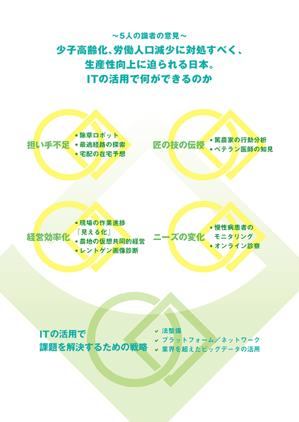 わたしの構想No.44 2019.10.10 ITに託す日本の未来 この記事は分で読めます シェア Tweet 少子高齢化が進展し、課題山積の日本。ITの活用が希望となる。課題解決先進国に進むために、何が必要か。 PDF(日本語) ABOUT THIS ISSUE企画に当たって 課題解決先進国への道程 硬直した国のあり方をリデザインする 金丸恭文 NIRA総合研究開発機構理事長/フューチャー株式会社代表取締役会長兼社長グループCEO 日本には、解決すべき多くの課題が山積している。少子高齢化の進展、地域におけるインフラの老朽化、社会・産業の担い手不足、医療の地域格差―。日本は課題先進国といわれて久しいが、なかなか解決には、向かっていない。そうした中、ITを活用することで、課題を乗り越え、解決しようとする試みが始まっている。ITの活用による未来を展望し、その実現のためにはどうすればよいか、議論する。 EXPERT OPINIONS識者に問う ITの活用で、課題をどう乗り越えられるのか。実現のために何をすべきか。 菅谷俊二株式会社オプティム代表取締役社長 二宮正士東京大学大学院農学生命科学研究科特任教授 松原仁公立はこだて未来大学副理事長・教授 武藤真祐株式会社インテグリティ・ヘルスケア代表取締役会長 加藤エルテス聡志株式会社日本データサイエンス研究所代表取締役 インタビュー実施:2019年7月~8月インタビュー:井上敦(NIRA総研研究コーディネーター・研究員)、榊麻衣子(同)、ほか データで見る 世界の産業ロボットの販売台数(2009年–2017年) 世界の業務用サービスロボットの販売台数(2016年、2018年) 大規模水稲におけるスマート農業技術の実用化・研究開発の状況 日本の経済活動別 就業者1人当たりの付加価値額(2017年) 企画に当たって 課題解決先進国への道程 硬直した国のあり方をリデザインする 金丸恭文 NIRA総合研究開発機構理事長/フューチャー株式会社代表取締役会長兼社長グループCEO KEYWORDS 課題解決先進国、テクノロジーによるマーケットメイク、好循環を作り上げる戦略、「廃県置藩」、地域の自由度を高める、地方にこそハイテク化、法制度や発想のリデザイン テクノロジーによって世界でマーケットメイクを行う 世界に先駆けて高齢化、人口減少といった課題に直面する日本を「課題先進国」とポジティブに捉える人がいる。だが、5年後には他の先進国も日本同様の課題を抱えることが確実だ。これからの5年でもっとスピーディー、ダイナミックに変化を起こし、日本は「課題解決先進国」として世界の新しいモデルになるべきだ。 人口減の進む日本において、課題解決にはテクノロジーの活用が欠かせない。かつての技術立国・日本では、よいものを作れば売れるマーケットがあった。そのため、長年、企業は何も考えずに同じモノを横並びで作って過当競争を繰り返し、誰も儲(もう)からない悪循環に陥った。この悪循環から脱却するには、テクノロジーやデータで付加価値をつけ、マーケットメイクを行う必要がある。人口減少で労働力、そして、消費者が失われていく今、地域ごとの希少価値を付加価値へと変換し、モノだけでなく、サービスや、さらには総合的なバリューチェーンのプロセスも輸出していかなければならない。 ドローンや人工知能(AI)を活用し、さまざまな産業分野の生産性を高めるソフトウエア開発を行っているオプティムの菅谷氏、ネットワーク化で持続可能な農業を目指す東京大学大学院の二宮氏、乗り合いの配車システムを開発する公立はこだて未来大学の松原氏、オンライン診療システムに取り組むインテグリティ・ヘルスケアの武藤氏、AIによって物流のムダ解決を図る日本データサイエンス研究所の加藤氏。彼らの先進的な取り組みは、課題解決への希望を抱かせてくれる。 テクノロジー活用を阻害する旧態依然の体制とマインド テクノロジーへの取り組み自体は日本でも盛んに行われているのだが、問題は、課題解決に取り組む先駆者たちを阻害する、旧態依然の体制であり、マインドである。 例えば、医療だ。日本において、診察や薬の処方は、人間の医師・薬剤師による対面が原則とされてきた。オンライン診察や医薬品のネット販売も認められ始めているとはいえ、適用される症状、医薬品は限定されており、普及しているとは言いがたい状況にある。また、患者1人ひとりに最適な医療を提供するためには、病歴、薬歴などを統一されたデータベースに集約すべきであるが、こうした動きは実現には程遠く、時間がかかりすぎている。 農業をはじめとする1次産業では、都道府県ごとに区切られた行政単位が壁になっている。一例を挙げれば、九州の各県から和牛が輸出されているが、各県でブランディングが行われており、国内競争をそのまま海外に持ち込んで価格競争している。「和牛」という統一したブランドで勝負ができていない。狭い視野で競うのではなく、大きなマーケットを目指してまとまった単位で受注を一元化する。それによって付加価値を提供し、好