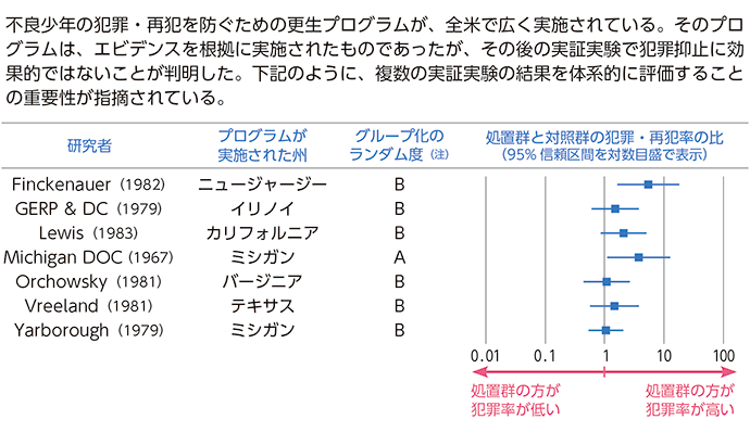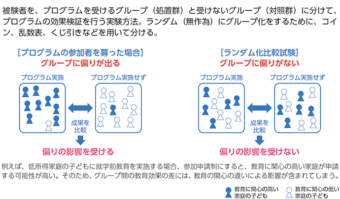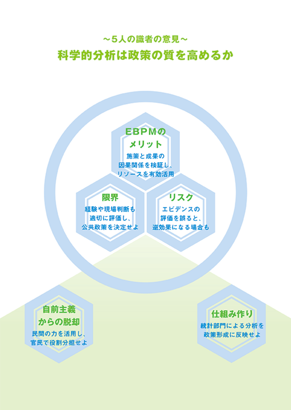 English version わたしの構想No.45 2019.12.10 科学的分析は政策の質を高めるか この記事は分で読めます シェア Tweet 信頼ある行政の構築のため、政府はEBPM(証拠に基づく政策立案)を進めている。EBPMの意義と限界、今後の課題を探る。 PDF(日本語) PDF (ENGLISH) ABOUT THIS ISSUE企画に当たって 何がエビデンスなのか 施策と成果の因果関係を示せ 柳川範之 NIRA総合研究開発機構理事/東京大学大学院経済学研究科教授 信頼ある行政を構築するため、EBPM(証拠に基づく政策立案)の推進が2017年に閣議決定された。以来、推進体制の構築や、各府省による試行的検証、職員の能力開発が進められている。政策の質の向上を確かなものとするためにも、経済学の手法であるEBPMの特徴、その意義と限界を見極め、適切に社会に根付かせていくことが求められる。EBPMに実効性をもたせるには何が必要なのか、今こそ議論したい。 EXPERT OPINIONS識者に問う EBPMの意義と限界は何か。推進のための課題は何か。 川口大司東京大学大学院公共政策学連携研究部教授 小林庸平三菱UFJリサーチ&コンサルティング主任研究員兼行動科学チーム(MERIT)リーダー 中室牧子慶應義塾大学総合政策学部教授 マーティン・ハマーズリー英オープン大学名誉教授 渡辺努東京大学大学院経済学研究科教授 インタビュー実施:2019年9月インタビュー:関島梢恵(NIRA総研研究コーディネーター・研究員) データで見る ランダム化比較試験 不十分な検証をもとに実施された更生プログラム 国際開発分野におけるインパクト評価(2000-2012年) イギリスにおけるエビデンス活用を促す取り組み:What Works Centre(WWC)のネットワーク 企画に当たって 何がエビデンスなのか 施策と成果の因果関係を示せ 柳川範之 NIRA総合研究開発機構理事/東京大学大学院経済学研究科教授 KEYWORDS 科学的根拠、EBPM、因果関係を考える、ランダム化比較試験の適切な理解、政治的要素、エビデンスをどう集めるか、科学的な政策決定への国民の理解 政策を決めていく際には、単なる印象論や思い込みではなく、科学的な根拠に基づいて、議論を行うことが重要だ。今号で東京大学教授の川口大司氏が強調しているように、予算配分に優先順位をつける必要性が増大している時代だからこそ、きちんとしたエビデンスに基づいて政策形成をする仕組みを作っていく必要がある。近年その重要性が指摘されるようになったEBPM(Evidence-based Policymaking)はこのような考え方に基づいている。ただし、そのためには、きちんとしたエビデンスをどう集め、分析するか、それをどう政策形成に生かしていくかを、きちんと検討しておく必要があるだろう。今回のわたしの構想では、この点を、専門家の方々に各方面から議論を展開していただいた。 数字があれば良いわけではない 川口氏は、官庁などがデータをもっと利活用するようにし、エビデンスが積極的に政策決定に影響力を与えるようにする重要性を指摘している。そうでないと、官庁内で統計作成やデータ整備を進めようとしても、なかなか進まないという指摘は、政府統計に関する問題が生じ、その見直しとあり方が議論されている中で重要な点だろう。 もっとも、単に数字を用いて議論すれば良いというわけではない。しばしば見られるのは、自分の主張に都合の良い数字やデータを見つけ出して、それをエビデンスだと主張するパターンだが、これではきちんとしたエビデンスに基づいた議論とは言えないだろう。この点については、小林庸平氏と中室牧子氏が強調されている。三菱UFJリサーチ&コンサルティング主任研究員の小林氏は、EBPMとは単に数字を用いて政策を議論するということではなく、「施策と成果(アウトカム)の因果関係を確認・検証しながら、より良い政策手段を選ぶ取り組み」と定義している。 因果関係をきちんと考えないというのは、データを用いる際にしばしば見られる大きな誤りだ。単なる相関関係と因果関係の違いについては、慶應義塾大学教授の中室氏が分かりやすい例を用いて、説明をされている。ただし、現実には因果関係を明確にチェックすることがなかなか難しいのも事実だ。そこで登場するのが、中室氏も小林氏も強調されている「ランダム化比較試験(RCTs)」と呼ばれる手法である。これを用いれば因果関係を厳密な形で導出することができる。ちょうど今年、それを推進してきたA・バナジー、E・デュフロ、M・クレマーの3氏がノーベル賞を受賞したこともあり、その面からも、あらためて注目が集まっている。 小林氏によれば、日本のEBPMは統計改革の議論から始まったためにデータ整備に焦点があたりがちだが、本来は政策の因果関係をきちんと検証していくことだと主張している。また、中室氏も因果関係を正しく把握していないと、政策が逆効果を招いてしまうケースもあるとして、きちんとした因果関係の検証の重要性を指摘している。 政治的要素も重要 ランダム化比較試験(RCTs)は万能ではないことを指摘しているのは、英オープン大