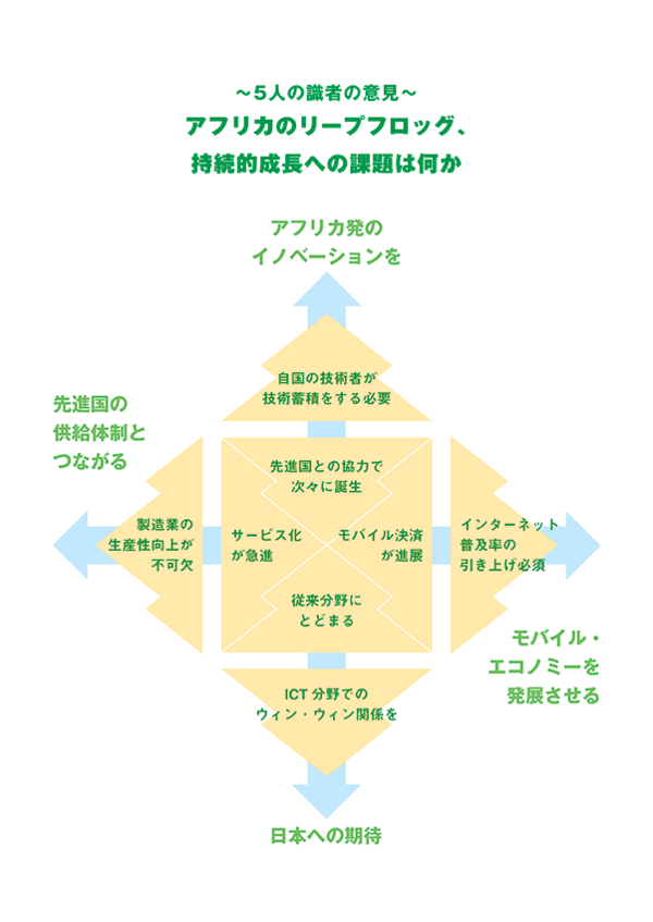 English version わたしの構想No.43 2019.08.10 アフリカ経済の今 この記事は分で読めます シェア Tweet “リープフロッグ”とも呼ばれる経済の活況に沸くアフリカ。ICTの活用はアフリカをどう変えているのか。今後の課題は何か。 PDF(日本語) PDF (ENGLISH) ABOUT THIS ISSUE企画に当たって アフリカ経済の飛躍 日本に求められる3つの課題への貢献 東和浩 NIRA総合研究開発機構理事/株式会社りそなホールディングス取締役兼代表執行役社長 アフリカ地域が世界から注目されている。ICT(情報通信技術)を中心に最先端技術の導入が進み、「リープフロッグ」とも呼ばれる経済の活況に沸いているのだ。2019年5月には「アフリカ大陸自由貿易圏(AfCFTA)」が発効。アフリカ単一市場の形成をめざす。持続的成長の維持が期待される中、今月末には、横浜市で第7回アフリカ開発会議(TICAD7)が開催される。この機会にアフリカの今を知り、日本との新たな関係構築についての考察を深めたい。 EXPERT OPINIONS識者に問う デジタル技術に沸くアフリカ経済の今をどうみるか。さらなる発展のために必要なことは何か。 ソロモン・K・マイナ,M.B.S.駐日ケニア共和国特命全権大使 ジャーマン・カフル国際金融公社(IFC)アフリカ・ラテンアメリカ テレコム・メディア・テクノロジー投資地域リーダー 田中秀和レックスバート・コミュニケーションズ株式会社代表取締役 アシュラフ・パテルインスティテュート・フォー・グローバル・ダイアログ(IGD)シニアリサーチアソシエイト 横山正(*)アフリカ開発銀行アジア代表事務所所長 インタビュー実施:2019年6月~7月インタビュー:川本茉莉(NIRA総研研究コーディネーター・研究員)、渡邊翔太(同) データで見る 海外からアフリカへの直接投資額の推移(フロー、1990年–2018年) アフリカのテックハブ(2018年) 世界地域別にみた人口1人当たりの製造業付加価値額(名目、2017年) サブサハラ・アフリカの国民総所得(GNI)の推移(1960年–2018年) 企画に当たって アフリカ経済の飛躍 日本に求められる3つの課題への貢献 東和浩 NIRA総合研究開発機構理事/株式会社りそなホールディングス取締役兼代表執行役社長 KEYWORDS アフリカ経済、リープフロッグ、ICTを用いたイノベーティブなサービス、アフリカの多様性、アフリカ開発会議(TICAD)、日本の責務、日本にも学びと刺激 「リープフロッグ」の発展を遂げるアフリカ 近年、アフリカ経済は大きく成長している。2000年代初頭以降のドラスティックなアフリカの発展は、「リープフロッグ」と呼ばれている。リープフロッグとは、技術進歩を背景に、人びとの暮らしや産業の水準が段階を踏まずに一足飛びで進歩する現象を示す言葉だ。 中でも、ICT技術を用いたイノベーティブなサービスが、アフリカで次々と登場している状況には、目を見張るものがある。ケニアでは、2007年に始まったM-Pesaというモバイル送金サービスの利用が急拡大している。この新たなサービスのおかげで、人びとは銀行口座をもたなくても、遠隔地間での送金や決済が可能となり、地域の金融アクセスは大きく改善した。また、同サービスを基盤に、銀行との連携融資や貯蓄口座の提供などのサービスも始まり、M-Pesaの登録ユーザー数は、2012年の1,500万人から、2017年には2,700万人に急増している。このできごとは、金融アクセスの困難さが成長の足かせといわれていたアフリカで、デジタル技術がその課題を克服した成功例といえる。 デジタル技術に沸く「アフリカ経済の今」をどうみるか、また、アフリカの飛躍的な成長を持続的なものにするために必要なことは何か。5人の識者に話を伺った。 デジタル技術が解決する開発課題 識者はみな一様に、ICTで躍動する今のアフリカを口にする。アフリカでは、ICTを使った多様なサービスが提供され、その普及のスピードは、先進国よりも速い。世界の成長から取り残されているといわれていたアフリカに、デジタル技術がこれほどの急速な変化をもたらすことができたのは、なぜだろうか。識者の指摘からは次のような点が浮かび上がる。 1つには、課題を解決する上で、ICTやデジタル技術の導入がドラスティックな効果をもつことだ。アフリカ開発銀行の横山正氏が指摘するように、アフリカ大陸は広大で、人口密度は日本の8分の1程度であり、物流や通信、サービス供給網の整備は物理的に容易でない。だが、こうした厳しい環境だからこそ、道路や橋など既存の物流インフラを必要としないドローンは威力を発揮することができるし、また、住所を特定できない生活環境にこそ、モバイルは不可欠な手段となりうる。横山氏は、アフリカにはデジタル技術に対する大きな需要が潜在的にあると指摘する。 もう1つには、先進国と積極的に協力するスタンスが革新的なサービスの誕生を可能にしていることが挙げられよう。レックスバート・コミュニケーションズの田中秀和氏は、革新的なサービスの多くは、先進国と協力することで実現している、と述べている。アフリカ各地に創設