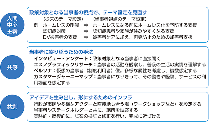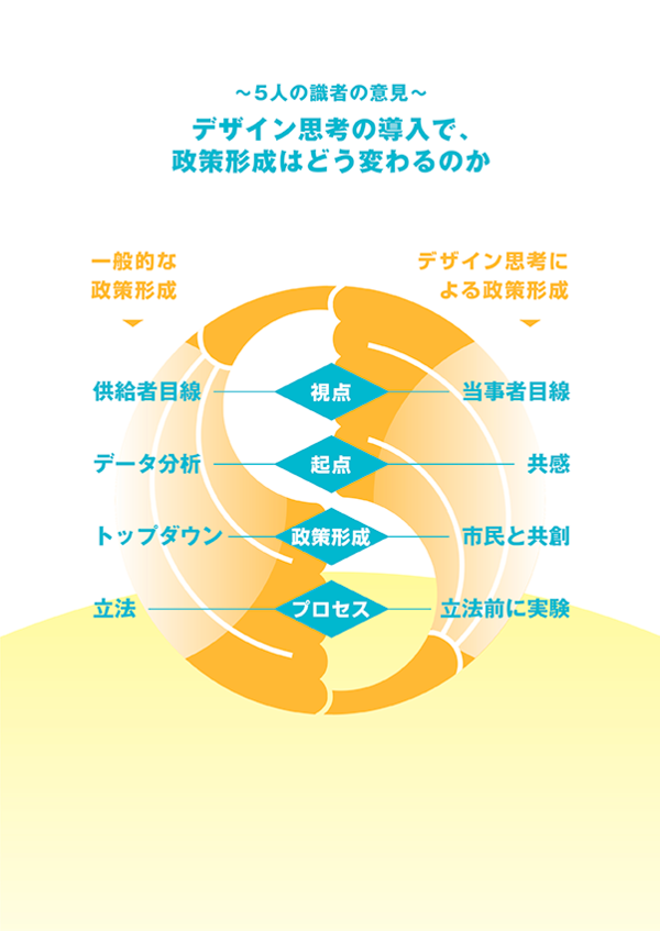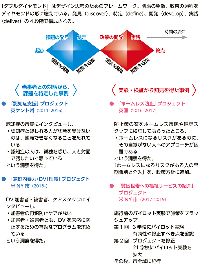 English version わたしの構想No.46 2020.02.10 デザイン思考で人間中心の政策を この記事は分で読めます シェア Tweet 市民の目線で、市民と共に政策形成を行う「デザイン思考」。なぜ今、必要とされるのか、その意義を問う。 PDF(日本語) PDF (ENGLISH) ABOUT THIS ISSUE企画に当たって デザイン思考で人間中心の政策を 現場でのモデル探しが政策イノベーションを生む 宇野重規 NIRA総合研究開発機構理事/東京大学社会科学研究所教授 使う人の視点に立つ「デザイン思考」を適用し、ビジネスの分野ではさまざまなイノベーションがもたらされてきた。近年、公共セクターにおいても、デザイン思考を政策形成に取り入れるアプローチが注目されている。その意義と、実践の課題について、議論する。 EXPERT OPINIONS識者に問う デザイン思考を政策形成に導入する意義は何か。実践の課題は何か。 クリスチャン・ベイソンデンマーク・デザイン・センターCEO 奥村裕一一般社団法人オープン・ガバナンス・ネットワーク代表理事 長谷川敦士株式会社コンセント代表取締役/武蔵野美術大学大学院造形構想学科教授 佐宗邦威株式会社BIOTOPE CEO/チーフ・ストラテジック・デザイナー 澤田有希子Policy Lab. Shiga(滋賀県) インタビュー実施:2019年11月~12月インタビュー:北島あゆみ(NIRA総研研究コーディネーター・研究員) データで見る デザイン思考の構成要素 EU内で活動する政策ラボの、政策課題別プロジェクト数(2016年) 「デザイン思考」4つの成功事例ーダブルダイヤモンドの枠組で考える 企画に当たって デザイン思考で人間中心の政策を 現場でのモデル探しが政策イノベーションを生む 宇野重規 NIRA総合研究開発機構理事/東京大学社会科学研究所教授 KEYWORDS 参照すべきモデル、ユーザーが使いたくなるデザイン、新たな発想の源泉、行政の覚悟、柔軟性と行動力が試金石 かつて政策を構想するにあたって、参照すべき「モデル」が常に存在した。欧米諸国をモデルに近代化を推進した明治期の日本政府はもちろん、近年に至るまで、「先進事例」こそが政策の推進にあたっての最大の参照軸であった。しかしながら現在、そのような「モデル」は見いだしにくくなっている。単線的な近代化のイメージは過去のものとなり、むしろさまざまな現場において課題が発見され、解決策が模索されている。とはいえ、明確な「モデル」があった時代と比べ、課題も解決も多様化し、問題は難しくなるばかりである。このような時代にふさわしい新たな考え方は存在しないのだろうか。本構想で提示するのがデザイン思考である。 政策の当事者である市民の目線に立つ デンマーク・デザイン・センターCEOのクリスチャン・ベイソン氏は、デザイン思考を「『人間中心』の製品・サービス・ソリューション・体験を作り出すための方法、過程、そして手段」と定義する。これまでの政策形成がデータ収集、分析、合理的な解の発見にあったとすれば、デザイン思考はむしろ政策のエンドユーザーである市民や企業の目線に立つ。その上でアイデアを共に創出し、それを繰り返し実験しながら政策を作り上げる。このようなデザイン思考が英国や北欧諸国などで試みられているという。 オープン・ガバナンス・ネットワーク代表理事の奥村裕一氏も同様に、「行政の供給者目線」ではなく、「市民に届く政策とは何であるかを、市民とともに、『共感』を軸に据えて考えていく」ことを強調する。例えばホームレスの当事者の話に耳を傾け、生活の現場を観察する。虐待を受けている子どもの目に、児童養護施設や児童相談所がどう見えるかを考える。対話や観察を通じて、本人さえ気付いていない本音を探り出すことが目的だ。政府がデータを公開し、デザイン思考の下で市民とともに実験を行うことが求められる。 日本でも取り組みが始まった このようなデザイン思考が求められている時代背景は何か。株式会社コンセント代表取締役で武蔵野美術大学大学院造形構想学科教授の長谷川敦士氏は、現代が「変化が大きく、先行き不明瞭、課題は複雑化しており、確実な正解が何かわからない」時代だからだという。このような予測不可能な時代であるからこそ、不確定な未来のために布石を打つことが必要であるが、日本の行政は「リスクを取る」のが苦手である。小さな実践の結果から仮説を導き出し、それを再適用する「アブダクション(仮説形成)」は、まさにこのような現代に適した思考法だろう。 すでに実践例もある。株式会社BIOTOPEのCEOである佐宗邦威氏は、多摩川流域の未来ビジョンをつくるための市民参加型プロジェクトを実施している。多摩川流域という特性を生かしてどのように働いたり、遊んだりできるか。ライフスタイルを起点とするデザイン思考の下、流域の住民と企業、そして行政をつなぐ試みは貴重だろう。行政の中立の原則から、特定市民の声を取り上げるわけにはいかないため、政策ラボのような中立的な組織を作る必要があるという指摘も