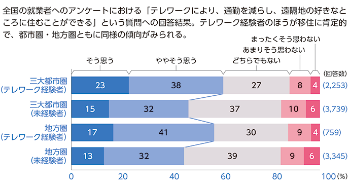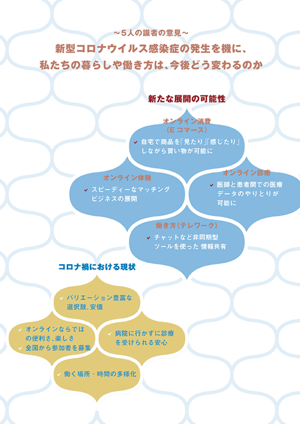 English version わたしの構想No.49 2020.08.10 変容する暮らしと働き方 この記事は分で読めます シェア Tweet 新型コロナウイルス感染症の発生で、テレワークやオンライン診療などが急速に広まった。暮らしや働き方は今後どう変わるのか。 PDF(日本語) PDF (ENGLISH) ABOUT THIS ISSUE企画に当たって 新型コロナウイルス感染症で変容する暮らしや働き方 今後求められる企業のあり方とは 東和浩 NIRA総合研究開発機構理事/株式会社りそなホールディングス取締役会長 新型コロナウイルス感染症の発生で、人との接触や移動に対する自粛要請が出され、テレワークやオンライン診療などが急速に広まった。この経験を経て、私たちの暮らしや働き方は今後どう変わるのか。 EXPERT OPINIONS識者に問う 新型コロナウイルス感染症の発生により、どのような変化が起きているか。今後、暮らしや働き方はどう変わるのか。 アレクサンダー・ファーフニック株式会社天喜ジャパン代表 上田祐司株式会社ガイアックス代表執行役社長/一般社団法人シェアリングエコノミー協会代表理事 原聖吾株式会社MICIN代表取締役CEO 青野慶久サイボウズ株式会社代表取締役社長 鳥居大祐株式会社みらい翻訳COO兼CTO インタビュー実施:2020年6月インタビュー:渡邊翔太(NIRA総研研究コーディネーター・研究員)、北島あゆみ(同) データで見る Eコマース消費指数の2020年1月後半からの変化率(2020年4月後半ー6月前半) オンライン体験参加者数(2020年3月ー5月):(株)ガイアックスの事例 道府県別にみたオンライン診療の実施率(2020年7月) テレワークを経験した人の移住意識(2020年6月) 企画に当たって 新型コロナウイルス感染症で変容する暮らしや働き方 今後求められる企業のあり方とは 東和浩 NIRA総合研究開発機構理事/株式会社りそなホールディングス取締役会長 KEYWORDS IT活用の浸透、オンラインサービスならではの価値、選択の幅広さ、アクセスの容易さ、情報の精緻さ、便利さ、生活の質の向上、生活変容、オンラインとオフラインの最適な組み合わせ、企業の活路 新型コロナウイルスの感染拡大は世界を一変させた。世界の感染者数は1,400万人を超え、日本国内の感染者数は約25,000人となった(WHO・厚生労働省、7月21日現在)。日本では2020年4月7日、まず7都府県に緊急事態宣言が発令され、その後全国に拡大して、人と人との接触を伴うサービスや働き方への対応が求められた。経済、医療、教育などのあらゆる活動を今まで通りに行うことが困難となる中で、これまで長らく活用の効果がうたわれながらも、導入が進まなかったテレワークやオンライン教育・診療などのIT活用が、一気に浸透した。 今回の危機発生により、私たちの暮らしや働き方には、実際にどのような変化が起きたのか。そして、今後、暮らしや働き方、人びとの価値観、企業のあり方などはどのように変わろうとしているのか。現場でサービスを提供している5名の経営者の方々から話を伺った。 オンラインサービスは単なる代替手段ではない 今回、感染予防のために従来の対面でのサービスが制限される中で、一気に、オンラインサービスの導入が進んだ。識者は一様に、オンラインサービスは対面サービス(オフライン)の代替手段にとどまらないことを、強調する。オンラインサービスには、選択の幅広さ、アクセスの容易さ、情報の精緻さの点で、オフラインをしのぐ付加価値があるという。 株式会社天喜ジャパン代表のアレクサンダー・ファーフニック氏は、Eコマース(EC)の良さは、選択肢が圧倒的に多いことと価格面の魅力、と述べている。日本ではこれまで、ECはリアルな店舗の代替手段にすぎなかったが、今後、「買い物に行くときに経験するさまざまな楽しさ」にまで踏み込むことが、ECの新たなテーマであるとする。 また、イベントやレジャーの消費にも変化が生まれている。オンラインによる体験教室や記者会見等のサービスを始めた株式会社ガイアックス代表執行役社長の上田祐司氏は、「今まではリアルで行ってきた体験をオンラインでやってみて初めて、オンラインだからこそ享受できる便利さ、楽しさがあることに皆が気づいた」と主張する。これまでは、実際に会ったり、同じ場所で体験したりすることに価値があると思われていたが、実はオンラインでも体験は共有でき、また、距離や時間などの制約も取り除かれる便利さに気づいたのだという。自宅から気軽に他者との体験を共有できるようになれば、人びとの生活はより豊かなものとなるだろう。 医療のあり方も、大きく変わりそうだ。今回、オンライン診療を活用できたからこそ、安心して医師の診療を受けることができた人が少なからずいたようだ。株式会社MICIN代表取締役CEOの原聖吾氏は、「対面での診察が何よりも安全や安心のよりどころになる、という患者の意識が変わった」と指摘している。さらに、オンライン診療には、これまでの「医療」の概念を変える可能性もあるという。病院には身体の調子が悪くなってから