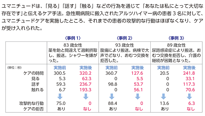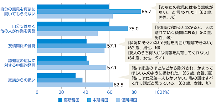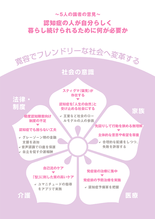 English version わたしの構想No.47 2020.04.10 認知症の人が自分らしく生きる社会に この記事は分で読めます シェア Tweet 高齢化の進展に伴い、認知症の人が増加している。認知症の人が自分らしく暮らし続けられるために、いま社会に何が求められているのだろうか。 PDF(日本語) PDF (ENGLISH) ABOUT THIS ISSUE企画に当たって 認知症の人が自分らしく生きる社会に 当事者の尊厳が保たれる社会のあり方とは 翁百合 NIRA総合研究開発機構理事/日本総合研究所理事長 高齢化の進展に伴い、認知症の人が増加している。いまの社会に、認知症の人が自分らしく暮らし続けられる準備は整っているだろうか。早急の取り組みが求められている。何が必要か、議論する。 EXPERT OPINIONS識者に問う 認知症や周囲の人びとが抱える課題は何か。当事者が尊厳をもって暮らしていくために、何が必要か。 岩坪威東京大学大学院医学系研究科教授 ペールエリック・ヘーグべリ駐日スウェーデン王国特命全権大使 駒村康平慶應義塾大学経済研究所ファイナンシャル・ジェロントロジー研究センター長 前川智明株式会社エクサウィザーズCare Tech部長 下河原忠道株式会社シルバーウッド代表取締役 インタビュー実施:2020年1月~2月インタビュー:榊麻衣子(NIRA総研研究コーディネーター・研究員)、北島あゆみ(同) データで見る 年齢別に見た認知症の有病率(2012年時点) アルツハイマー病が発症するまでの経過 差別を受けたと答えた人の割合:認知症患者、家族、ケアワーカーに聞く ユマニチュードの効果測定 企画に当たって 認知症の人が自分らしく生きる社会に 当事者の尊厳が保たれる社会のあり方とは 翁百合 NIRA総合研究開発機構理事/日本総合研究所理事長 KEYWORDS 超高齢社会、認知症、本人の生活の質の低下、社会や経済への影響、分野横断的に共生社会を築く 今から5年後の2025年、団塊の世代がすべて後期高齢者になり、日本にいよいよ超高齢社会が到来する。この年の認知症患者は700万人程度との予想であるが、その後、後期高齢者が増えるため、その人数は急増する見込みである。認知症の人たちへの適切な対応を社会として考えていかなければ、本人の生活の質が低下してしまいかねないほか、その家族の働き方にも影響を及ぼす懸念がある。また、社会や経済への影響も大きく、人手不足の介護制度を維持していくことや、交通事故の増加、金融資産の不動化にどう対処するかなど、課題が山積している。これから急増する認知症の人たちと、どう共生していくかが、これからの日本社会にとって重要であることは間違いない。日本でも、省庁、自治体や医学界だけでなく、産官学が協力して、分野横断的に認知症の人と共に生きる社会を築く重要性が、成長戦略などにも盛り込まれているが、具体的な検討や取り組みはこれからである。そこで、本号では、この課題に取り組んでいるさまざまな分野の方々に、専門分野からみて、認知症の人たちへの現状の対応で何が足りないと考えているか、そして、どのように共生社会を築くべきかについて、ご意見を伺った。 認知機能低下の治療薬が出現する可能性 まず、認知症について、医学的にはどう捉えられているのか。また、その予防や特効薬はなかなか出現が難しいという見方が多いが、そうした見方は正しいのだろうか。この点について、認知症研究で知られる東京大学の岩坪教授は、アルツハイマー型の認知症は脳の老化により、ある種のたんぱく質が脳にたまることが原因であること、そして、治療薬開発は難しいとされてきたが、近年アルツハイマー病の認知機能低下の治療薬が出現する可能性が出てきていることを指摘する。そして、治療薬の早い段階からの投与が予防的な効果を持つことへの期待を明らかにしている。私たちは認知症を誰もがかかる可能性のある自然な老化現象の1つと受け止める必要がある。一方、認知症の治療薬の開発は、今後の高齢社会にとって優先度の高い取り組みであり、これを政策的にもサポートすることが求められるだろう。 先進国では認知症の人と共生する社会を目指す動きが近年広がりをみせている。最も先進的な動きと考えられるのが、スウェーデンのDementia Forum Xである。スウェーデン王室のシルビア王妃が旗を振り、医療研究で世界最高峰の1つとして知られるカロリンスカ研究所が認知症の人たちに関するさまざまなエビデンスを提供し、産官学が一緒になって認知症の人が自立して生活しやすい環境づくりを目指している。例えば家具メーカーのイケアは、高齢者でも住みやすい住宅づくりなどに貢献している。これに関して、スウェーデン大使のヘーグベリ氏は、この取り組みには「認知症のある人はサポートを受ける権利がある」という精神があると紹介する。そして、この活動において、認知症の人たちは、社会から敬意をもって遇され、その家族が支援される。実際、スウェーデンでは、頼れる人が周りにいなくても、認知症の人の身の回りすべ