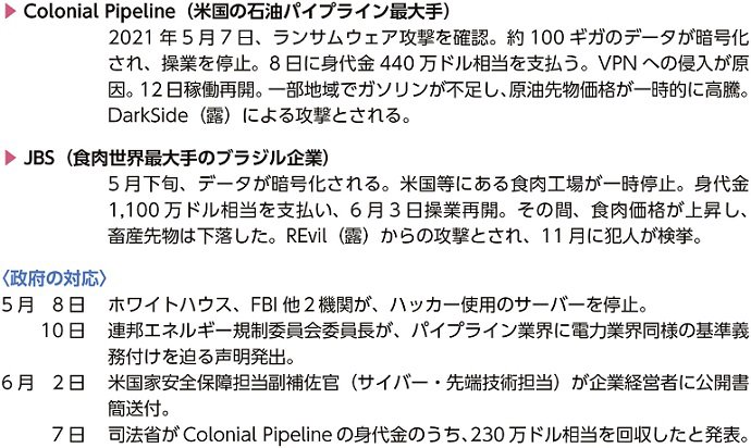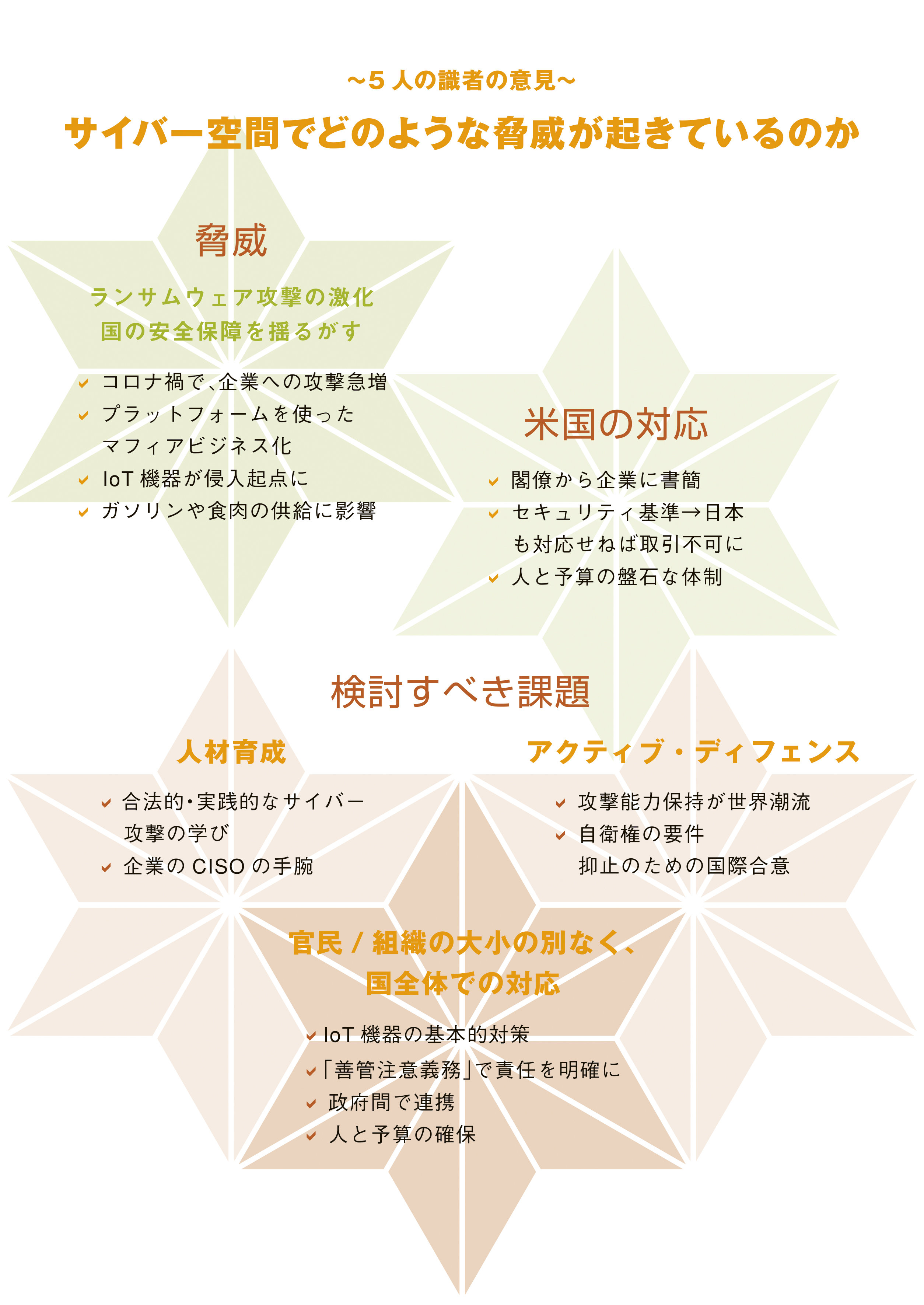 English version わたしの構想No.57 2021.12.10 日常化するサイバー攻撃、問われる官民の責務 この記事は分で読めます シェア Tweet コロナ禍でテレワークやオンラインサービスなどITシフトが急速に進む一方で、サイバー空間を巡る脅威は深刻さを増している。いま、何が起きているのか。 PDF(日本語) PDF (ENGLISH) ABOUT THIS ISSUE企画に当たって DX下のサイバー攻撃、対策急務 経済や社会に致命的な影響の恐れ 柳川範之 NIRA総合研究開発機構理事/東京大学大学院経済学研究科教授 コロナ禍でテレワークやオンラインサービスなどITシフトが急速に進む中で、サイバー空間を巡る脅威が極めて深刻なものとなってきた。官民を問わずサイバー攻撃に晒されているだけでなく、その脅威の次元がこれまでとは異なるものになってきたとされる。サイバー空間でどのような脅威が起きているのか。検討すべき対策は何か。サイバーセキュリティの最前線で活躍する専門家に聞いた。 EXPERT OPINIONS識者に問う サイバー空間でどのような脅威が起きているのか。検討すべき対策は何か。 村島正浩株式会社イエラエセキュリティ ペンテスター 西尾素己多摩大学ルール形成戦略研究所客員教授 松原実穂子NTTチーフ・サイバーセキュリティ・ストラテジスト 坂明デジタル庁Chief Information Security Officer(CISO) 神保謙慶應義塾大学総合政策学部教授 インタビュー実施:2021年10月インタビュー:鈴木壮介(NIRA総研研究コーディネーター・研究員) データで見る セキュリティインシデントの報告件数の推移 ランサムウェア:各国の「身代金支払い率」と支払い後の状況(2020年) 米国のランサムウェア2大事件 サイバー攻撃の拠点国と標的国 企画に当たって DX下のサイバー攻撃、対策急務 経済や社会に致命的な影響の恐れ 柳川範之 NIRA総合研究開発機構理事/東京大学大学院経済学研究科教授 KEYWORDS デジタル・トランスフォーメーション(DX)、実践的な対策、専門人材の育成 サイバー空間のセキュリティについて、その重要性はかなり以前から指摘されてきた。しかし、ここへきて、今までとはかなり違う次元で、さまざまな問題が生じるようになってきている。にもかかわらず、それらについての意識が、まだ社会全体に十分には広まっていないように思われる。そこで今回の「わたしの構想」においては、今、サイバーセキュリティが抱える課題と重要ポイントについて、専門の識者の方々に語っていただいた。 急速なデジタル化を前に、無防備なIoT機器 官民の別なくデジタル化の重要性が叫ばれ、デジタル・トランスフォーメーション(DX)という言葉が頻繁に聞かれるようになったいま、デジタルデータが安全に管理されることの重要性は言うまでもないだろう。特に、業務に不可欠なデータや、生命の安全性に関わるようなデータのセキュリティ向上は、喫緊の課題だ。例えば、医療データがサイバー攻撃によって盗まれたり、改ざんされたりすれば、それが原因で人の命に関わる重大な事態になりかねない。今後、IoTで多くのモノのネットワーク化がより現実的になると、データの改ざんが、企業ひいては社会に致命的な問題を引き起こす可能性も容易に想像できる。 株式会社イエラエセキュリティ ペンテスターの村島正浩氏は、IoT機器が生活の利便性や企業の新しいサービスにとって重要であることを指摘する半面、サイバー攻撃の侵入の起点にもなり得ると警告を鳴らす。村島氏によれば、IoT機器の問題点は、そもそも、基本的な対策すら行えていないケースが多々あることであり、それに対するセキュリティ対策の重要性が指摘されている。 国の安全保障や経済を揺るがしかねない すべての識者が強調するのが、サイバー攻撃は、いまや、1個人や1組織の被害にとどまらない脅威となっているということだ。 デジタル庁CISOの坂明氏は、組織や個人、またインフラなどへの直接的なサイバー攻撃に加え、人びとや国の意思決定に影響を与える攻撃が深刻化しているとして、米国政府が、連邦機関、州や地方政府、さらには軍までが連携して、選挙を守る体制を築いている例を挙げている。また、東京オリンピックにおいても、大会運営システムや大会サイトへの攻撃、偽チケットなどの脅威があり、運営システムの強じん化など、さまざまな対応が取られていたことを明らかにし、デジタル庁は今後も、DXとサイバーセキュリティの両立を目指した政策運営をしていくと決意を述べている。 NTTチーフ・サイバーセキュリティ・ストラテジストの松原実穂子氏は、「ランサムウェア」の脅威が、日本企業にとってまったく人ごとではなく、現実的な課題であると強調する。また、たとえ1社への攻撃でも、国の経済や安全保障への大きな打撃にもつながり得ることが示されたとして、国家安全保障のためにも、日本の政府や企業にとって、今こそ、サイバーセキュリティ対策強化に取り組む絶好のチャンスであるとしている。 日本も、より踏み込んだ対策を検討する時期に 急速