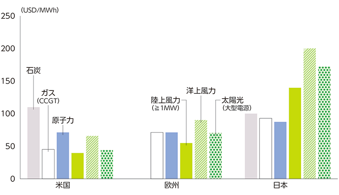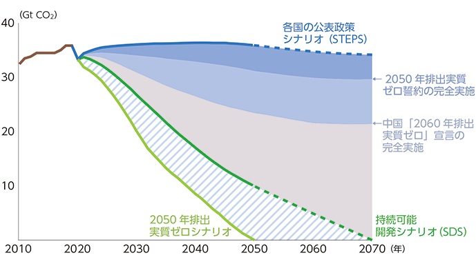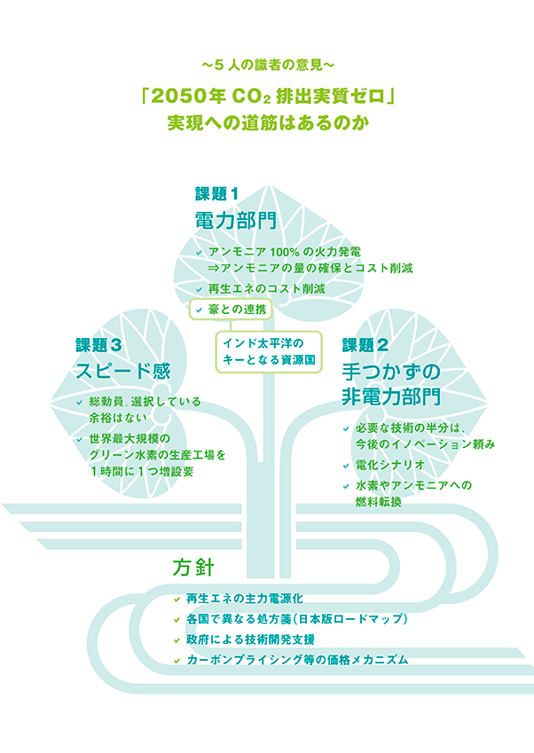 English version わたしの構想No.53 2021.04.10 脱炭素社会 実現への道のり この記事は分で読めます シェア Tweet 2020年10月26日、菅首相は国会の所信表明演説で「2050年カーボンニュートラル」を宣言し、脱炭素に向けた姿勢を鮮明にした。実現に向けた道筋を探る。 PDF(日本語) PDF (ENGLISH) ABOUT THIS ISSUE企画に当たって カーボンニュートラル実現に山積する課題 シナリオを描き時間軸に沿った着実な対応を 翁百合 NIRA総合研究開発機構理事/日本総合研究所理事長 2020年10月、菅首相は国会の所信表明演説で「2050年カーボンニュートラル」を宣言し、脱炭素に向けた姿勢を鮮明にした。「2050年CO2排出実質ゼロ」実現のための課題は何か。実現に向けた道筋はあるのか。内外の専門家に聞いた。 EXPERT OPINIONS識者に問う 「2050年CO2排出実質ゼロ」実現のための課題は何か。実現に向けた道筋はあるのか。 橘川武郎国際大学大学院国際経営学研究科教授 奥田久栄株式会社JERA取締役副社長執行役員経営企画本部長 松村敏弘東京大学社会科学研究所教授 貞森恵祐国際エネルギー機関(IEA)エネルギー市場・安全保障局長 デービッド・ロー在日オーストラリア大使館経済担当公使・参事官 インタビュー実施:2021年2月インタビュー:関島梢恵(NIRA総研研究コーディネーター・研究員) データで見る 世界のCO2排出量:IEA分析による5つの削減シナリオ 各国の1人当たりCO2排出量の推移(1990年-2019年) 各国・地域のエネルギー別発電コスト アンモニアによる火力発電の脱炭素化 企画にあたって カーボンニュートラル実現に山積する課題 シナリオを描き時間軸に沿った着実な対応を 翁百合 NIRA総合研究開発機構理事/日本総合研究所理事長 KEYWORDS 2050年カーボンニュートラル、グリーン成長戦略、COP21パリ協定、SDGs、欧州グリーン・ディール、エネルギーの供給面と需要面の対応、技術革新、産業構造や社会システムの改革、循環型経済、社会のトランジションのシナリオ 2020年10月、菅義偉首相は、国会の所信表明演説で「2050年カーボンニュートラル」を宣言し、その後「グリーン成長戦略」がまとまった。同宣言は、内外に好意的に受け止められたが、この宣言の背景には次のような潮流がある。 まず、2015年の「気候変動枠組条約COP21パリ協定」で、世界の平均気温上昇を産業革命以前に比べて2度より十分低く保つとともに、1.5度に抑える努力を追求することが決められ、温室効果ガスの排出と吸収源による除去の均衡達成に向けて日本も歩み始めていた。また国際金融市場でも、近年多くの機関投資家が国連の「責任投資原則」(2006年)に署名するなど、社会的責任を果たそうという動きが広がり、ESG投資が拡大してきていた。さらに、20年以降の新型コロナウイルス感染症の拡大により、人々の価値観が大きく変化し、消費者レベルでも生物多様性や気候変動リスクへの意識が高まり、15年に国連サミットで採択された「SDGs(2030年を照準とした持続可能な開発目標)」達成への貢献が、一層注目されるようになった。 脱炭素で加速する欧州、復帰した米国。不可逆的な動き コロナ感染が広がる中で、グリーンリカバリー(気候変動を抑制しながら経済を立て直す考え方)で環境と成長の両立を目指す動きが欧州などを中心に一段と加速している。既に欧州は2019年の「欧州グリーン・ディール」で50年までに脱炭素社会を実現することを拘束力のある目標とし、それを成長戦略としており、20年には巨額のEU復興基金を設け一層の戦略推進に舵を切った。欧州では太陽光、水力、風力など再生可能エネルギーへのシフトは既に進んでいるが、さらに最近加速しているのは、再生可能エネルギーなども活用した水素エネルギーへの官民挙げての取り組みである。中国も60年までの脱炭素を宣言した。また、本年、米国大統領に就任したバイデン氏もトランプ前大統領時代に離脱したパリ協定に再コミットし、巨額の財政支援を予定している。日本にとってカーボンニュートラルは厳しい目標とされてきたが、もはや不可逆的な動きだ。そこで今回はこの問題に高い知見をお持ちの内外の専門家の方々に、カーボンニュートラル実現の道筋をどうみているか、そのための課題は何か、についてお話を伺った。 再生エネを補完する脱炭素火力、産業・家庭の電化、価格メカニズムの設計を 国際大学の橘川教授は、現在議論が進む次期エネルギー基本計画に関連し、エネルギー供給について、アンモニアを燃焼させる脱炭素火力を着実に伸ばし、今後、主力電源化していく再生可能エネルギーの「出力変動」という課題を補うことができるようになるかが、脱炭素実現のカギになると述べる。そしてその実現には、アンモニア供給の確保とコストの削減が必要になるとしている。この点、国内最大の発電事業者であるJERAの奥田副社長も、同様の戦略が現実的アプローチであり、再生可能エネルギーも伸ばしつつ、既存の技術や設備を生かしながら、技術変化に応じて円滑なトランジション(移行)