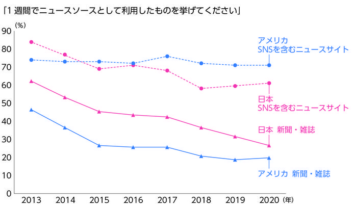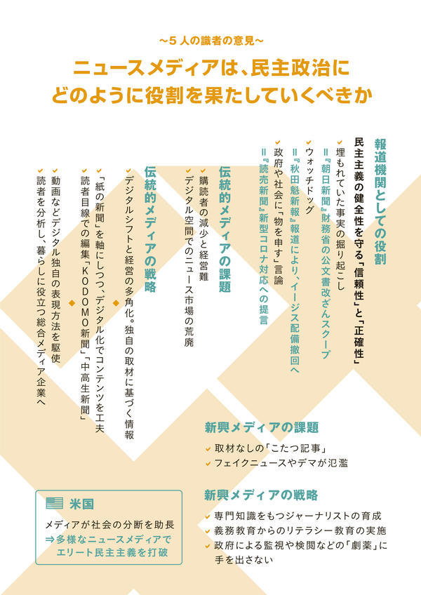 English version わたしの構想No.54 2021.05.10 ニュースメディア 分断なき公共圏を作れるか この記事は分で読めます シェア Tweet メディアの発展は日本の民主政治に大きな影響を与えてきた。しかし、この20年、新聞の発行部数は大きく減少し、インターネットニュースが新たな情報源となっている。今後、ニュースメディアはどうあるべきか。 PDF(日本語) PDF (ENGLISH) ABOUT THIS ISSUE企画に当たって 転換期のニュースメディア 分断なき公共圏を作り、民主政治の健全性を守れ 谷口将紀 NIRA総合研究開発機構理事長/東京大学大学院法学政治学研究科教授 テレビが急速に普及し、また、新聞大国ともいわれた日本。メディアの発展は日本の民主政治に大きな影響を与えた。しかし、いまや、ネットニュースが、新聞やテレビ以上のニュースの情報源となっている。ニュースメディアは、これからの民主政治でどのような役割を果たすべきか。また、メディアの経営戦略はどうあるべきか。二大紙の経営トップ、そして内外の専門家に聞いた。 EXPERT OPINIONS識者に問う ニュースメディアは、これからの民主政治でどのような役割を果たすべきか。また、メディアの経営戦略はどうあるべきか。 老川祥一読売新聞グループ本社代表取締役会長・主筆代理・国際担当(The Japan News主筆) 中村史郎朝日新聞社代表取締役社長 下山進作家/上智大学新聞学科非常勤講師 瀬尾傑スマートニュースメディア研究所所長 ニキー・アッシャーイリノイ大学カレッジ・オブ・メディア准教授 インタビュー実施:2021年3月~4月インタビュー:澁谷壮紀(NIRA総研研究コーディネーター・研究員)、大森翔子(同) データで見る 日本・アメリカの「ニュースを得る際の情報源」の推移 日本・アメリカの「メディアを信頼する割合」 各国のジャーナリストと一般視聴者・読者の「メディアの権力監視認識」 日本の新聞業界を巡る状況の変化 企画に当たって 転換期のニュースメディア 分断なき公共圏を作り、民主政治の健全性を守れ 谷口将紀 NIRA総合研究開発機構理事長/東京大学大学院法学政治学研究科教授 KEYWORDS 新聞の未来、ニュースメディア、ジャーナリズムの本義、民主政治の健全性、二大紙の戦略、公共圏、政治コミュニケーションのインフラ 日本は世界に冠たる新聞大国である。世界の新聞発行部数トップテンには、読売新聞を筆頭に、朝日新聞、毎日新聞、日本経済新聞が名を連ねる。しかし、今や新聞の未来に影がさしている。昨年10月現在の新聞発行部数は約3,500万部で、20年間で約3分の2に減少した。特に若年層の新聞離れは深刻で、新聞通信調査会の調査によると、30歳代以下で新聞を毎日読む人は10%に満たない。論調の左右を問わず、インターネット上の新聞批判も厳しい。 新聞を取り巻く環境の厳しさで先行する米国の事例からは、単なる一業界の消長にとどまらない民主政治への悪影響が懸念される。2020年大統領選の混乱に見られたように、サイバーカスケード、エコーチェンバー、フィルターバブル、フェイクニュースなど、インターネットを通じた政治コミュニケーションの危うさも浮き彫りになった。ジェファソン元大統領による「『新聞なしの政府』と『政府なしの新聞』のどちらかを選ぶとしたら、私は迷わず後者を選ぶ」という格言を、トランプ前大統領はどのように聞くだろうか。 今回の「わたしの構想」は、日本のニュースメディアを守り、民主政治の健全性を保つためには何が必要か、わが国のジャーナリズムを率いる、あるいは国内外でジャーナリズムのあり方に関して卓越した所見を示されてきた5人の識者に意見を伺った。 デジタル時代、ニュースメディアがとるべき戦略は 『2050年のメディア』などの著作で知られる作家・下山進氏の指摘にもあるとおり、日本の新聞、なかんずく政治記者は、政治家や公務員など取材対象と関係を築き、彼らから情報をもらって同業他社に先駆けて記事(特ダネ)にすることに価値を見出してきた。しかし、インターネットが発達した現在では、特オチ(他紙に特ダネを取られること)をしてもすぐにデジタル版で追い付けるから、政や官が持つ情報を抜いた・抜かれたという競争は、もはや読者にとっては大きな意味を持たない。下山氏は、政府が発表しない裏側の事実を明らかにする調査報道こそが、新聞が生き残るための途と主張する。 インターネットメディア『現代ビジネス』の創刊編集長で、現在はスマートニュースメディア研究所所長を務める瀬尾傑氏も、埋もれている情報や表に出ていない問題を人々に提供する調査報道こそが、メディアの信頼回復、そして民主主義を守るために必要という点で軌を一にしている。インターネットにはフェイクニュースなどの問題があるが、だからと言って監視や検閲といった「劇薬」を用いてはならず、人々が多様なメディアの情報を比較検討して正しい判断をできるようにするリテラシー教育を、義務教育段階から行うことが肝心と言う。 良くも悪くも日