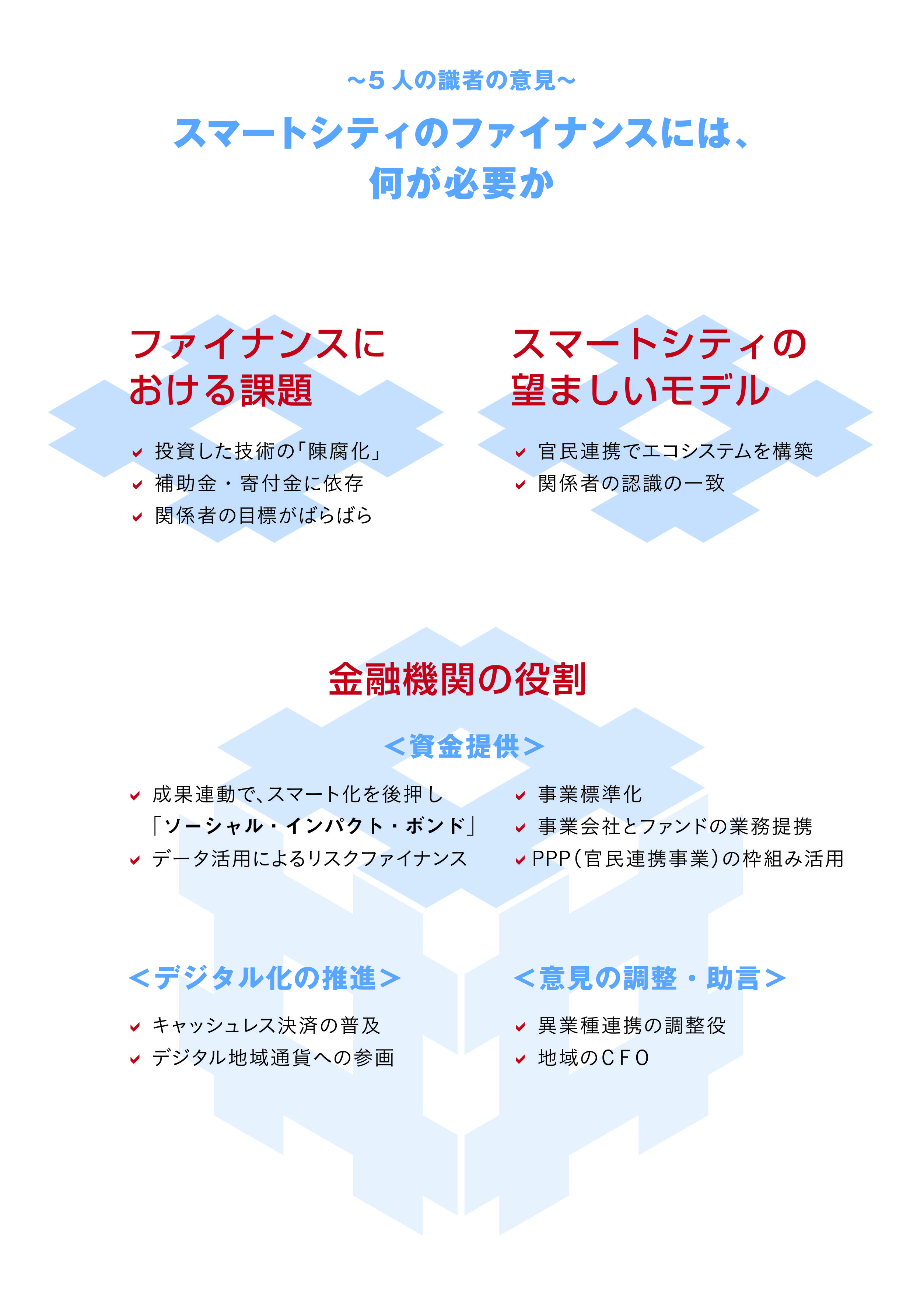 English version わたしの構想No.55 2021.08.11 スマートシティをファイナンスする この記事は分で読めます シェア Tweet スマートシティを一過性のプロジェクトに終わらせず、息の長いプロジェクトに育てるために、金融機関はどのように力を発揮できるのか。 PDF(日本語) PDF (ENGLISH) ABOUT THIS ISSUE企画に当たって スマートシティをファイナンスする 都市の革新に挑戦する金融 東和浩 NIRA総合研究開発機構理事/株式会社りそなホールディングス取締役会長 ICT等の新技術を用いて持続可能な都市の実現を目指すスマートシティ。日本各地で取り組みが進んでいる。しかし、一過性のプロジェクトに終わらせることなく、将来的に事業の継続性や経済性をどう担保していくか、成功への確かな道筋はまだ見えていない。スマートシティのファイナンスにおける課題にどう対応すべきか。都市を革新するために金融機関は何に挑戦すべきか。内外の識者に聞いた。 EXPERT OPINIONS識者に問う スマートシティのファイナンスにおける課題にどう対応すべきか。金融機関に求められる役割は何か。 ランス・カワグチ脳腫瘍治療財団CEO 浅川博人三井住友トラスト基礎研究所上席主任研究員 ダニエル・スタンダー国際連合特別顧問 菊池武晴一般財団法人日本経済研究所イノベーション創造センターセンター長 中村彰二朗アクセンチュア・イノベーションセンター福島センター共同統括マネジング・ディレクター 山本英生株式会社NTTデータ金融事業推進部デジタル戦略推進部長 インタビュー実施:2021年6月~7月インタビュー:鈴木壮介(NIRA総研研究コーディネーター・研究員) データで見る 世界のスマートシティのサービス提供分野 日本のスマートシティ:自治体が考える推進課題 インパクト投資とは 世界各都市の個人情報開示についての市民の反応 企画に当たって スマートシティをファイナンスする 都市の革新に挑戦する金融 東和浩 NIRA総合研究開発機構理事/株式会社りそなホールディングス取締役会長 KEYWORDS リスクと課題、市民の幸福、金融機関の役割、都市の革新 デジタルやICT等の新技術を用いて、より効率的で持続可能な都市を実現しようとするスマートシティ。気候変動への対応など、都市が抱える多様な課題への解決策の1つとなることが期待され、世界各地で取り組みが進む。しかし、成功への道筋はまだ確かではない。先進事例とされたUAEのマスダール・シティはプロジェクトが大幅に延期され、カナダのサイドウォーク・トロントも中止となった。いずれもプロジェクトに市民の共感が得られないことが指摘され、OECDなども新たな経済機会の創出以上に重視すべきは市民の幸福度への寄与としている。スマートシティで何を目指すのか、行政や事業者だけでなく、市民を含めた全ての関係者が認識を一致することが求められる。 本号では、スマートシティのリスクや課題をどう考えるか、特に、ファイナンス面から事業の継続性や経済性をどう担保していくのか。また、日本においても、官民が一体となって進めようしているスマートシティのプロジェクトで、金融機関に求められる役割は何か、6名の識者に話を伺った。 ファイナンスに向けた仕組みづくりが必要 都市は、市民にとって共有地を意味する「コモンズ」である。都市のスマート化によって市民サービスが向上しても、公共性が高いために、建設や整備・管理の費用を市民が直接支払うわけではない。スマートシティの開発は現在、政府の補助金によって主に賄われているが、これから数十年という長い期間で事業を展開していくには、継続的な資金調達が必要となる。ここにスマートシティのリスクや課題があり、その難しさを乗り越える工夫が求められている。 金融機関に25年以上勤務し、世界各地のスマートシティに関わった経験を持つランス・カワグチ氏(脳腫瘍治療財団)は、スマートシティに適した枠組みとして、官民連携である「PPP」を挙げている。当初の資金は政府が出して開発リスクをとり、それを民間金融機関で借り換える形式とする。そこに各種企業が参入し、ビジネスを展開して収益を出すエコシステムを構築することが、望ましいビジネスモデルだという。民間金融機関がより参入しやすくなるための具体的な工夫についても提案しており、参考になる。 スマートシティへの投資手法についての執筆もある浅川博人氏(株式会社三井住友トラスト基礎研究所)は、オーストラリアの資産運用会社が組成・運用する投資ファンドを紹介している。せっかく新技術に投資をしても技術進歩により陳腐化してしまう「技術リスク」に対して、ファンドが特定の技術に秀でた事業会社と業務提携を結ぶことで、連携して対処できるという。また、このスキームは、「提供するサービスを標準化する」ことにもポイントがありそうだ。標準化したサービスを複数の都市に展開することで規模の経済が働き、収益性が向上する可能性がある。 しかし、スキームだけでは限界も