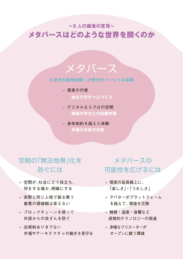 English version わたしの構想No.59 2022.04.08 メタバースが開く〝新〟たな現実 この記事は分で読めます シェア Tweet 「メタバース」と呼ばれるインターネット上の3D仮想空間が、いま、脚光を浴びている。メタバースは私たちの生活をどのように変えるのか。 PDF(日本語) PDF (ENGLISH) ABOUT THIS ISSUE企画に当たって 注目のメタバース、その可能性とは 私たちの生活をどのように変革するのか 谷口将紀 NIRA総合研究開発機構理事長/東京大学教授 「メタバース」と呼ばれるインターネット上の3D仮想空間が、いま、脚光を浴びている。多様な分野への応用が期待されると言われるが、そもそもメタバースとは何なのか、聞きなれない言葉に戸惑う人も多いだろう。メタバースは、私たちの生活をどのように変革し、また、どのような価値をもたらすものなのか。今後、普及していくための課題は何か。わが国の第一線で活躍する識者に問う。 EXPERT OPINIONS識者に問う メタバースは、私たちの生活をどのように変革するのか。普及のための課題は何か。 味澤将宏Facebook Japan株式会社代表取締役 谷口直嗣Holoeyes株式会社取締役兼CTO(最高技術責任者) 稲葉光行立命館大学政策科学部教授 藤井直敬株式会社ハコスコ代表取締役 高木美香経済産業省商務情報政策局コンテンツ産業課長 インタビュー実施:2022年1月~2月インタビュー:大森翔子(NIRA 総研研究コーディネーター・研究員) データで見る 新聞全国紙における「メタバース」(単語)登場回数の推移 世界のAR/VR:市場規模・出荷台数の推移と予測 日本のe-スポーツ:市場規模・ファン数の推移と予測 仮想空間における協調学習の例 企画に当たって 注目のメタバース、その可能性とは 私たちの生活をどのように変革するのか 谷口将紀 NIRA総合研究開発機構理事長/東京大学教授 KEYWORDS 仮想の3次元空間、セカンドライフ、メタバースキャンパス 高次の、という意味の「メタ(meta)」と、世界を表す「ユニバース(universe)」を組み合わせた造語であるメタバース(metaverse)は、1992年に発表されたSF小説Snow Crashが初出とされており、必ずしも新語ではない。ただ、昨秋フェイスブックがメタバースを今後の中核事業にすることを発表し、社名もメタ(Meta Platforms)に替えたことを契機に、一躍、世界の流行語になった。 メタバースの定義は十人十色だが、これまでVR(Virtual Reality・仮想現実)、AR(Augmented Reality・拡張現実)、セカンドライフなどと呼ばれてきた諸技術の汎用性を一層向上させたものというイメージで、取りあえずは当たらずとも遠からずのようだ。VRゴーグルを着用し、仮想の3次元空間に没入して、2次元のモニターに向かうときよりも「リアル」に仕事をしたり、遊んだり、世界各地の人々とコミュニケーションできるようになる。 メタバースでは何ができるのか。そしてメタバースは本当に普及するのか、あるいは普及させるためには何が必要なのか。「わたしの構想」59号では、わが国でメタバース開発・利用の最前線におられる5人の識者に話を伺った。 仮想の3次元空間、さまざまな分野で応用が始まった Facebook Japan株式会社(本稿執筆時点で、日本法人は社名を変更していない)の味澤将宏代表取締役によると、メタバースの特徴は、自分のアバターやデジタルアセットを活用しながら、プラットフォームの間を行き来できる仮想空間のソーシャル体験にある。勤務先の実在のオフィスをメタバース上に再現したプラットフォームを切り替えて、今度は現実には一堂に会し得ない世界各地の同好の士と交流を深めるという具合だ。 メタバースが秘める可能性は、仕事や趣味での人付き合いに限らない。 医療への応用を試みるのが、谷口直嗣取締役兼CTO(最高技術責任者)が率いる医療機器ソフトウエアメーカー・Holoeyesである。臨床データから患者の臓器や血管、腫瘍などのVRを作成し、3次元空間上で手術のシミュレーションやトレーニングを行う。手術をそっくり再現するだけでなく、手術箇所を拡大したり、かつてのヒットSF映画『ミクロの決死圏』のように身体内部に入り込んだりすることも可能になる。 教育分野でのメタバースの活用を研究するのが立命館大学の稲葉光行教授だ。日本と海外の学生に仮想空間上で協調学習させたところ、はじめは戸惑って動きの鈍かった日本人学生が海外の学生に触発されて、次第に自発性を発揮するようになった。また、学生が自分の分身であるアバターを用いることで仮想空間の文脈に没入しやすくなり、プロジェクトに集中しやすくなる効果も見られた。 普及のためのカギは これまでは一部の利用にとどまってきたVR・AR等を、メタバースの名の下に広く社会に行き渡らせるためには何が必要だろうか。1つには、仮想空間をより「リアル」にするためのハードウエアの性能向上とインターネット回線の増強が挙げられる。 それに加えて、スマートフォンを利用したダンボール製ゴーグルを考案、手軽なVR体験を可能にしたハコスコの藤井直敬代表取締役によると、メタ