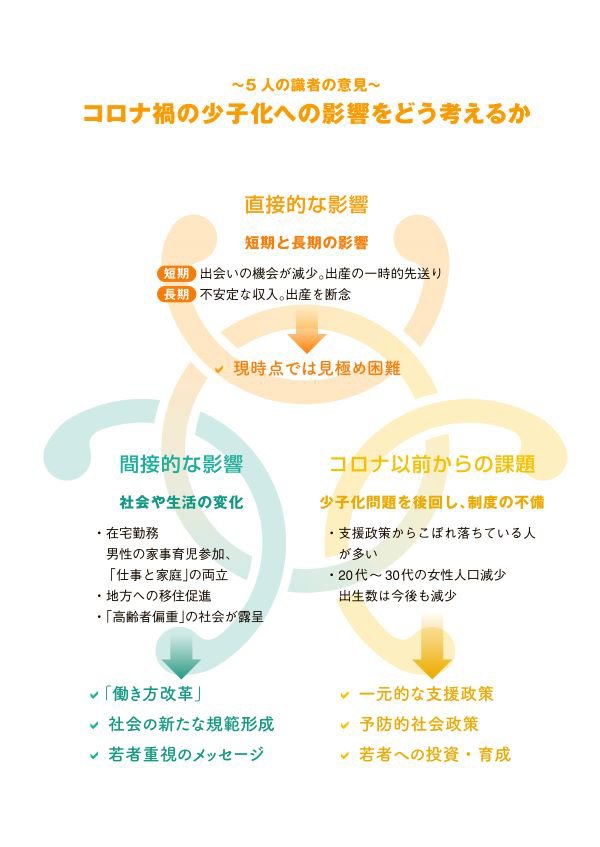 English version わたしの構想No.60 2022.06.10 コロナ禍で懸念される少子化の加速 この記事は分で読めます シェア Tweet 昨年、日本の出生数は約81万人と過去最少を記録した。日本の少子化は、コロナ禍の前からすでに深刻な状況だ。コロナ禍は少子化に影響するのか。 PDF(日本語) PDF (ENGLISH) ABOUT THIS ISSUE企画に当たって コロナ禍で懸念される少子化の加速 若者を重視する政策へのコミットメントを 翁百合 NIRA総合研究開発機構理事/日本総合研究所理事長 コロナ禍がすでに2年を越える中、2021年の出生数は約81万人と過去最少となった。日本の少子化はコロナ禍の前からすでに深刻な状況にあり、さまざまな対策も講じられてきたものの、奏功していない。コロナ禍は日本の少子化に影響するのか。少子化問題にどう対応していくべきか。コロナ禍は、経済や社会生活にも広範な変化をもたらしている。さまざまな点を踏まえ、少子化問題をどう考えるべきか、専門家に聞いた。 EXPERT OPINIONS識者に問う コロナ禍は日本の少子化に影響するのか。少子化問題にどう対応していくべきか。 津谷典子慶應義塾大学教授/同大学グローバルリサーチインスティテュート上席研究員 大竹文雄大阪大学感染症総合教育研究拠点特任教授 山口慎太郎東京大学大学院経済学研究科教授 山崎史郎内閣官房参与兼内閣官房全世代型社会保障構築本部事務局総括事務局長 白波瀬佐和子東京大学大学院人文社会系研究科教授 インタビュー実施:2022年3月~4月インタビュー:関島梢恵(NIRA 総研研究コーディネーター・研究員)、北島あゆみ(同) データで見る 日本女性の年齢階級別の出生率の変化(2019年-2021年) 日本の自殺数の変動(2019年-2021年) 在宅勤務が男性の家事・育児参加に与えた効果 ミュルダールの思想と人口政策への展開 企画に当たって コロナ禍で懸念される少子化の加速 若者を重視する政策へのコミットメントを 翁百合 NIRA総合研究開発機構理事/日本総合研究所理事長 KEYWORDS 出生数の減少、少子化のトレンド、若者重視の政策 日本の2021年の出生数は約81万人と推計され、合計特殊出生率は2020年で1.3まで低下している(※2022年7月19日当記事を更新)。2015年の段階では100万人を超えていた出生数は、その後急速に減少してきており、実は新型コロナウイルス感染症の流行前から、出生数は縮小の一途をたどっていたのである。もちろん、近年政府もさまざまな政策を講じている。安倍政権は希望出生率1.8を適えることを政策目標として掲げ、待機児童の解消加速化プランの下で保育所整備を積極的に行い、幼児教育や保育の無償化も実現した。続く菅政権では、不妊治療の保険適用実現に動き、2021年には男性の育児休業取得を推進する新しい法律が国会を通っており、他にもさまざまな努力が重ねられてきた。しかし、少子化のトレンドは残念ながら変えることはできず、2020年以降の新型コロナ感染症の流行の影響で、少子化がさらに加速する可能性が指摘されている。 少子化は、経済や社会保障に深刻な影響 少子化は日本社会の未来に極めて深刻な影響を及ぼす。少子化により、国内市場が縮小するだけでなく、働き手も減り、経済自体の存続にもかかわってくる。特に今後の十数年間の生産年齢人口の減少は、デジタル化などの生産性向上だけでは、潜在成長力の低下を補いきれないことが予想されている。人口動態は長期まで見渡せるため、現状においても、企業の設備投資は国内市場縮小を考慮して消極的にならざるを得ない。また消費者も、社会保障の持続可能性に不安を持ち、消費になかなか積極的になれなくなる。希望出生率1.8が実現できるよう、政府は本格的に対応を考える必要があるのではないか。そこで、今回の「わたしの構想」では、新型コロナ感染症拡大が少子化に与えうる影響とその受け止め、また少子化の流れを変えるための政策などについて識者の方に伺った。 コロナ禍の影響をどう考えるか まず、新型コロナ禍の少子化への影響について、人口学の視点から津谷典子氏(慶應義塾大学教授)は、コロナによる先行き不安から、妊娠・出産の先送りが起こり、それが産み控えとなって、出生率低下につながることを憂慮する。特に日本の問題点は、もともとコロナ以前から20代~30代の女性が減少傾向にあり、これに加えて、「晩産化」が進んでいるため、コロナによる出産先送りが人口減少に拍車をかけるのではと、警鐘を鳴らす。コロナ禍の少子化進行は長期的に大きな影響が及ぶ可能性があるという指摘だ。また、政府の新型コロナウイルス感染症対策分科会に参加し、行動経済学の視点からコロナ対応を分析、提言してきた大竹文雄氏(大阪大学特任教授)は、政府のコロナ対策の少子化への影響について懸念を示す。特にオミクロン株は、重症化リスクが高齢者と基礎疾患がある人に限られていることがエビデンスとして判明してきたのに対し、日本では英国などとは異なり、行動制限を年齢にかかわらず一律に強化した。若者や子ど