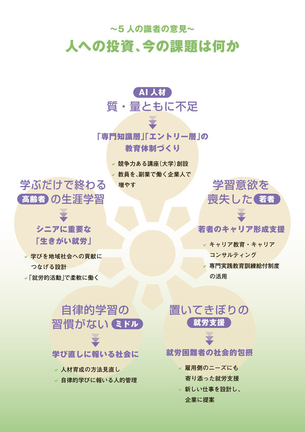 English version わたしの構想No.63 2022.12.16 各人の課題の違いに着目した「人への投資」を この記事は分で読めます シェア Tweet 政府が進める「人への投資」。若者、中高年、高齢者などの年齢や、置かれている状況によって、課題はそれぞれ異なる。どのようなニーズの違いがあるのか。効果的な政策は何か。 PDF(日本語) PDF (ENGLISH) ABOUT THIS ISSUE企画に当たって 「人への投資」、求められる政策は 年齢や環境に応じたきめの細かい対策を 柳川範之 NIRA総合研究開発機構理事/東京大学大学院経済学研究科教授 「新しい資本主義」の実現を掲げる政府は、そのカギとなる人への投資を強化する方針を打ち出した。「人への投資」と一言でいっても、若者、中高年、高齢者などの年齢や、置かれている状況によって、課題はそれぞれ異なるだろう。政策の効果を高めるには、それぞれのニーズが何かを見極め、きめ細やかに投資を実行していく必要がある。人により、どのようなニーズの違いがあるのか。効果的な政策は何か。さまざまな年齢や状況の能力開発に詳しい専門家に聞いた。 EXPERT OPINIONS識者に問う 人への投資、人によるニーズの違いはあるのか。効果的な政策は何か。 筒井美紀法政大学キャリアデザイン学部教授 小杉礼子労働政策研究・研修機構研究顧問 三輪卓己桃山学院大学経営学部教授 藤原佳典東京都健康長寿医療センター研究所研究部長 内山泰伸立教大学大学院人工知能科学研究科研究科委員長・教授 インタビュー実施:2022年10 月インタビュー:北島あゆみ(NIRA 総研研究コーディネーター・研究員)、関島梢恵(同) データで見る 高齢期の就労動機と生活機能の悪化リスク 正社員の自己啓発の実施状況 教育訓練給付の種類と受給者数の推移 スウェーデン大都市圏調整協会(MCA)のComplementary Working Life プログラム 企画に当たって 「人への投資」、求められる政策は 年齢や環境に応じたきめの細かい対策を 柳川範之 NIRA総合研究開発機構理事/東京大学大学院経済学研究科教授 KEYWORDS 人材投資、能力開発、きめ細やかさ 近年になって、人材投資の重要性があらためて注目されている。デジタル化の進展やAIの発達等によって、産業構造が急速に変化している中で、新たな環境に適応した能力開発の重要性が指摘されている。これは、世界的な傾向だ。また、日本経済の長引く低成長という環境下において、日本企業が能力開発に時間や労力を割けなかったという指摘もされている。このような中で、日本政府も「人への投資」ということで、人材投資を促進するような政策を打ち出している。 しかしながら、「人への投資」、つまり人材投資といっても、考えるべきポイントはかなり多様である。デジタル化に適応して、例えば最先端のデータサイエンスに長けた人材が必要とされている面もあるが、一方で非正規雇用のために能力を開発する機会が得られない人に対するサポートが必要になっている面もある。同じく「人材育成」といっても、両者で求められるものはずいぶん異なる。また、中高年のセカンドキャリアを充実したものにするための能力開発も近年その必要性が指摘されているが、ここで求められている人材投資は、デジタル化や非正規雇用への対応とも異なるものだろう。このように、それぞれの立場や環境によって、一言で人材投資といっても求められるものは変わってくるため、政策を考える際には、かなりきめの細かい対応が必要になる。 就労困難な人や若者の能力開発をいかに支援していくか 今回の企画に当たっては、このような問題意識に立って、それぞれの専門の立場からみた必要な人材投資について、議論をしていただいた。まず、筒井美紀法政大学キャリアデザイン学部教授は、就労支援という側面から、この問題を論じている。人材育成というと、どうしても、企業が利益を拡大させるために、従業員にどんな能力を身に着けさせるかという点に焦点があたりがちだ。しかし、社会全体から考えると、就労を希望しているが、就労が困難な状況にある方々に、いかに適切な教育訓練を実施していくべきかというのは、重要な論点だ。この点について、人が働いて社会に貢献して承認される「社会的包摂」の意義があると主張されている。ただし、さまざまな困難を抱える人の就労はどうしても低賃金になる傾向があり、そのため生活保障とセットで考えることの必要性が強調されている。 小杉礼子労働政策研究・研修機構研究顧問は、若者のキャリア形成支援に焦点をあてている。非正規の若者の多くは、正社員に吸収され雇用環境は改善している。しかし、そうした中でも生産性や賃金水準が低い分野で働く正社員や、キャリアの展望が持てずに意欲が低下している若者がいる。今、彼らに目を向けるべきだと指摘している。こうした若者たちに能力開発が必要なのは当然だが、それにはキャリアコンサルティングなどの支援を伴う必要があるというのは現実を踏まえた重要な指摘だろう。そ