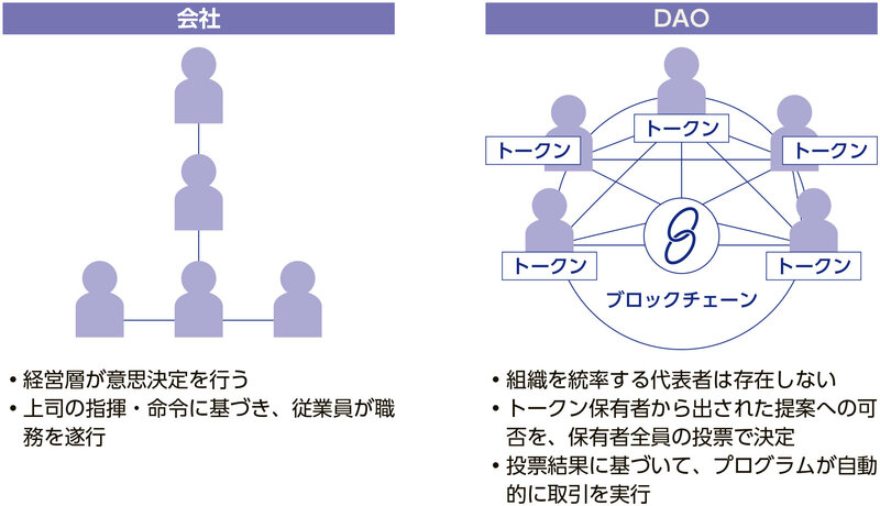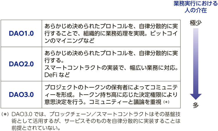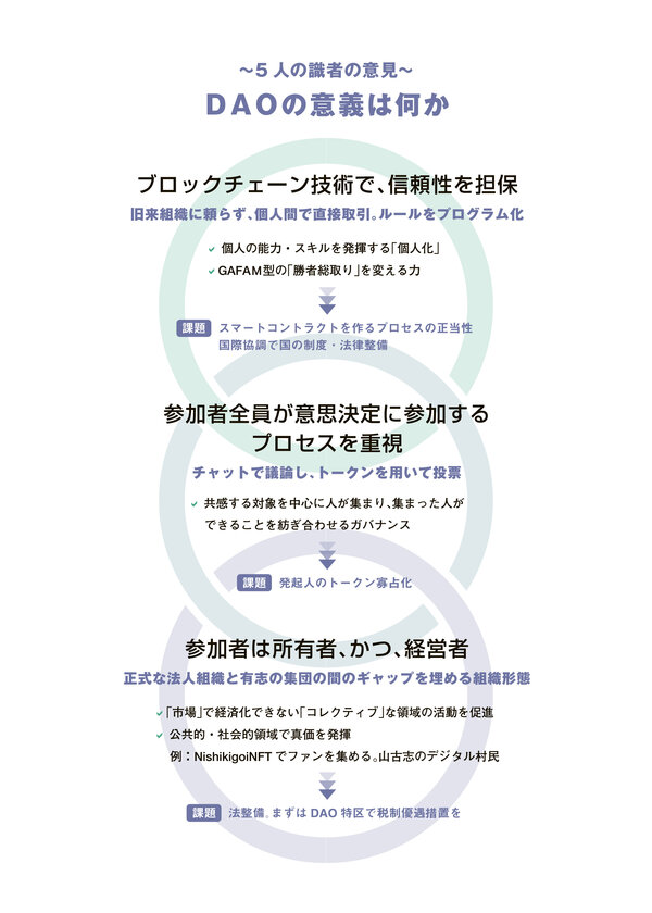 English version わたしの構想No.64 2023.02.10 DAOの世界をけん引する先駆者の期待と懸念 この記事は分で読めます シェア Tweet ブロックチェーン技術を活用することで、これまでの組織のあり方や意見の合意方法が大きく変わろうとしている。新しい組織形態であるDAOが社会にもたらす意義とは。 PDF(日本語) PDF (ENGLISH) ABOUT THIS ISSUE企画に当たって DAOの意義は何か 社会的課題の解決に新しい可能性 宇野重規 NIRA総合研究開発機構理事/東京大学社会科学研究所教授 ブロックチェーン技術によって、これまでの組織のあり方や意見の合意方法が大きく変わろうとしている。Web3.0の主軸となるのが、分散型を意味するDecentralizedと、自律を示すAutonomousの両方の性質を合わせもつ、DAOという新しい組織形態だ。DAOが私たちの社会や経済にもたらす意義や可能性は何か。予想される課題は何か。情報社会やブロックチェーン技術に精通する専門家に聞いた。 EXPERT OPINIONS識者に問う DAOの意義や可能性は何か。予想される課題は何か。 高木聡一郎東京大学大学院情報学環教授 吉川絵美米リップル社戦略担当バイスプレジデント 赤澤直樹Fracton Ventures株式会社Co-Founder/CTO 若林恵黒鳥社コンテンツ・ディレクター 竹内春華山古志住民会議代表 インタビュー実施:2022年12月~2023月1月インタビュー:鈴木壮介(NIRA総研研究コーディネーター・研究員)、川本茉莉(NIRA総研主任研究員) データで見る DAOの組織のあり方 DAOの変遷 DAOの種類 地域活性化をめざす山古志DAO 企画に当たって DAOの意義は何か 社会的課題の解決に新しい可能性 宇野重規 NIRA総合研究開発機構理事/東京大学社会科学研究所教授 KEYWORDS Web3.0、新しい組織のあり方、社会的課題解決の新たなツール DAO(Decentralized Autonomous Organization:分散型自律組織)への注目が集まっている。DAOとは、株式会社とも、ボランティア組織とも区別される、Web3.0の分散型インターネット時代にふさわしい、新たな組織のあり方を指す。特定の所有者や管理者がいなくても、ブロックチェーン上でメンバーが主体的にプロジェクトを推進し、管理することができる点に特徴があり、新たな社会的課題解決のツールとしても活用が期待されている。 「個人化」の仕組み、経済活動の幅を広げる 東京大学大学院情報学環教授の高木聡一郎氏は、DAOの本質に「個人化」を見出す。DAOの第1世代であるビットコインは、ブロックチェーン技術によって、アルゴリズムの信頼性を担保に、個人と個人が世界規模で業務分担したり、取引したりすることを可能にした。特に近年のプロセス重視のDAOでは、独自のコインである「ネイティブトークン」を用いて、意思決定のための投票や権利行使を実現するなど、コミュニティーの機能がより重視されている。挙げられている不動産運用のDAOも、個々のメンバーが能力やスキルを発揮する「個人化」の事例として興味深いだろう。一方で、プロジェクトの発起人がネイティブトークンを寡占化して大きな権限を持つ可能性も指摘されている。 米リップル社戦略担当バイスプレジデントの吉川絵美氏は、DAOが経済活動を促進し、全体的に経済のパイを拡大させると考える。注目されるのは、「GAFAM」に代表される、デジタル経済における「勝者総取り」的な市場独占を変える力だ。DAOは、メンバーの投票を通じて、組織のミッションと参加者のインセンティブを調整することで、規模は小さくても質の高い経済や、エンゲージメントに重点を置いた経済活動を可能にする。スキルがあれば、匿名・仮名であっても、世界のどこでも活動できる「DAOワーカー」という選択肢も可能になる。ただし、日本は、米国と比較して制度面で遅れており、国際的な協調を図りながら法整備を進めていく必要性も指摘されている。 協働の新しいツール、参加者の力を紡ぎ合わせる Fracton Ventures株式会社 Co-Founder/>CTOの赤澤直樹氏は、DAOが人と人との協力・協働のための新しいツールであるという。現在、活発に行われている事業投資やコレクション購入の場合、投資リターンの分配や全体への還元について、メンバー間の事前の合意をプログラミングすることで、取引の執行が自動的に行われる(スマートコントラクト)。またトークンを購入することでDAOに参加できるため、「経営」と「所有」がより一体化する。DAOが高度化・成熟化することで、既存の民主政治のプロセスを補完する形で社会福祉を充実させる可能性もある。スマートコントラクトを作るプロセスの正当性の確保など課題は多いが、今後、DAOを一般の人が安全に参加でき、持続可能なものにしていくことが必要だろう。 黒鳥社コンテンツ・ディレクターの若林恵氏は、DAOを官僚制度に対置される統治(ガバナンス)の方式とした上で、「アウトプット=完成形」だけでなく、「参加」や「貢献」といった「プロセス」が重要であると説く。ヒントになるのはファンダム(ファン集団)だ。アイドルグループのファンたちは、自律的にコミュニティーに参加し、各自が
