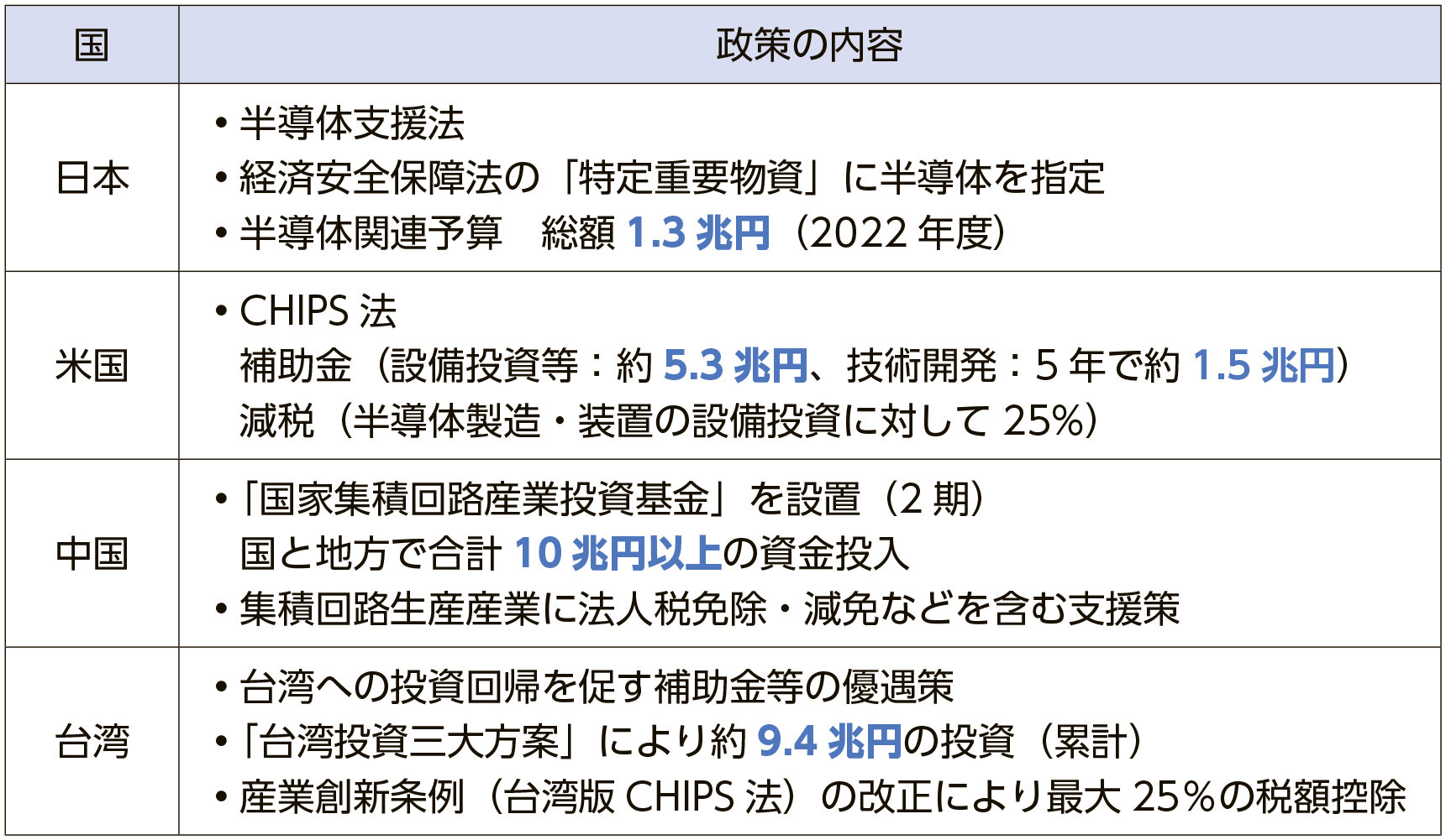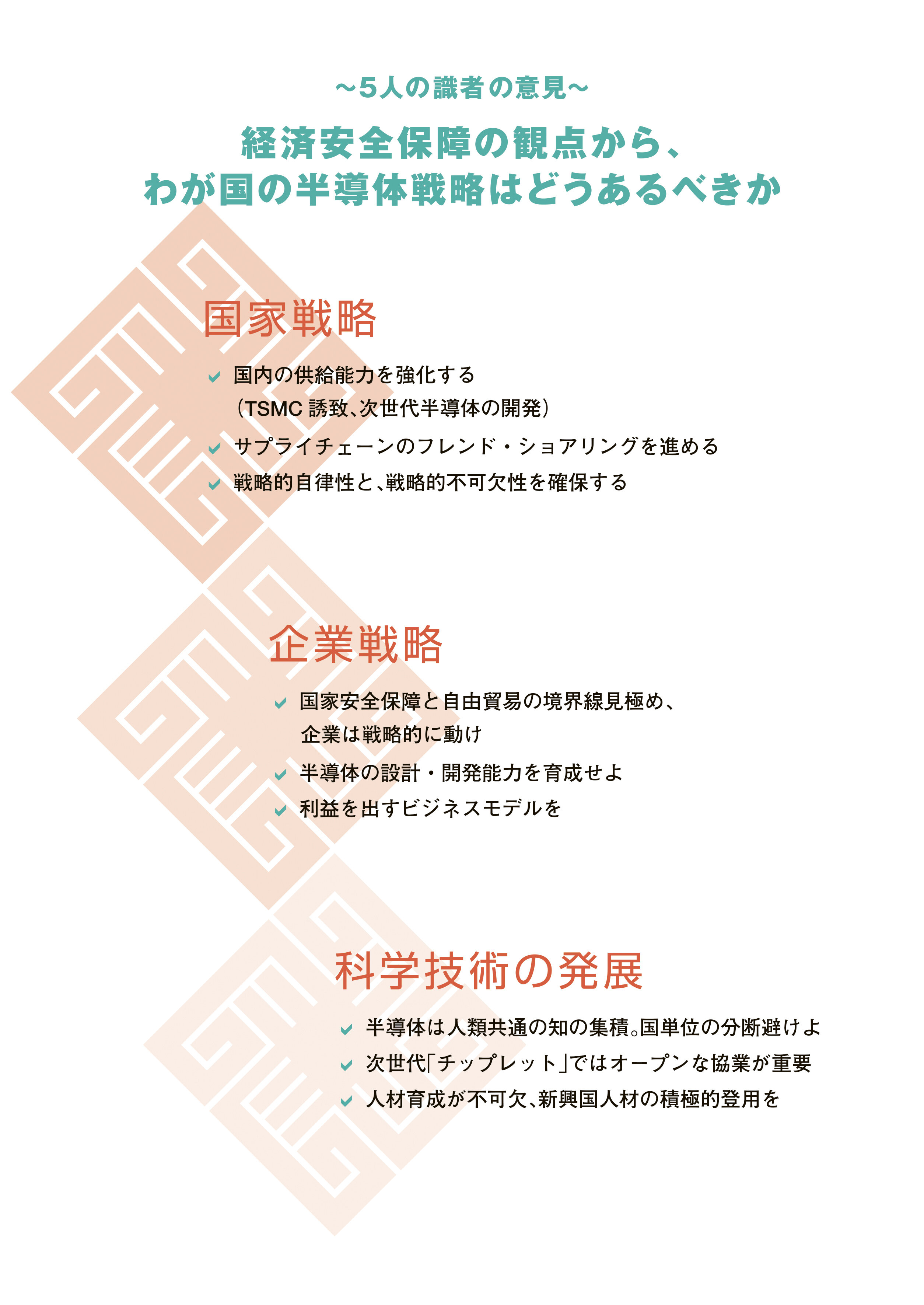 English version わたしの構想No.68 2023.12.01 半導体戦略の成否が国家の未来を決める この記事は分で読めます シェア Tweet 半導体の経済安全保障をどう確保していくか。供給体制の再編が進む中で、日本はどのように有利な立ち位置を得ていくか。わが国がとるべき半導体戦略を議論する。 PDF(日本語) PDF (ENGLISH) ABOUT THIS ISSUE企画に当たって 半導体戦略の成否が国家の未来を決める 半導体競争力の源泉は設計・開発能力にあり―大企業だけでなく、裾野の広い民間力を育成しよう 金丸恭文 NIRA総合研究開発機構会長/フューチャー株式会社代表取締役会長兼社長グループCEO 米中対立を背景に台湾有事も懸念される中、重要物資である半導体の国家戦略が問われている。経済安全保障の観点から、日本の半導体戦略はどうあるべきか。供給体制の再編が進む中で、日本は有利な立ち位置をどうつくるのか。政策当局者、実務家、ジャーナリスト、研究者など、第一線で活躍する識者に聞いた。 EXPERT OPINIONS識者に問う 経済安全保障の観点から、日本の半導体戦略はどうあるべきか。日本は、有利な立ち位置をどうつくるのか。 大野敬太郎衆議院議員 金指壽経済産業省商務情報政策局情報産業課長 藤井公雄日本シノプシス合同会社社長職務執行者 太田泰彦日本経済新聞編集委員 若林整東京工業大学科学技術創成研究院集積Green-niX+研究ユニット教授 インタビュー実施:2023年8月~2023月10月インタビュー:鈴木壮介(NIRA総研研究コーディネーター・研究員)、宇田川淑恵(同)、竹中勇貴(同) データで見る 世界の半導体生産能力の種類別内訳(2019年) 世界の半導体生産能力の国・地域別内訳(2019年) 日本の半導体関連産業の従事者数推移(1998年-2021年) 各国の半導体政策 企画に当たって 半導体戦略の成否が国家の未来を決める 半導体競争力の源泉は設計・開発能力にあり―大企業だけでなく、裾野の広い民間力を育成しよう 金丸恭文 NIRA総合研究開発機構会長/フューチャー株式会社代表取締役会長兼社長グループCEO KEYWORDS 国家戦略の方向性、半導体の設計・開発能力、裾野の広い民間力 安全保障を考えたとき、これからの世界にとって半導体、特にCPU(中央演算処理装置)やGPU(画像処理用演算装置)といったロジック半導体が極めて重要であることは論をまたない。高性能の半導体は、AI(人工知能)、EV(電気自動車)、温暖化対策、軍事など、あらゆる分野の課題解決のために必要とされている。日本の半導体戦略について、私は期待を抱いているが、同時に不安もある。国家戦略の方向性が間違っていたら、追随する民間プロジェクトも成果を挙げることはできないからだ。 ことコンピューター分野において、日本の国家戦略や大企業のプロジェクトは失敗し続けてきた。1970年代のCPU黎明期には日本企業も世界で存在感を示していたが、16ビットCPUが中心になる頃から居場所をなくしていく。国内大手メーカーはIBMの後を追い掛けて大型コンピューターに経営資源を集中し、国もそれを後押ししたが、足元ではパソコンが登場して市場が爆発的に拡大。市場拡大とともにCPU性能も急速に進化して、現在のスマホに至る。企業も国もこうした新しい技術革新と市場の変化を見誤り、投資の果実を得ることはかなわなかった。 1980年代には通商産業省(現 経済産業省)主導で「第5世代コンピューター」の国家プロジェクトが立ち上がったが、これも失敗に終わった。国家や企業の戦略がなぜ誤ってきたのか、検証して反省することなしに半導体戦略を進めても、同じ間違いを繰り返すことになる。 工場誘致だけではない、半導体で狙う日本のポジションとは 半導体分野は、設計・開発から材料、製造装置、前工程、後工程、さらにはアプリケーションまで極めて多岐にわたる。日本としてどの領域を、どう狙うのか。日本の政府や企業はどうしても大工場での大量生産を指向しがちである。半導体についても需要があるのは確実だから、熊本県に誘致したTSMC(台湾積体電路製造)の助けを借りて、先端工場を建てて戦略的生産拠点とすることが、産業の発展と安全保障に直結すると考えているのだろう。 国家戦略と半導体分野の市場の変化をどれだけ予見した上で整合性を持ったグランドデザインを描けるか。 半導体分野では米中対立が激しさを増している。米国の国防総省は軍事的優位を保持する目標のために、先端半導体製造能力を国内や友好国で持ち、自国の安全を脅かす技術を「外」に出さないようにしようとしている。その一方で、ビジネスの観点からすれば、米国と中国が重要な交易国同士であることは今後も変わらないだろうし、米国が半導体の先端技術を出し渋ることで、中国で自国技術の開発に拍車が掛かることもあり得る。国家はこうした状況を総合的に鑑みて、産業や安全保障の国家戦略と民間戦略の整合性を取らなければならない。製造工場だけに新規投資しても国際的なサプライチェーン問題は残るし、先端半導体が実現できたとしてもTSMCと競争し