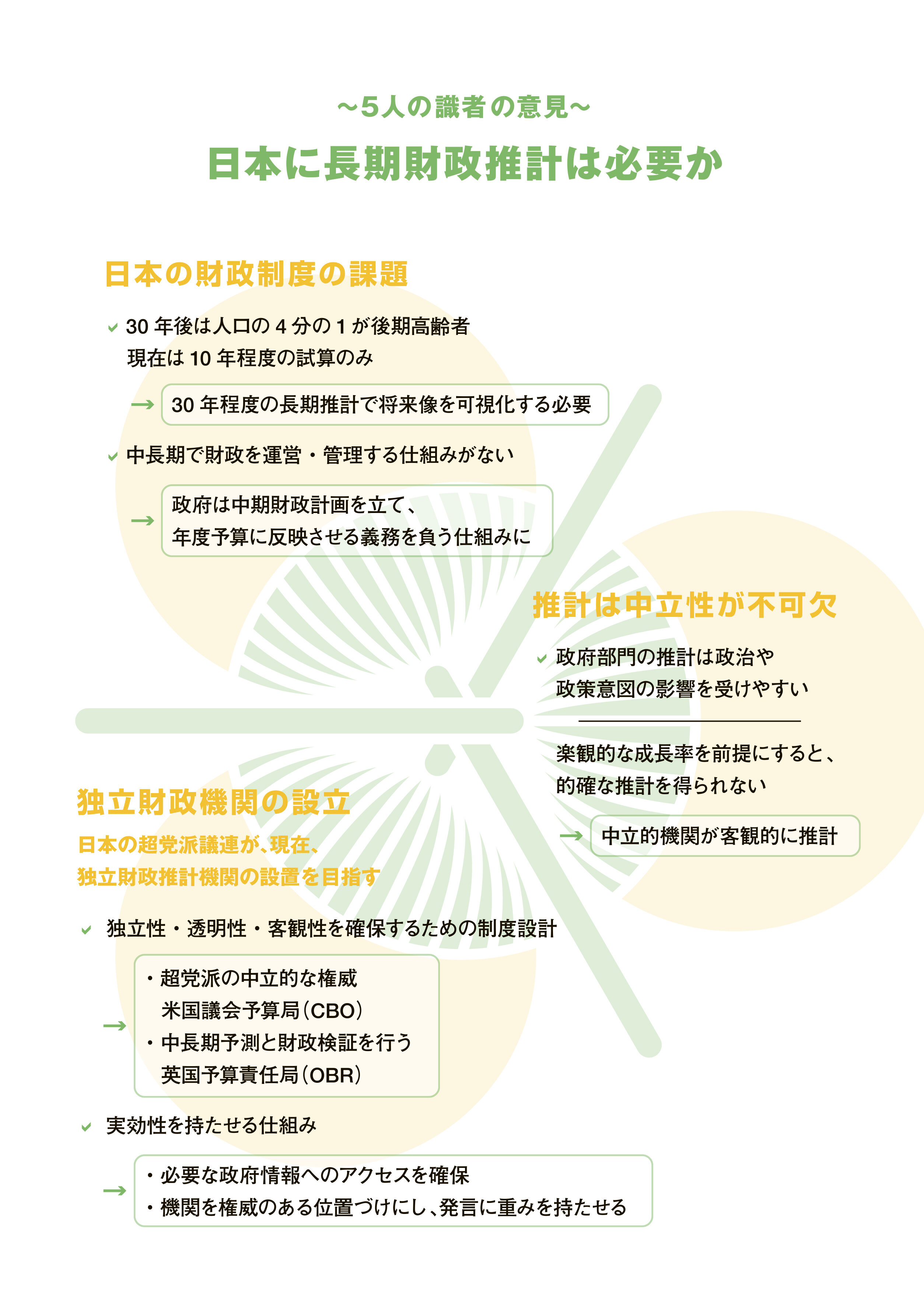 English version わたしの構想No.71 2024.04.10 財政の長期推計、適切な財政運営のために この記事は分で読めます シェア Tweet 人口の減少・高齢化が進む中、わが国の財政の長期的な見通しを共有する必要があるのではないか。長期財政推計の必要性や論点を議論する。 PDF(日本語) PDF (ENGLISH) ABOUT THIS ISSUE企画に当たって 財政の長期推計、適切な財政運営のために 将来世代に希望ある社会・経済を手渡す 翁百合 NIRA総合研究開発機構理事/日本総合研究所理事長 日本の国債残高は累増の一途をたどり、財政の長期的な持続可能性についての国民の不安も大きい。今後、人口の減少・高齢化が進む中、将来世代が安心して暮らすためには、財政の長期的な見通しを共有する必要があるのではないか。諸外国では「独立財政機関」が設置され、財政の信頼性確保に一定の役割を果たしている。日本には長期財政推計が必要か。それを財政の持続性確保に生かすにはどのような工夫が必要か。各界の専門家に聞いた。 EXPERT OPINIONS識者に問う 日本には長期財政推計が必要か。それを財政の持続性確保に生かすにはどのような工夫が必要か。 大田弘子政策研究大学院大学学長 小黒一正法政大学経済学部教授 古川禎久衆議院議員 上田健介上智大学法学部・大学院法学研究科教授 フィリップ・ジョイスメリーランド大学公共政策大学院教授 インタビュー実施:2024年2月インタビュー:関島梢恵(NIRA総研主任研究員)、ジョナサン・ウェブ(NIRA総研研究コーディネーター・研究員) データで見る 各国債務残高対GDP比の推移(1980年~2022年) 日米の人口構造(2022年) 日本の財政健全化目標の変遷 海外の独立財政機関が担っている役割 企画に当たって 財政の長期推計、適切な財政運営のために 将来世代に希望ある社会・経済を手渡す 翁百合 NIRA総合研究開発機構理事/日本総合研究所理事長 KEYWORDS 長期財政推計、財政検証、政策に生かす仕組み 2024年1月、民間人で構成される人口戦略会議が「人口ビジョン2100」を公表した。少子化・人口減少の加速は、人びと・社会のいずれにとっても、その選択の幅を狭める危機であると捉え、人口減少のスピードを緩和させて最終的に安定化させる「定常化戦略」と、小さい人口規模でも多様性に富んだ成長力のある社会を作る「強靭化戦略」を、一体で進めるべきとしている。重要なのは、高齢化・人口減少の中を生きる子どもたちの世代の生活に思いを致し、彼らが安心して生活を送れるよう、現在世代の責任として、潜在成長率を引き上げ、社会的リターンの高い歳出を行う賢い財政運営を実現することであろう。その前提として、高齢化・人口減少が加速する子どもたちの世代の経済や財政の姿を国民で共有し、さまざまな政策を考える必要があるのではないか。そうした問題意識に立ち、本号は専門家の方々に長期財政推計について見解を問い、またそれを持続可能な財政、社会保障に生かすためにはどのような工夫が必要かについて伺った。 長期推計で、人口動態の変化がもたらす財政の将来像を可視化 まず、2006~8年に経済財政政策担当大臣を務めた政策研究大学院大学・大田弘子学長は、人口動態の変化について国民全体に危機感が共有されず、中長期の財政運営管理が欧米諸国に比べて大きく出遅れていることを憂慮している。そのうえで、財政の将来像をデータで可視化し、その推計を基に「中期財政フレームによる財政運営・管理」機能の強化に取り組むべきだが、今後30年の厳しい局面の財政運営を乗り切るには、政府部門から離れて中立的に財政をみる仕組みが必要であると指摘する。また、政策評価をプログラム単位で事後的に行い、効果のない政策を継続しないことも重要としている。 法政大学の小黒一正教授は、今後長期の債務残高がどの程度膨らむリスクがあるかを定期的な長期財政推計で読み取れるようにすること、そして現在行われている財政推計の前提となる経済成長率の妥当性の検証こそ重要と指摘する。そのためには、国民に対して正しい財政推計を提供するという政治的意思決定が必要だと強調している。政府予測と実績との乖離の原因を継続的に検証する機能が求められており、成長率予測の精度改善が問われるといえるだろう。加えて、小黒教授は財政収支だけでなく、現役世代の負担となる社会保険料率の長期試算も重要と指摘している。 大田学長、小黒教授は、前述のような機能を十分に果たすには、英国や米国のように、中立的な機関が長期財政推計を実施または政府推計を検証したり、その財政運営を監視したりする仕組みを参考にすべきと指摘している。 海外はどのように財政推計・検証の仕組みを構築しているか 英国の予算責任局(OBR)に詳しい上智大学の上田健介教授は、その仕組みと機能について説明している。OBRは財務省の下に置かれており、そこで経済見通しを作成する。政府はそれを基礎に5年間の予算計画を立案し、財政公約を数値で提示する。OBRは、政府の公約