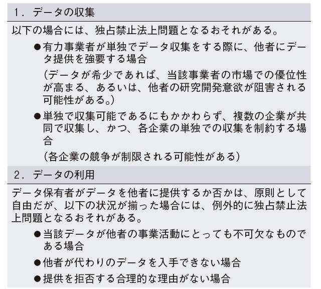 NIRAオピニオンNo.43 2019.02.28 21世紀の「資源」:ビッグデータ技術、ビジネス、法の観点から考える この記事は分で読めます シェア Tweet NIRA総合研究開発機構 DIJ(ドイツ日本研究所) 協賛 カリフォルニア大学サンディエゴ校 協賛 マックス・プランク・イノベーション・競争研究所 概要 NIRA総研はドイツ日本研究所との共催で、2018年11月1日に「ビッグデータ」ワークショップを開催。実務家や研究者、政府関係者など、多彩なポジションのスピーカーが、ビッグデータの特徴や問題点を語った。・ ビッグデータは21世紀の「資源」といわれ、20世紀に成長をけん引した石油にも比される。ビッグデータが「資源」となるために必要なものは何か。・ IoTモジュールなど最新の技術開発が先進的なサービスを可能にする一方、AIがもたらすバイアスなどの負の影響をどう考えるべきか。・ ビッグデータを活用したビジネスを開花させるために、企業や個人が安心してデータを共有、取引する仕組みは何か。企業や政府は、この課題にどう取り組んでいるのか。・ データの特性を踏まえた制度の構築、すなわち、巨大プラットフォーマーによるデータ市場の独占や、個人のプライバシー保護についての規制や制度はいかにあるべきか。 今回の議論から、新しい価値を生むための技術の構築、ビジネスを活発化させるためのデータ取引や集約の仕組みづくり、そして石油にはないデータの特性を踏まえた制度の整備に早急に取り組む必要があることが浮き彫りとなった*。 PDFで読む INDEX はじめに 1.ビッグデータ活用の最前線 ビッグデータとは何か IoTモジュールでデバイス同士がつながる世界 紙文化の根強い法務分野でも、ビッグデータ活用が進む データドリブン時代の企業ガバナンスのあり方 効率的、かつ信頼できる取引市場がデータ活用を促進 効率的な市場に必要な3つの条件 2.ビッグデータ分析の現状と課題 位相幾何学の手法でビッグデータを可視化する 「倫理」の欠如は、訴訟リスクを高める 金融業界で懸念されるアルゴリズムのブラックボックス化 3.政府の取り組み 企業が安心してデータを共有できる契約ガイドライン 企業の個人データ利活用を後押しする「情報銀行」 GDPRとビッグデータ活用 データの規制を考える 大企業と中小企業のデジタルデバイド解消に向けた取り組み 4.「資源」の特性を理解せよ ビッグデータを巡る規制や制度はどうあるべきか 独占禁止法の観点からビッグデータを考える おわりに はじめに 「ビッグデータは21世紀の石油」といった表現がメディアに頻出するようになってきた。デジタル化社会が急速に進展し、ありとあらゆるところで膨大なデータが日々生み出され、すでに世界はデータによって駆動されている。世界の時価総額ランキング上位の常連となった、GAFA(注1)を始めとする米国のIT企業群は、何らかの形でデータをビジネスに活用し圧倒的な価値を生み出している。 安価に入手でき、エネルギー密度の高い石油は、輸送、発電、製造など社会のあらゆる分野で活用され、20世紀以降の飛躍的な経済的成長の礎となった。21世紀のビッグデータもまた、それに勝るとも劣らぬ重大なインパクトと変化を世界に与える可能性がある。もちろん、石油とデータでは同じ資源といっても特性が大きく異なる。ビッグデータが社会の基盤となるなか、われわれは、ビッグデータにどう向き合うべきか。データの持つ特性を十分に理解し、経済・社会的利益に資する仕組みをつくるための知見が、喫緊に求められている。 2018年11月1日、NIRAとDIJ(ドイツ日本研究所)の共催で、「ビッグデータ」ワークショップが開催された。本イベントには、ビッグデータを用いたビジネスを展開するビジネスパーソンから研究者、政策関係者まで、国内外の多彩な分野のスピーカーが登壇。3人のモデレータによる進行のもと、ビッグデータのユースケースから、日本のポジショニング、政府の役割まで、幅広いトピックについて活発な議論が行われた。ビッグデータの「いま」をお届けする。 1.ビッグデータ活用の最前線 ビッグデータとは何か ビッグデータの重要性は社会的に認識されるようになったが、統一的な定義があるわけではない。「ビッグデータ」という用語は多義的であり、データ量が大きいという意味以上の特徴を含んでいる。Chen et al.(2014)(注2)によると、ビッグデータの概念が生まれた2000年初期はVolume(量)、Velocity(速度)、Variety(多様性)が大きいことから、3Vsの特徴を持つデータとして認識されていた。しかし、近年は3VsにValue(価値)を加えた4Vsとして広く認識されるようになり、膨大で、多様な様相をし、急速に生み出されるデータから、いかに価値を見いだすかということへの関心が高まっている。 楽天株式会社CDOの北川拓也氏も、ビッグデータ活用は「隠れた価値を見いだすこと」だという。北川氏は有望なビッグデータの活用例として、「企業価値の推定」、「与信の査定」、「ユーザーの関心」の3つ