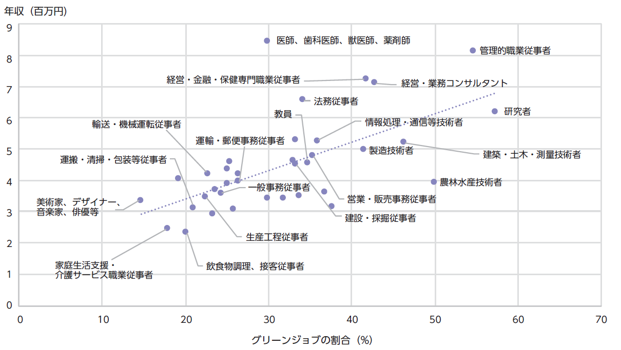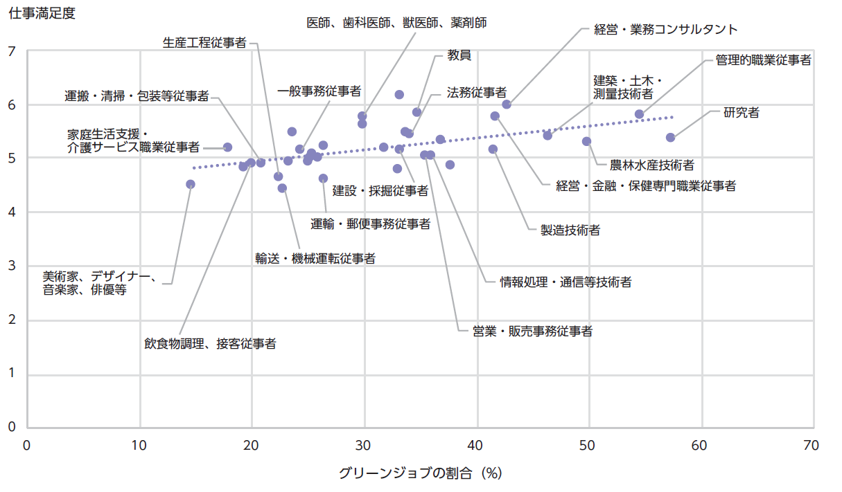NIRAオピニオンNo.73 2023.10.24 脱炭素社会実現に向けたグリーンジョブの推進就業者実態調査から見る現状と課題 この記事は分で読めます シェア Tweet 大久保敏弘 NIRA総合研究開発機構上席研究員/慶應義塾大学経済学部教授 概要 先進各国では地球温暖化・気候変動への対策が活発化しており、カーボンニュートラル、脱炭素社会実現への対策を講じている。多くの諸外国はグリーン産業への投資、税制優遇措置等を通じてグリーン経済の拡大を目指すが、同時に、グリーンジョブのスキルを持った労働者の育成にも取り組んでいる。日本も、従来型の「マクロ政策としての公共投資」だけでなく、「ミクロ政策としての人への投資」を進めることで、環境と働き方の好循環を起こす必要がある。 就業者実態調査の結果からは、日本の就業者の31%がグリーンジョブをしていることがわかった。また、グリーンジョブに従事している就業者の労働時間に占めるグリーンジョブの時間は25%であった。グリーンジョブへの就業者割合が高い欧州の国と比べると、日本の同割合は低く、伸びしろは大きい。グリーンジョブは賃金が高く、働く人の満足度も高くはあるが、グリーンジョブに求められるスキルは高度である。 グリーンジョブを推進するためには、グリーンジョブに求められる訓練メニューを明らかにし、グリーンジョブへの転換を希望する就業者が、適切な訓練を受け、必要なスキルを修得する支援が不可欠だ。政府には、就業者にリスキルの機会とインセンティブを与えることが求められる*。 PDFで読む INDEX 1.日本におけるカーボンニュートラル、脱炭素社会実現の動き 2.「人への政策」の必要性 3.グリーンジョブの実態調査 ①グリーンジョブの割合 ②グリーンジョブへの労働時間の割合 ③職種別グリーンジョブ 4.グリーンジョブを行っている人の賃金や仕事満足度は高いのか? 5.どのようにしてグリーンジョブを増やしていくのか?「人への政策」の推進 1.日本におけるカーボンニュートラル、脱炭素社会実現の動き 2015年に採択されたパリ協定を受けて、各国では地球温暖化・気候変動への対策が活発化している。代表的なものが、温室効果ガス削減のためのカーボンニュートラルの推進・脱炭素社会の実現である。 こうした状況において、日本の取り組みは世界的に注目されている。これは、日本が過去の高度成長期における公害問題やオイルショックを経験したことで、巧みな環境規制や政策を行うようになり、その結果、企業が高度な環境技術や省エネ技術を持つに至ったからだ。 だが、近年のデジタル経済の拡大に伴い、日本では電力消費が増加している。特に、東日本大震災後は化石燃料を主体とした発電が中心となり、それが温室効果ガス排出量の大幅な増加につながっている。また、環境対策は、省エネや温室効果ガスの排出削減だけではない。リサイクル、生物多様性、生態系保全、エシカル消費など、多岐にわたる分野があり、日本が取り組まなければならない課題は数多い。 2020年10月、菅義偉政権(当時)は「2050年カーボンニュートラル」を掲げ、脱炭素社会を実現するための具体的なグリーン成長戦略を提示した。「環境と経済の好循環」のための新しい産業政策として、洋上風力・太陽光・地熱や水素、原子力、食料・農林水産業、半導体・情報通信、住宅、物流、自動車・蓄電池、船舶、航空機など14の重点分野を中心に補助金、税制改革、規制改革などの施策が進められる予定である。省エネを徹底し、水素や洋上発電などの再生可能エネルギーを拡充するとともに、次世代型太陽電池やカーボンリサイクルの分野でイノベーションを起こすことを目指す。さらに、環境投資のための金融市場の整備も進められるという。 この戦略に応じた多くの自治体は2050年二酸化炭素排出実質ゼロを表明、多くの大企業もカーボンニュートラル宣言をするなど、環境対策への機運が高まっている。 一方、EUや英国、米国も、2050年に向けたカーボンニュートラルを宣言し、環境政策を進めている。政策目標や方向性は日本と同じだが、具体的な戦略や取り組みは各国の実情に合わせて異なっている。 例えば、EUは「欧州グリーンディール投資計画(EGD)」を定め、2030年までの温室効果ガス排出を1990年比で55%削減する目標を掲げている。この実現に向けた資金として1兆ユーロの投資の動員を目指す。また、英国は2021年に「ネットゼロ戦略」を策定。10分野について重点的な投資を行うことで、2030年までに900億ポンドのグリーン投資の誘発、イノベーションの促進、雇用創出44万人、温室効果ガス累計1.8億トン削減を目指す。EUや英国の戦略は、炭素排出量の大きい産業から転出する労働者のリスキリングを政府が支援して、円滑な労働移動を後押しするというもの。例えば、英国では雇用創出目標を設定している。その戦略は日本と概ね似ているが、「グリーンジョブ」の創出と推進を掲げており、日本の戦略とはやや異なる