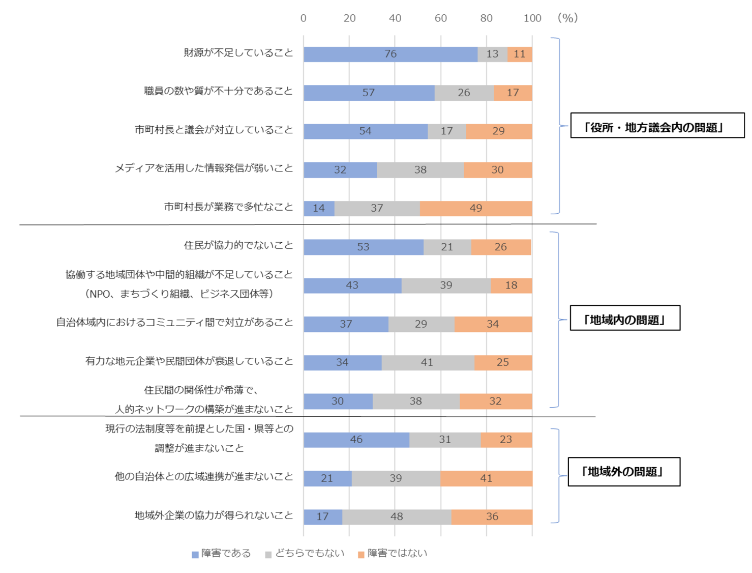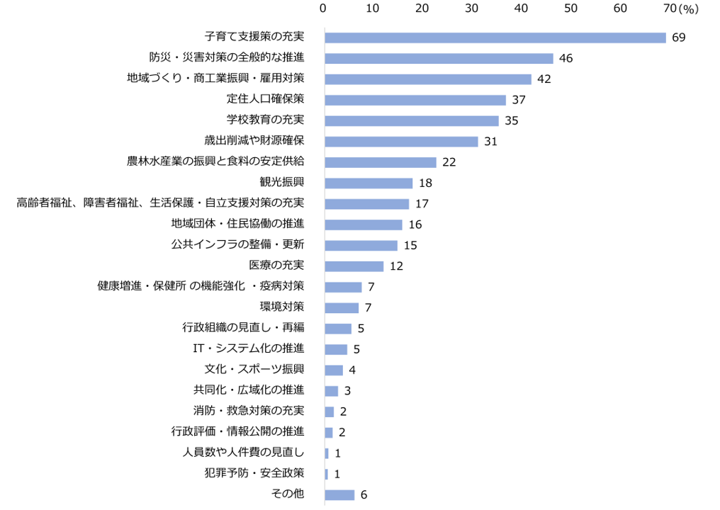 English version 研究報告書 2022.01.14 人口減少社会に挑む市町村長の実像と求められるリーダーシップ (第1部)全国市町村長アンケート調査結果を中心に この記事は分で読めます シェア Tweet 大久保敏弘 慶應義塾大学経済学部教授/NIRA総合研究開発機構上席研究員 辻琢也 一橋大学大学院法学研究科教授/NIRA総合研究開発機構上席研究員 中川雅之 日本大学経済学部教授/NIRA総合研究開発機機構上席研究員 概要 超高齢化や人口減少など、様々な要因がまちづくりのあり方に政策転換を迫っている。そのような中、地域における改革を成功させるキーマンは市町村長だ。そこで、全国市長村長(注1)を対象に、「政策意識とリーダーシップ」に関するアンケートを実施した。 第1部では市町村長に実施したアンケート結果に基づいて、市町村長の平均的な姿を描き出した。市町村長の約7割が「子育て支援策の充実」を重視しており、超高齢化や人口減少に「抗する」拡大志向の政策に関して自身の政治判断を強調する傾向にある。 また、「一般人よりはやや社交的で、リスクを厭わない普通の人間」であり、組織としての意思形成に努めるという「地味で実直な姿」が浮かび上がった。しかし、周囲を鼓舞しながら現実を変革していく「鼓舞型かつ変革型」のリーダーシップを発揮する市町村長は1%程度に過ぎず、市町村長のリスクを厭わないパーソナリティが、現場では必ずしも生かされていない。 サマリーを読む 全文を読む 第1部を読む 第2部を読む Press Briefing Paper INDEX はじめに 本研究の背景・目的・方法 第1章 アンケート調査概要 自治体の属性 市町村長の属性 自治体の特徴 第2章 重視する政策課題 重要度の高い政策を人口規模別にみると 第3章 行政ルールVS政治判断 政治判断の必要性の違い 政治判断の認識の違いはなぜ生じるのか 第4章 組織運営の方針 リーダーシップを支える組織運営とは 組織運営の考え方を人口規模別にみると 組織運営方針の違いを生み出している要因 リスク選考度が高く、比較的年齢層の若い市町村長がカテゴリー1に該当 組織運営の考え方と政治判断 第5章 改革の障害要因 役所・地方議会内の問題が深刻化 障害をどう乗り越えるのか 危機時におけるリーダーシップ発揮の障害 第6章 市町村長のパーソナリティ 市町村長のパーソナリティ 都市と地方で、市町村長のパーソナリティはどう違うのか 市町村長のパーソナリティによって重視される政策は違うのか 第7章 市町村長のリーダーシップの類型化 ジョセフ・S・ナイによる米国合衆国歴代大統領の類型 日本の市町村長のタイプ分け 図表図表1-1 アンケートの回収状況図表1-2 回答した自治体と全国の人口規模別構成比図表1-3 人口規模別、全国と回答自治体の総人口比較図表1-4 市町村長の当選回数別の割合図表1-5 市町村長の年齢別分布図表1-6 回答自治体と全国の自治体のクラスター別の自治体比率図表2-1 アンケート調査で提示した施策図表2-2 重視してきた政策(第1~4順位の合計)図表2-3 重視してきた政策と回答した市町村長の割合(優先順位別)図表2-4 人口規模別、重視してきた政策(第1~4順位の合計)図表2-5 行財政改革を重要とする市長の割合 ―5~20万人の自治体を財政状況別にみる―図表3-1 市町村長による政治判断の必要性図表3-2 「行政ルール(A)」と「政治判断(B)」についての考え方図表3-3 問3の優先順位別にみた、市町村長による政治判断の必要性図表3-4 政策分野ごとの政治判断の必要性に関する全政策平均(各順位)との差異図表3-5 「定住人口確保策」を重要施策とした市町村数図表3-6 「農林水産業の振興等」を重要施策とした市町村図表3-7 実証分析に用いた変数の記述統計図表3-8 政治判断の必要性に関する実証分析結果図表4-1 組織運営のあり方図表4-2 組織運営をする上での考え方図表4-3 人口規模別、「意思決定の内容」についての考え方図表4-4 人口規模別、「意思決定の期限」についての考え方図表4-5 カテゴリー分類図表4-6 カテゴリー1とカテゴリー2の市町村の属性の相違図表4-7 組織運営方針による市町村の差異図表5-1 アンケート13項目の3つの区分図表5-2 改革を進める上での障害図表5-3 都市規模でみた障害に関する回答の平均件数図表5-4 人口規模別、「財源が不足していること」についての市町村長の回答割合図表5-5 人口規模別、「職員の数や質が不十分であること」についての市町村長の回答割合図表5-6 人口規模別、「市町村長と議会が対立していること」についての市町村長の回答割合図表5-7 人口規模別、「住民が協力的でないこと」についての市町村長の回答割合図表5-8 人口規模別、「現行の法制度等を前提とした国・県等との調整が進まないこと」についての市長村長の回答割合図表5-9 緊急時における10個の課図表6-1 質問した16項目図表6-2 一般人と市町村長の性格(平均)図表6-3 一般人と市町村長の性格(分布)図表6-4 一般人と市町村長のリスク選好度図表6-5 市長と町村長の特徴図表6-6 コロナ禍前の政策選択と市町村長の特徴(市区)図表7-1 タ