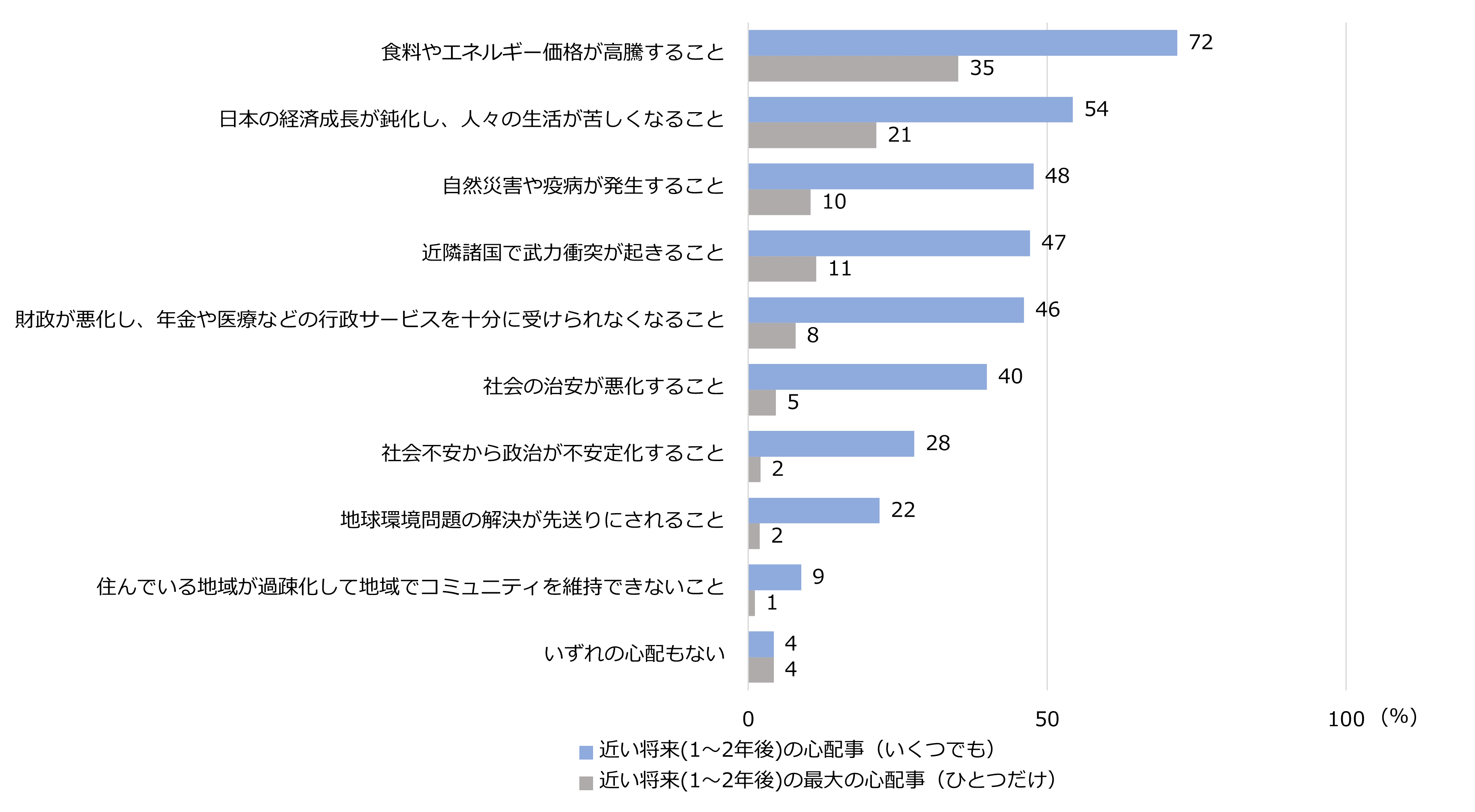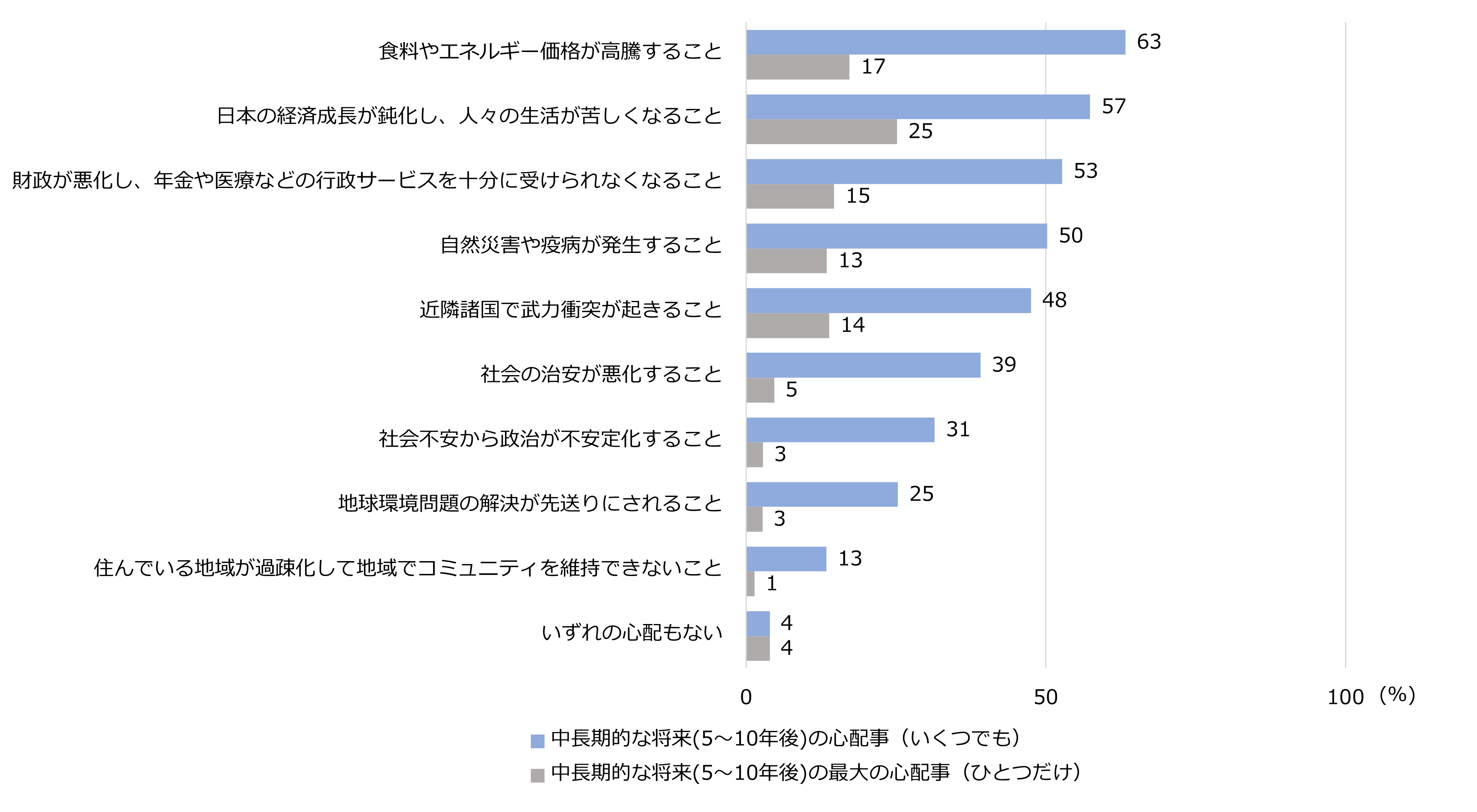 English version 研究報告書 2023.04.28 第1回政治・経済・社会に関する意識調査(NIRA基本調査)(速報) この記事は分で読めます シェア Tweet NIRA総合研究開発機構 最新の調査結果はこちら➡「第2回政治・経済・社会に関する意識調査」 概要 (公財)NIRA総合研究開発機構では、「第1回政治・経済・社会に関する意識調査(NIRA基本調査)」を実施した。本調査は政治・経済・社会に関連する人々の意識を定点観測することを目的としている。 調査は2023年3月16日(木)~2023年3月20日(月)にかけてオンラインで行われた。回収数は2,000件であり、うち有効回答数(トラップ設問をクリアした人)は1,805件だった(注1)。以下の速報結果は、トラップ設問をクリアした人のみを対象とし、「国勢調査(2020年)」の18歳以上の日本人を母集団とみなして、ウェイトによる補正を行った集計結果である(注2)。 速報を読む(2023年4月28日公表) 調査票・単純集計結果を読む PDF (English) INDEX Ⅰ 調査結果 1.政治分野 1.1. 長期的党派性と投票予定政党 1.2. 諸外国への親近感 1.3. 組織などへの信頼度と理由 1.4. 政治的有効性感覚・ポピュリズム態度 2.経済分野 2.1. 世帯の家計状況の変化 2.2. 世帯の家計状況、日本の経済状況の見通し 2.3. 個人の将来の心配事 2.4. 社会の将来の心配事 2.5. デジタル化や技術革新の影響に関する認識 2.6. 生活時間 2.7. 地域、ボランティア、副業、SDGs、グリーン・ジョブに関する活動状況 2.8. 環境に配慮した活動 3.社会分野 3.1. 社会に対する考え方 3.2. 公的サービスに対する考え方 3.3. 人々の社会意識 Ⅱ 調査概要 1.調査の趣旨・目的 2.調査名 3.主な調査項目 4.調査期間 5.調査方法 6.回収数 7.本報告書の集計方法 8.回答者の属性 9.研究体制 ポイント●組織などへの信頼に関して、「家族」、「自衛隊」、「裁判所」、「警察」、「お住まいの市町村」は70%以上の人が信頼している一方、「国会」、「政府」、「SNS(ツイッター・インスタグラムなど)」、「インターネットメディア(ニュースアプリ・サイトやブログなど)」は60%以上の人が信頼していないことがわかった。●「自分は、政治に関心がある方である」に肯定的な回答は50%を下回る一方、「現在の政党は既得権益にとらわれており、より直接的に人々の意思を代表するリーダーが現れてほしい」、「たいていの政治家が気にしているのは、裕福で力のある人々の利益である」に肯定的な回答は70%を上回った。●日本の経済状況の見通しについて、悲観視する人が多く、「暗い」または「どちらかといえば暗い」と回答した人は、近い将来(1~2年後)でも中長期的な将来(5~10年後)でも80%以上となった。●社会の将来の心配事として、近い将来でも中長期的な将来でも、「食料やエネルギー価格の高騰」、「経済成長の鈍化による生活苦」、「自然災害や疫病の発生」、「近隣諸国での武力衝突」、「財政悪化で行政サービスを受けられなくなること」をあげる人が多かった。●直近の「通常の1週間」の学習・自己啓発・訓練の時間はゼロの人の割合が最も高く、多くの人が自己研鑽に時間を投資できていないことがわかった。また、テレワーク利用者ほど自己研鑽の時間を確保できていることがわかった。●国債発行は抑制するべきと考える人の割合は、財政赤字を心配する必要はないと考える人の割合を上回った。また、「個人所得税を引き上げるときには、高所得者の税率を引き上げるべき」と考えている人の割合は60%を超えた。●「チャンスがあれば転職する方がよい」と回答した人の割合は、同じ企業に長く務める方がよい」と回答した人の割合を大きく上回った。特に若年層ほどこの傾向がみられた。●公的サービスの水準向上のための追加負担の意思を聞いたところ、64%の人が支払う意思があることがわかった。その項目として回答が多かったのは、「医療サービス」、「緊急時・災害時の支援」、「子育て支援」、「年金制度」だった。一方、回答が少なかったのは、「防衛」、「生活支援」であり、最も低いのは「雇用支援」だった。●国や自治体の支出について、現在のサービス水準を維持したまま、無駄をなくすことで最も支出を減らせると考えられている費用は「行政の人件費」であった。また、どの費用も1~2割程度無駄があると考えている人が最も多かった。 図表図1-1-1 長期的党派性図1-1-2 年齢階層別にみた長期的党派性図1-1-3 投票傾向―長期的党派性と今後の比較-図1-2 諸外国への親近感図1-3 組織などへの信頼度図1-4-1 政治的有効性感覚・ポピュリズム態度図1-4-2 年齢階層別・投票別にみた政治的疎外意識図2-1-1 世帯の家計状況の変化図2-1-2 男女別、年齢階層別にみた世帯の家計状況の変化(新型コロナウイルスの感染拡大前との比較)図2-1-3 世帯所得別にみた世帯の家計状況の変化(新型コロナウイルスの感染拡大前との比較)図2-2-1 世帯の家計状況の見通し図2-2-2 日本の経済状況の見通し図2-2-3 男女別、年齢階層別にみた中長期(5~10年後)の日本の経済状況の見通し図2-2-4 世帯所得別にみた中