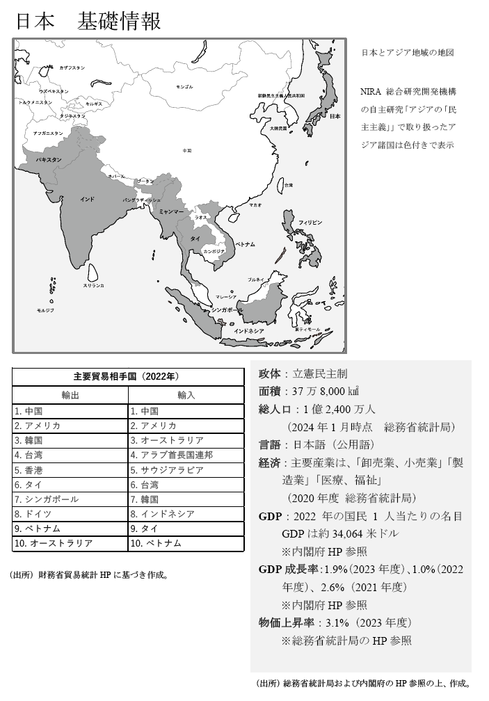 研究報告書 2024.08.20 アジアの「民主主義」序論欧亜比較の観点から この記事は分で読めます シェア Tweet 水島治郎 千葉大学大学院社会科学研究院教授/NIRA総研上席研究員 概要 近年、アジアを含む世界各国で「民主主義のゆらぎ」が指摘されている。日本はアジア諸国と軍事を含む様々な連携を強めており、どのようなかたちで「民主主義」が各国の外交・安全保障政策に反映しているのかを知ることは、日本の今後を考えるうえで、喫緊の課題となっている。 本章では、アジア諸国の動向を確認するにあたり、ヨーロッパ政治との比較の観点からアジア諸国の「民主主義」を論じる。まず1つ目に、「既存の政治秩序の溶解」が挙げられる。例えばインドでは、農村エリートの支持を受けたインド国民会議派が下野し、後進カーストの支持を受けたヒンドゥー教徒の幅広い支持を受けたインド人民党が拡大したことで、既成政党の弱体化、既存の政治秩序の崩壊が生じている。2つ目は、「ポピュリズム政治の拡大」である。従来描かれてきた既成政党とポピュリズムの「右」か「左」かという対抗関係以上に、「上」か「下」かという対立がより強い影響をもたらしている。例えばタイでは、「上からの支配」を前提としたタイ式民主主義が批判を浴び、市民主体の民主的な政治を望む声が、新興勢力である前進党の躍進へとつながっている。そして3つ目は、「宗教の政治的役割」である。人々にとってアイデンティティーの拠り所となる宗教は、政治的社会化に重要な役割を果たしてきたが、その一方で、宗教が排外主義の軸となっている面もある。例えば、仏教徒が多数派を占めるミャンマーでは、イスラーム教徒のロヒンギャが国籍を有さない「外部者」という不安定な立場に置かれたのち、軍や民間人による暴力の対象となり、大規模な難民問題に発展した。 これら3つは、アジアとヨーロッパの共通項が見いだせるポイントである。アジアという「一大成長センター」における政治的に不安定要因は、国際的なインパクトを与える。そのアジアとどのように関わり、民主主義をどう共鳴させ、展開していくのかが、日本の未来のカギとなる。アジアの「民主主義」・序論―欧亜比較の観点から―・第1章インド―権威主義革命と「世界最大の民主主義国」の行方―・第2章シンガポール―シンガポール政治の変容と将来:緩やかに進む民主化への道―・第3章パキスタン―ポピュリスト政党後の政党連合政権、軍部の影響力―・第4章フィリピン―グローバル化とフィリピンの政治変動―・第5章タイ―タイの今とこれから―・第6章インドネシア―インドネシアの今とこれから―・第7章ミャンマー―ミャンマー危機とアジアの民主主義― PDFで読む INDEX 1.はじめに 2.本プロジェクトにおける問題意識 ①アジアの「民主主義」の特徴は何か ②国内政治社会の分断(の有無)と国民統合について ③近年の選挙の動向 ④各国における対外関係、とりわけ日本、中国、アメリカとの関係についての視点 3.20世紀型秩序の融解 4.ポピュリズム政治の拡大 5.宗教と民主主義 6.おわりに 日本 基礎情報 1.はじめに 近年、アジア諸国の政治経済的な存在感は高まるばかりである。2023年、インドが人口で世界第1位になったことは国際的に広く報じられたが、GDPでも2050年に中国・アメリカに次いで、インドとインドネシアが3位、4位になると予測されている。2014年にモーディーがインドの首相に就任した時点で、インドのGDPは世界で10位に過ぎなかったことを思い起こすと、その急速な経済成長は驚くばかりである。そして2075年には、GDP上位10カ国のうち半数以上の国を、アジアを中心とするグローバルサウスの諸国が占めるとみられている。 安全保障の点からもアジア諸国の重要性は高まり、日本にとっても重要な連携パートナーとして欠かせない存在となっている。それを象徴するのが近年の、「日米豪印(QUAD)」や「日米フィリピン」「日米韓」といった、アジア諸国との横のつながりを軸とする多国間の防衛協力関係の構築だろう。かつて日本の安全保障を語る場合、それは日米安保とほとんど同義という状況があったが、今は様変わりした。アメリカとアジアの特定の同盟国の二国間の防衛協力を柱とする時代から、同盟国相互が横に連携を進め、相互に補完しあう時代へと移行しつつある。 実際2024年5月、シンガポールでアジア欧米の国防相らが集まったアジア安全保障会議(いわゆるシャングリラ・ダイアローグ)において、アメリカのオースティン国務長官は、かつてのアメリカ中心の二国間同盟から、複数の国が同盟協力を強める「結集」への移行を訴えた。この転換の背景に、アメリカの国際舞台における存在感の弱体化、中国の軍事的拡大などがあることは確かだが、何といっても地域秩序の担い手としてのアジア諸国の存在感の高まりがあることはまちがいない(「「車輪」から「格子状」へ 米の思惑は?」2024年6月23日『朝日新聞』朝刊、東